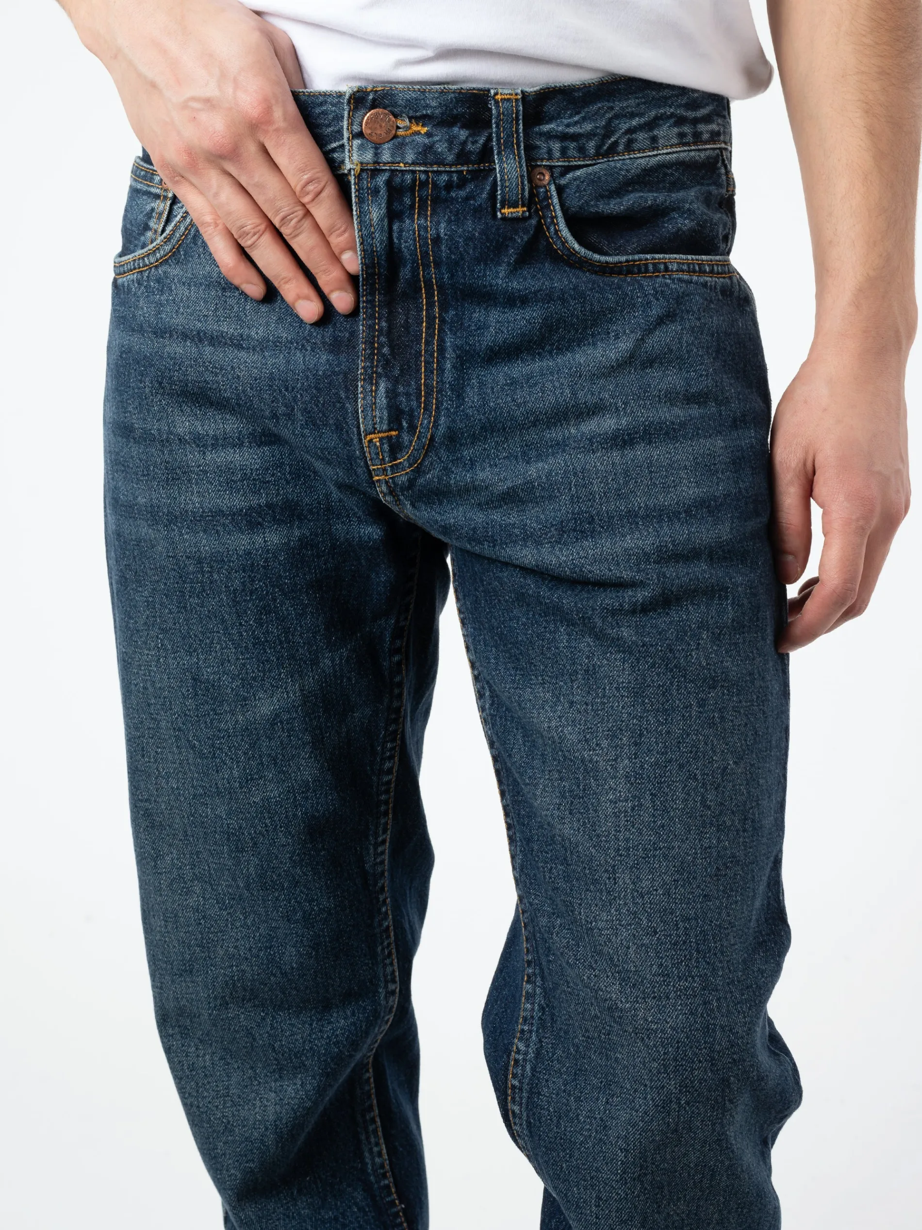 Regular fit jeans with a straight leg made in a dark blue wash with subtle wear. These jeans are made from a rigid 14.9 oz denim. Gritty Jackson has well-balanced legroom that gives the fit a neat silhouette while also offering great comfort.