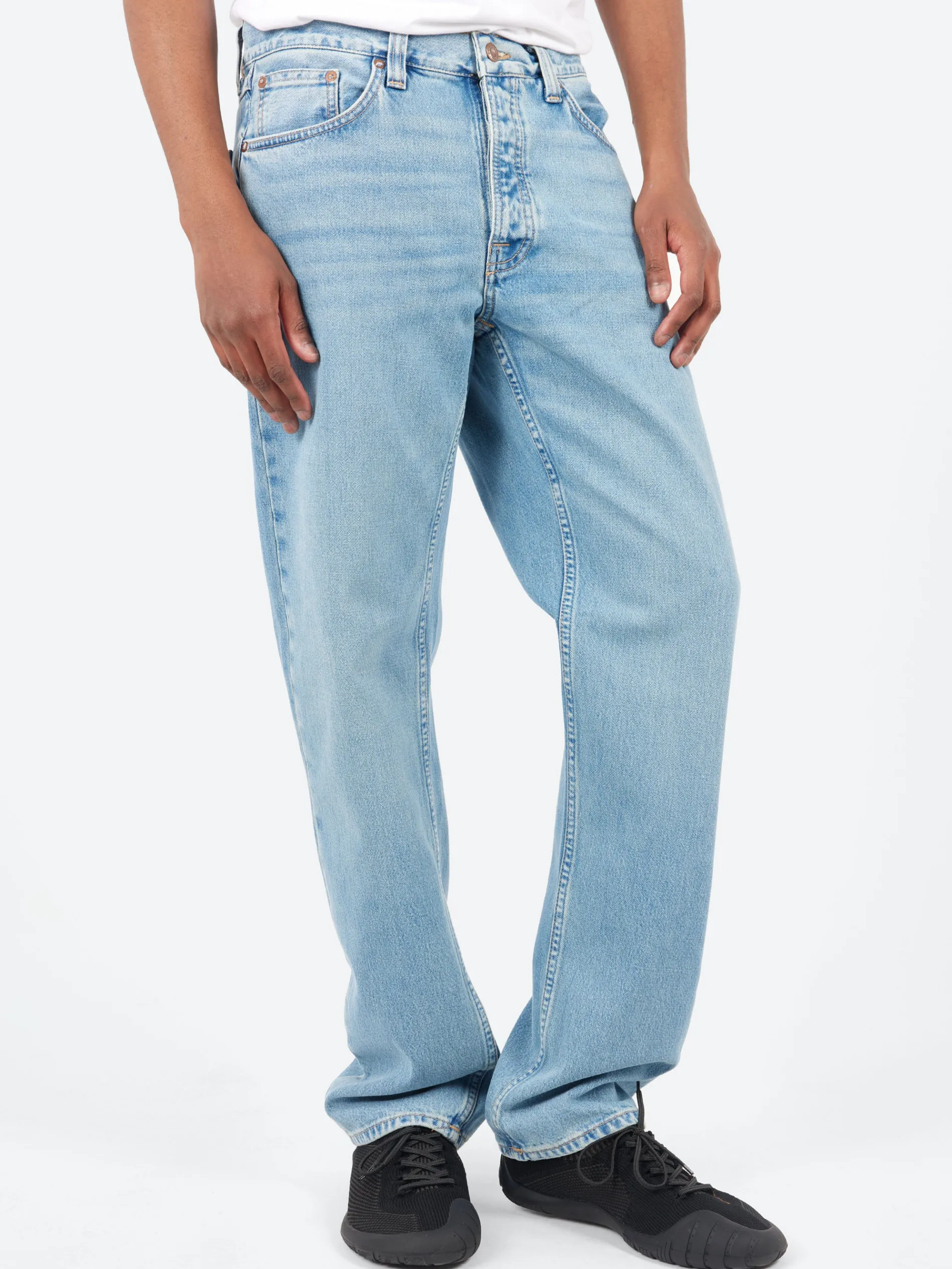 A high-waist regular-fit jean with a straight leg, crafted from wonderfully bright washed broken twill denim. Washed to vibrant shades of indigo with a warm tint, these jeans have achieved an authentic vintage appearance with intricate detailing, showcasing denim washing craftsmanship with finesse.