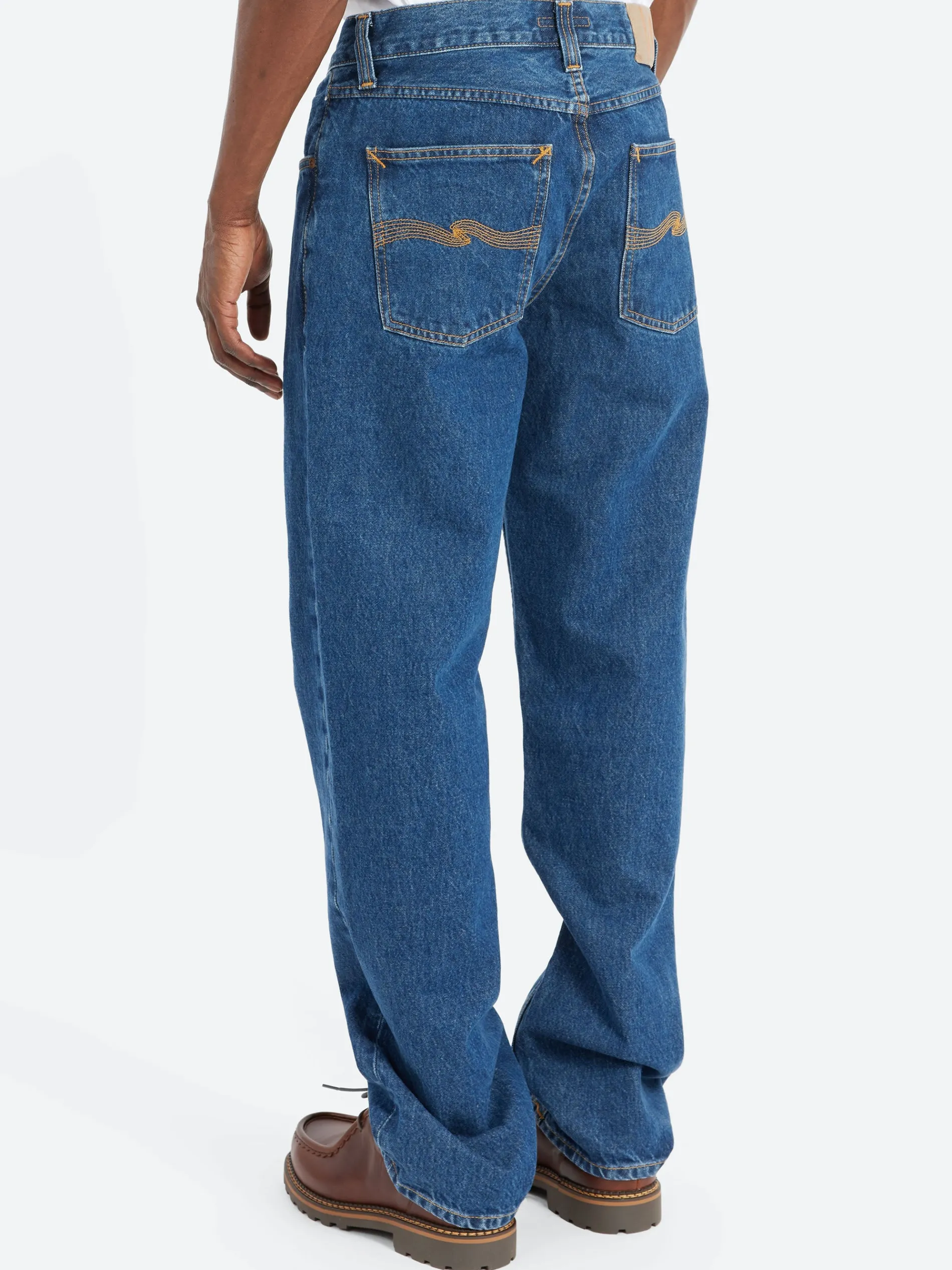 Nudie Jeans high-waist regular fit with a straight leg in a soft, dark blue stonewash. The wash displays a wonderful blend of textures and muted dark indigo hues. Seams provide a highlighting detail, and a subtle marbling texture adds depth and further detail, giving this plain stonewash the authentic, deep indigo stonewashed look of the ’00s.