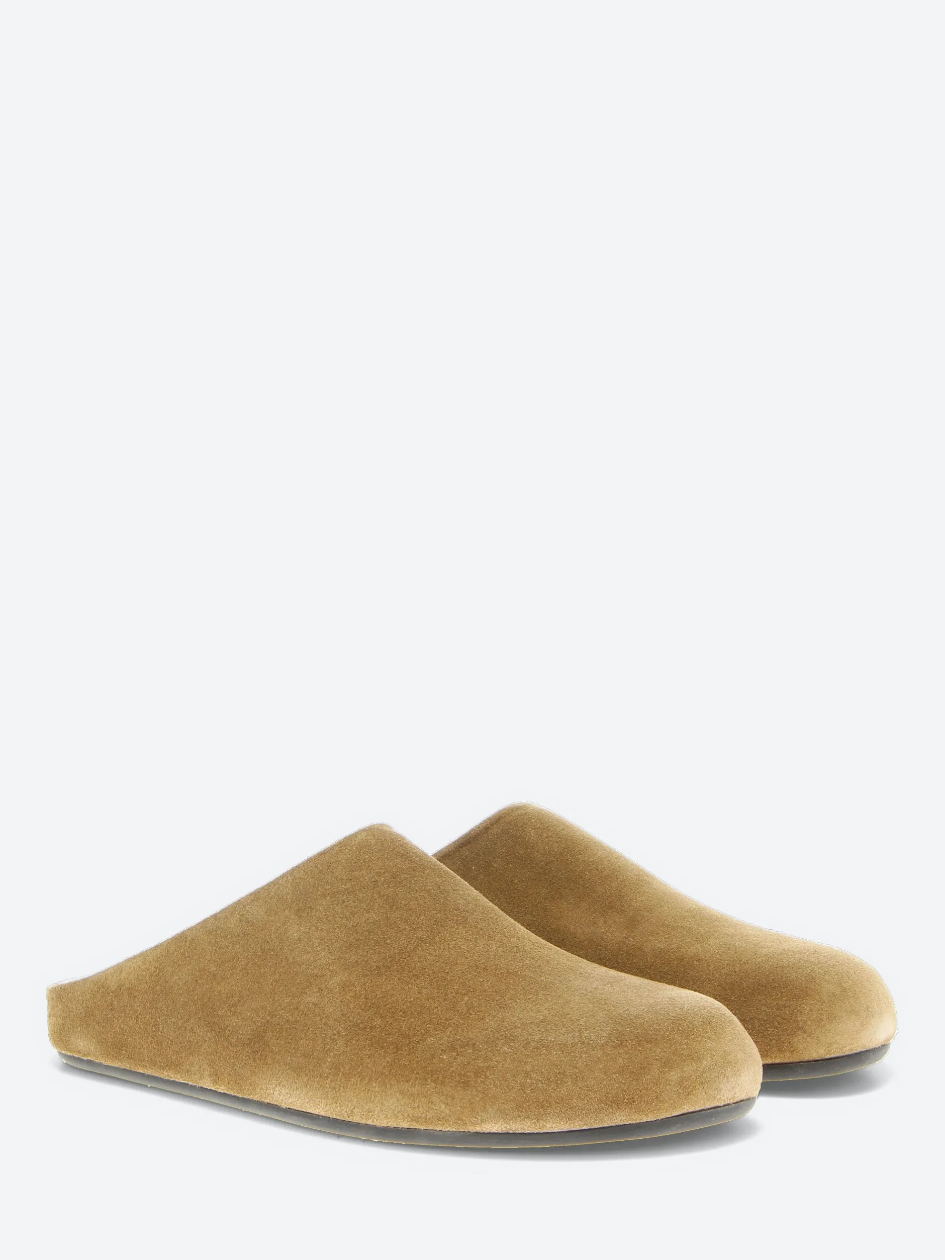 Handcrafted in Italy, the Babouche 001 sandals exemplify minimalist elegance with a sleek, single-piece construction. The encased design in supple suede wraps seamlessly around the foot, complemented by a rubber sole.