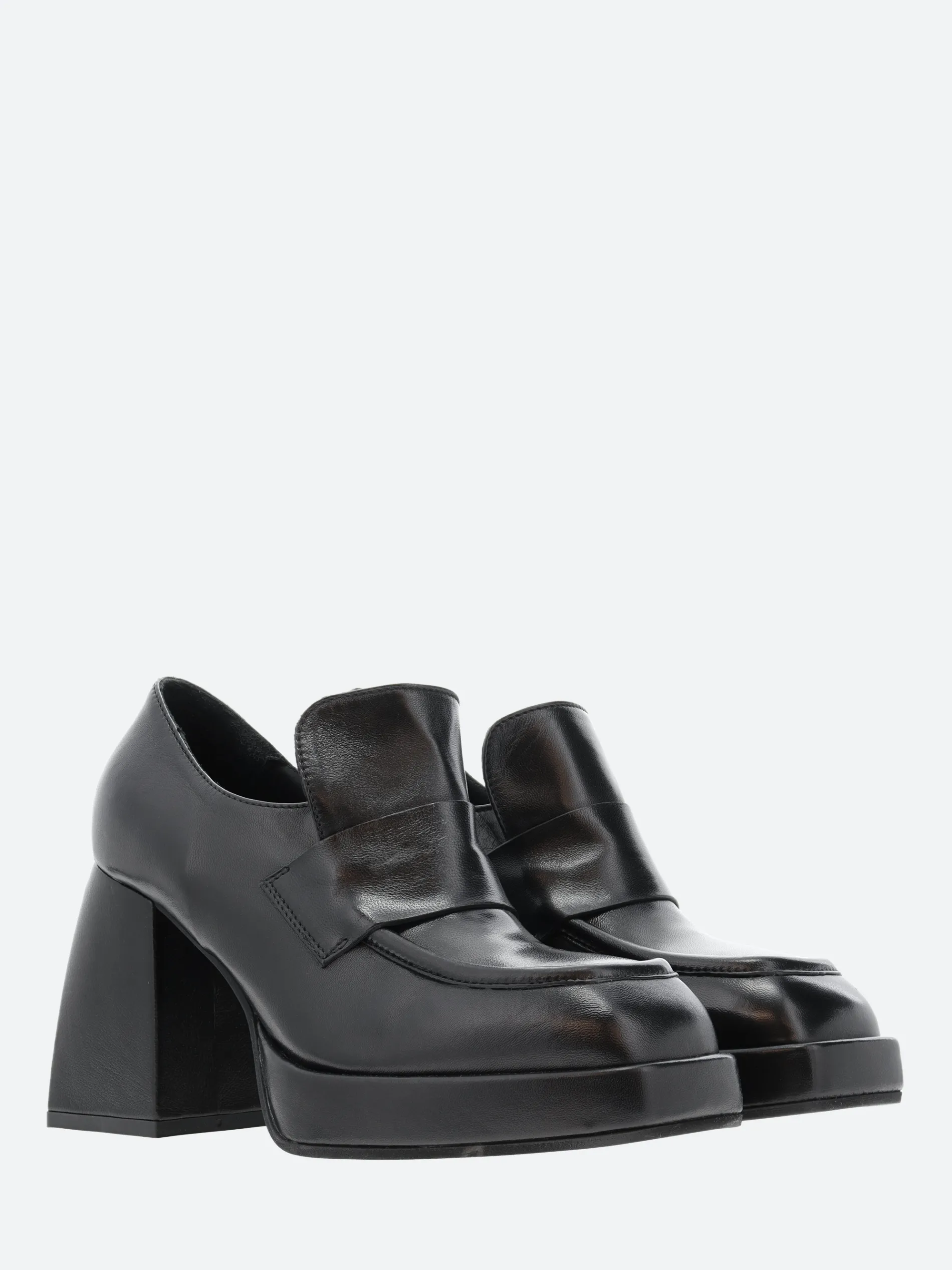 Open Closed Plata 01 is an understated leather loafer sitting on a tall block heel.