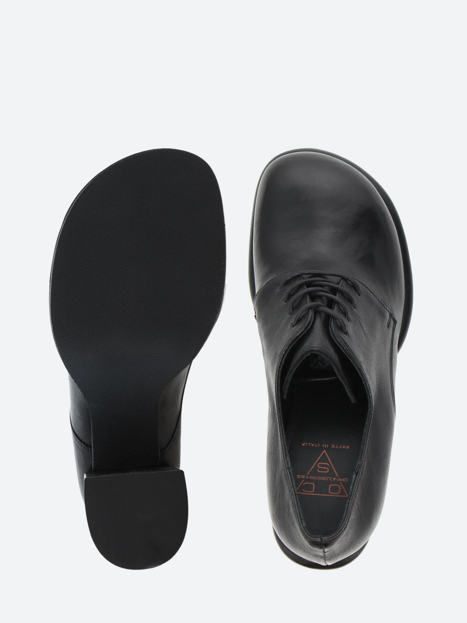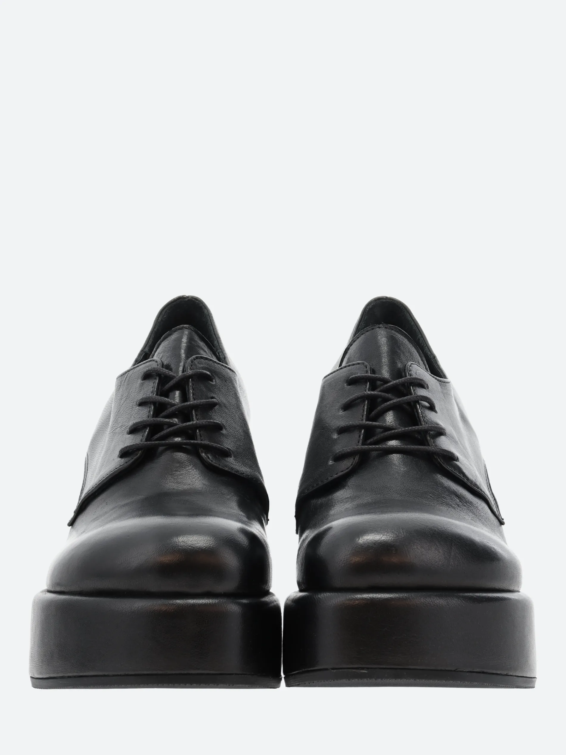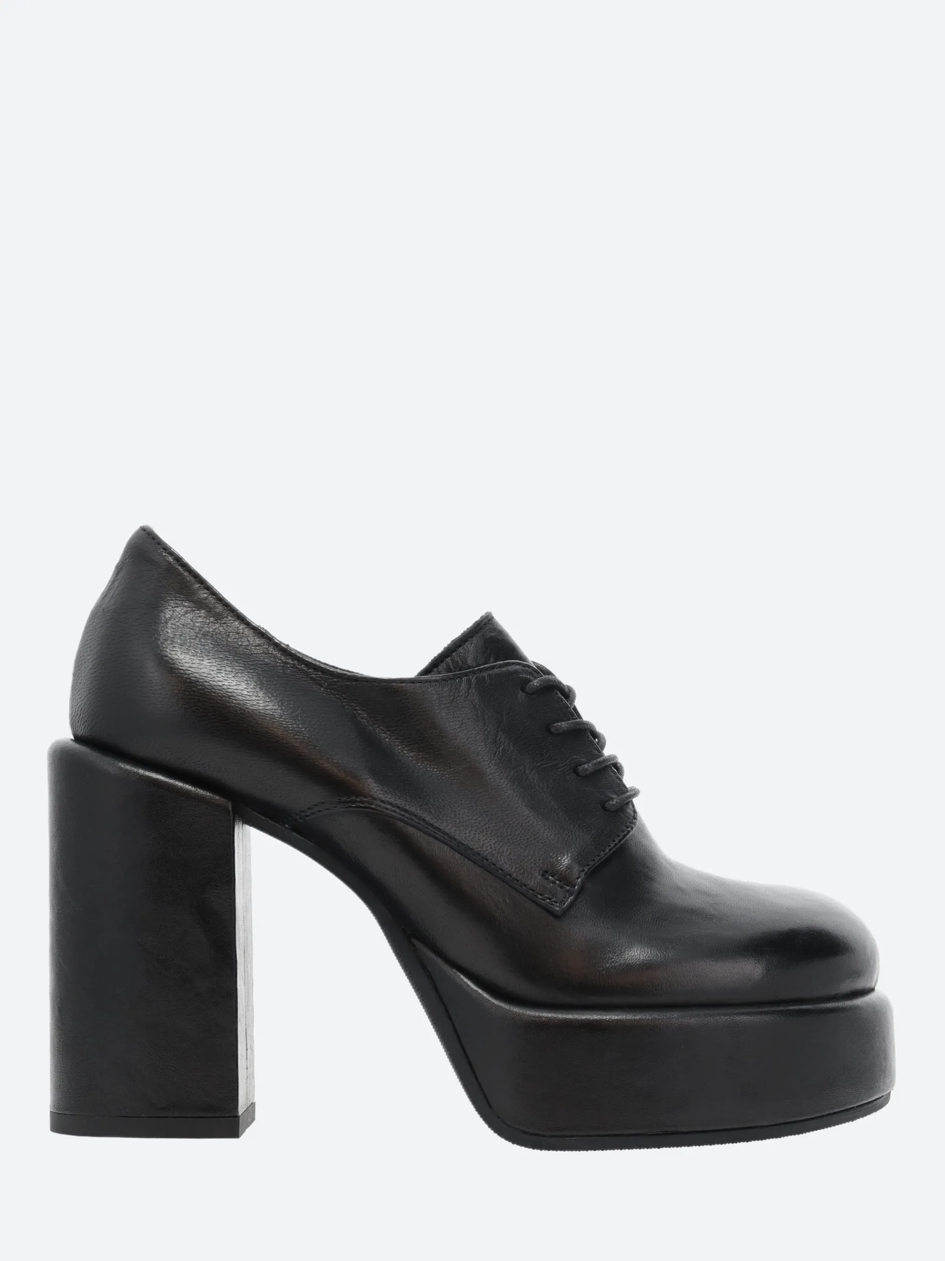 Open Closed Virgi 04 is a modern take on a classic Derby, sitting on a tall block heel and platform sole.