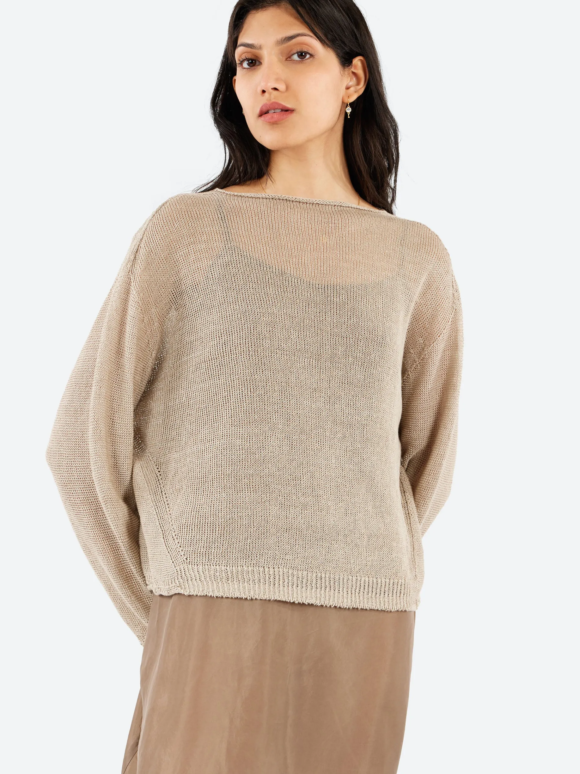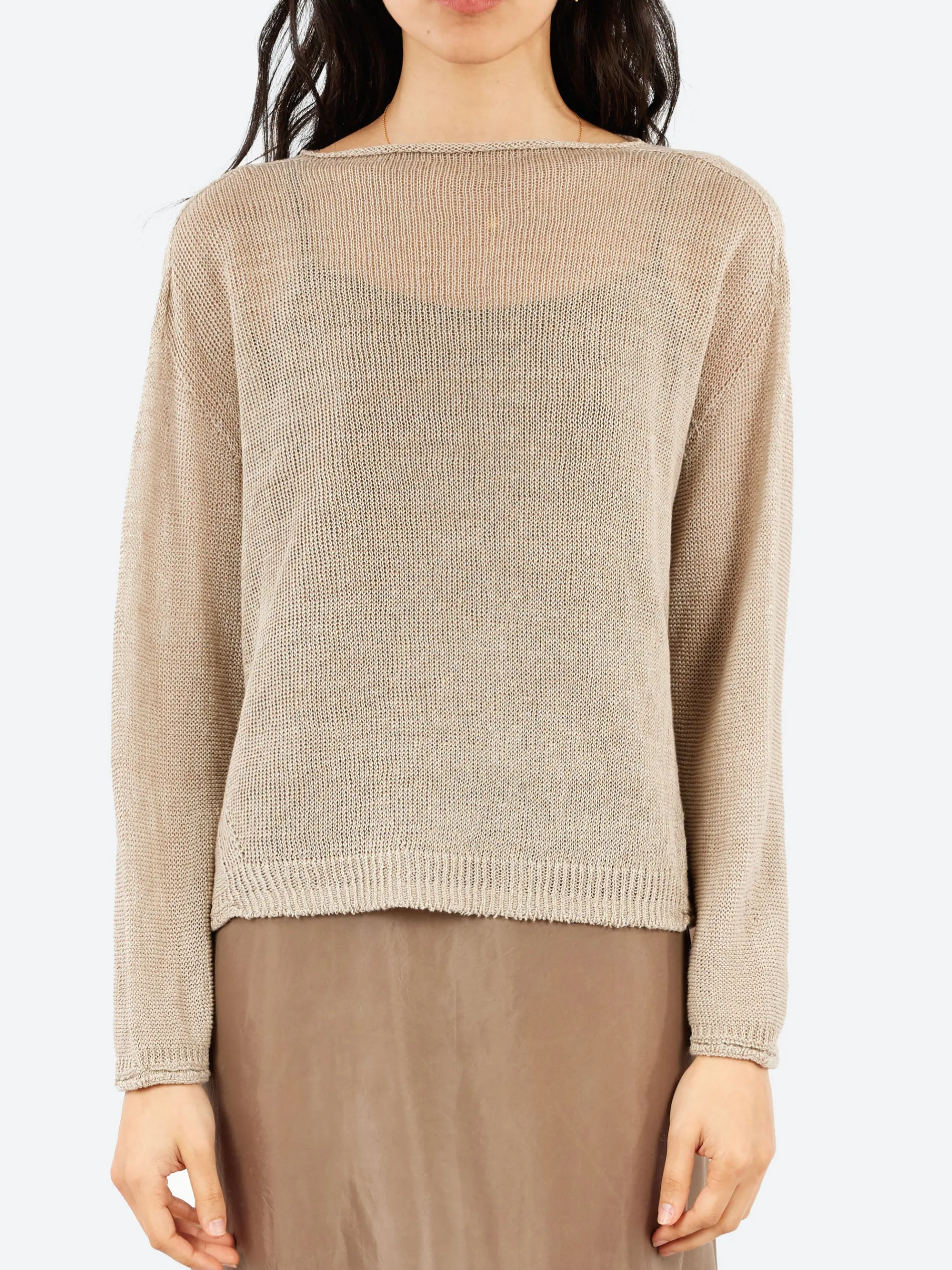 The Normandy Vintage Linen Pullover long-sleeve sweater made from a mesh knit. With a slightly wide neckline and drop shoulder design, it offers a relaxed, yet refined silhouette. The sheer texture, enhanced by the delicate holes in the knit, adds a touch of contemporary sophistication. Ideal for layering or wearing on its own.