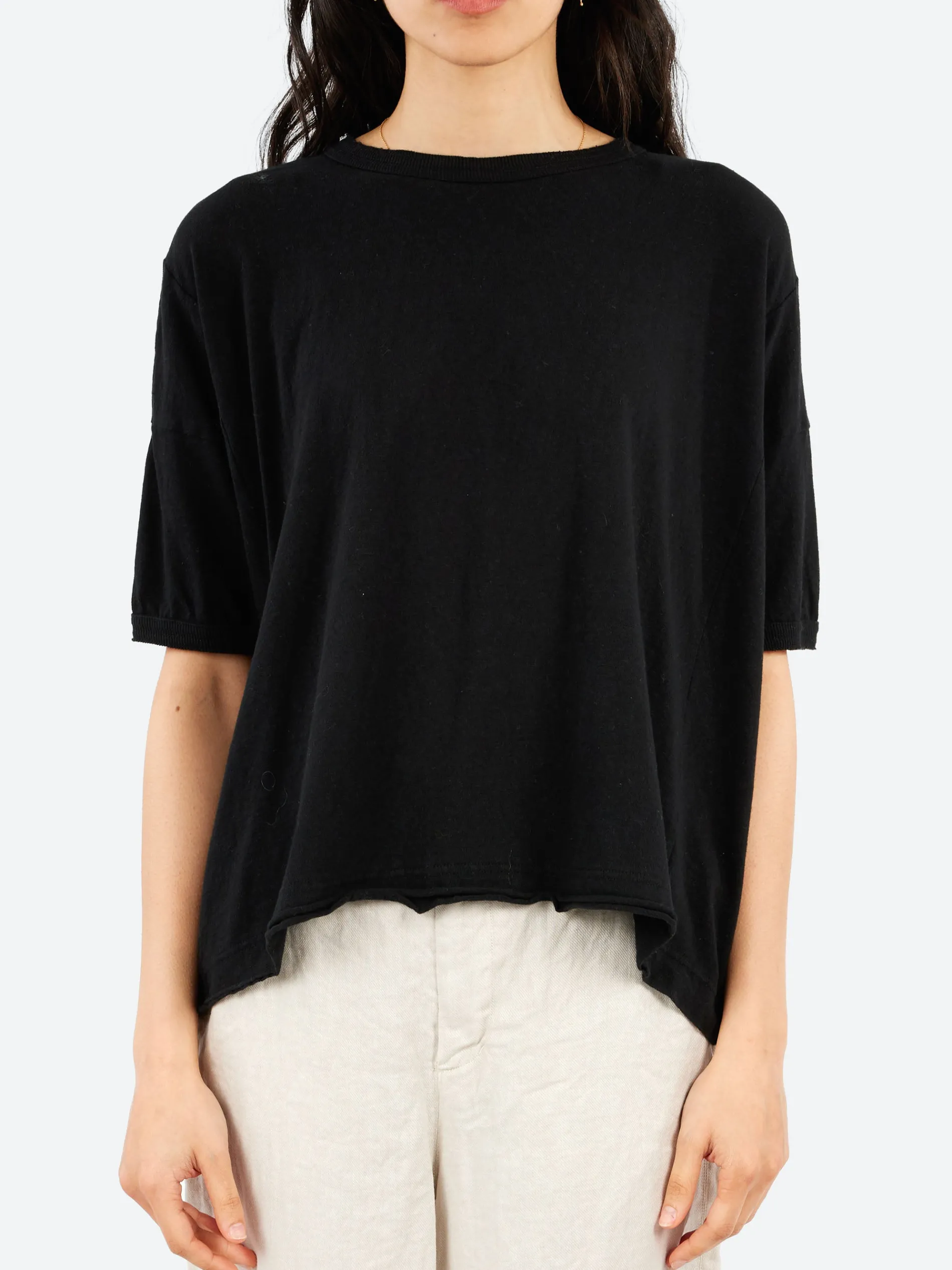 A recycled crew neck t-shirt from Japanese brand Pas De Calais. This timeless short-sleeve design is made from soft, eco-friendly recycled cotton, offering both comfort and sustainability. It features a relaxed fit, making it a versatile addition to any wardrobe.