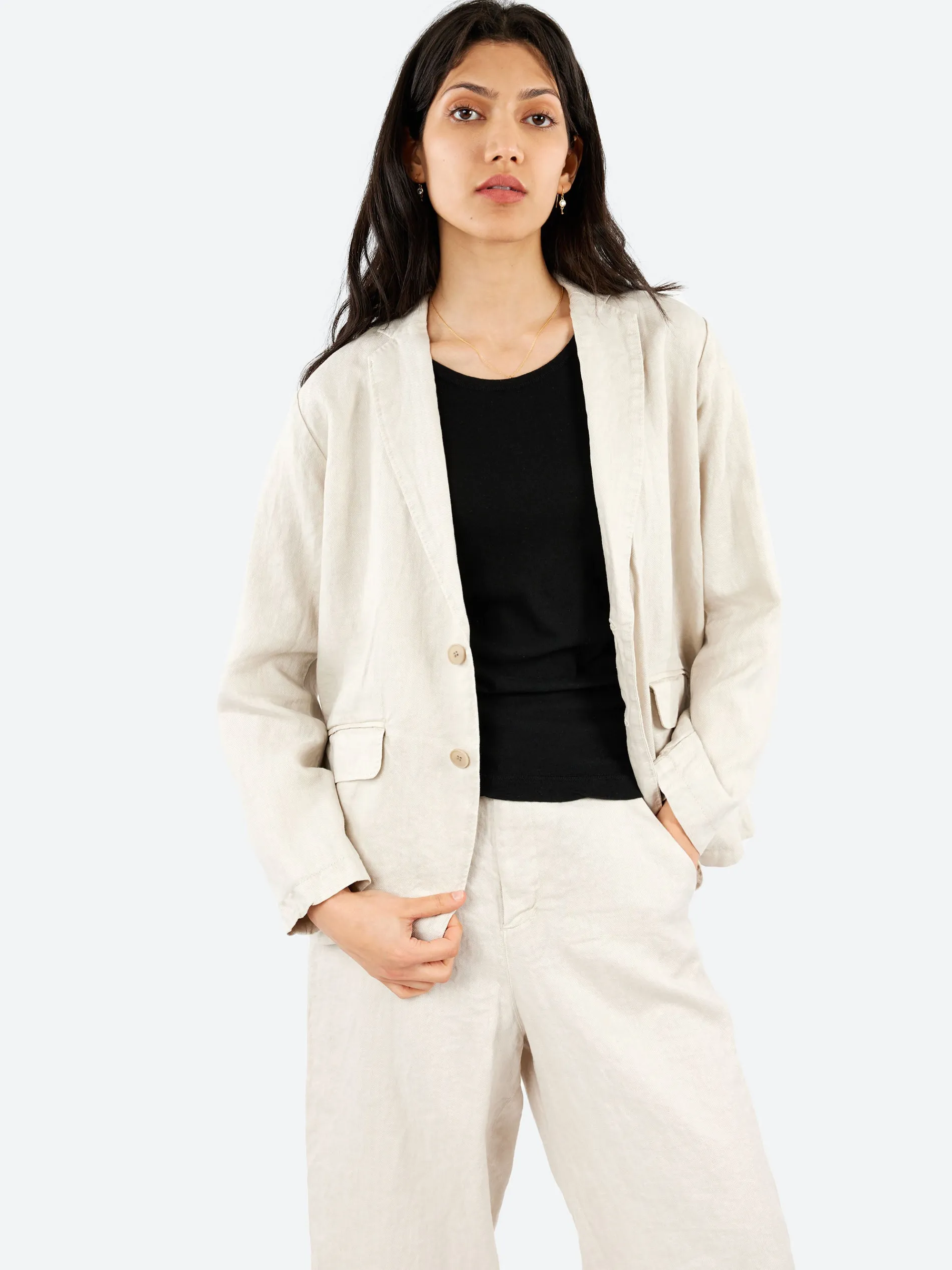 This jacket is crafted from linen twill and garment dyed for a worn-in finish. It features a notched collar, a two-button closure, and flap pockets for a functional yet stylish look. Lined in cotton for added comfort, the jacket boasts a relaxed silhouette, making it a versatile and timeless addition to any wardrobe.