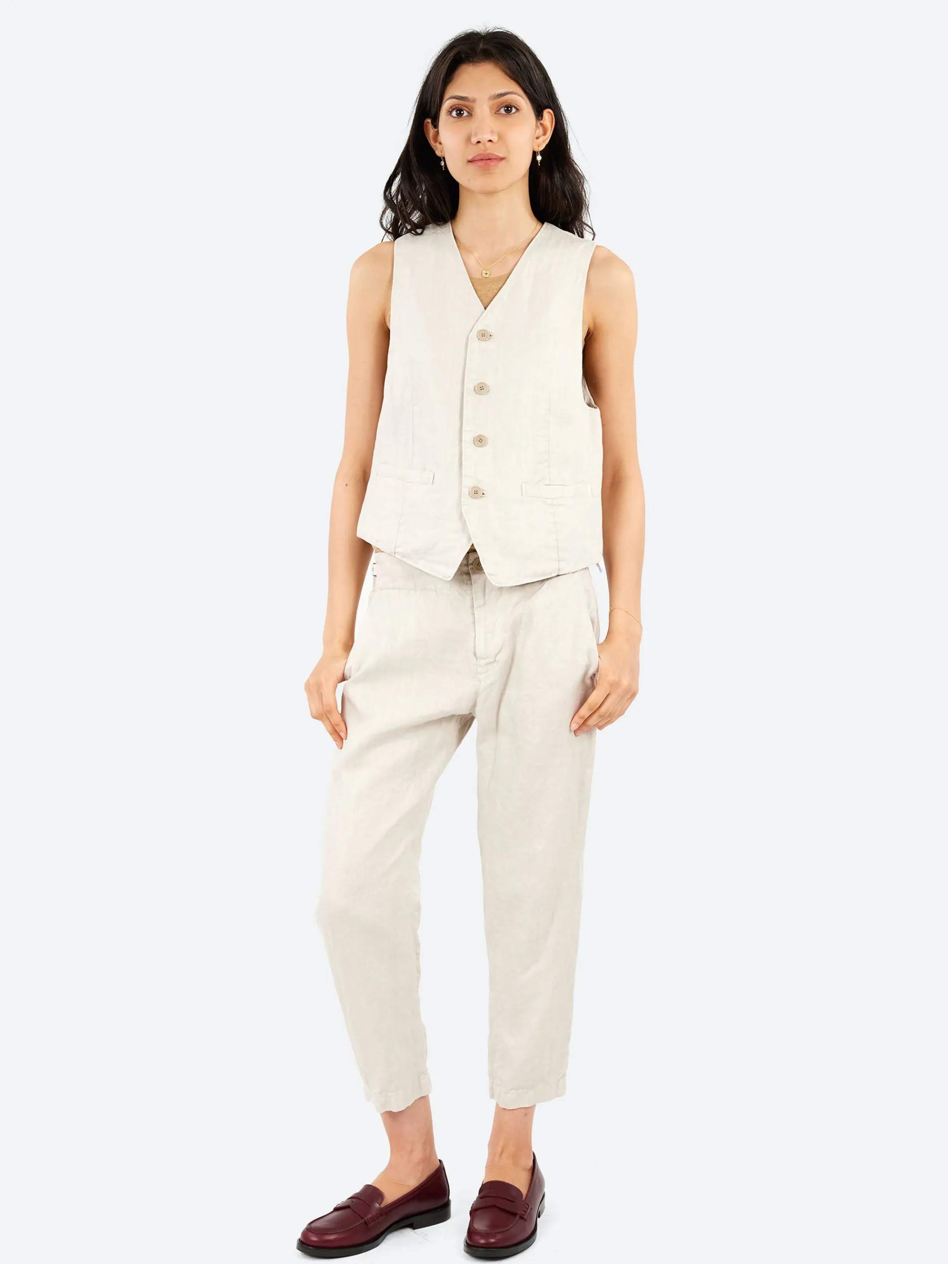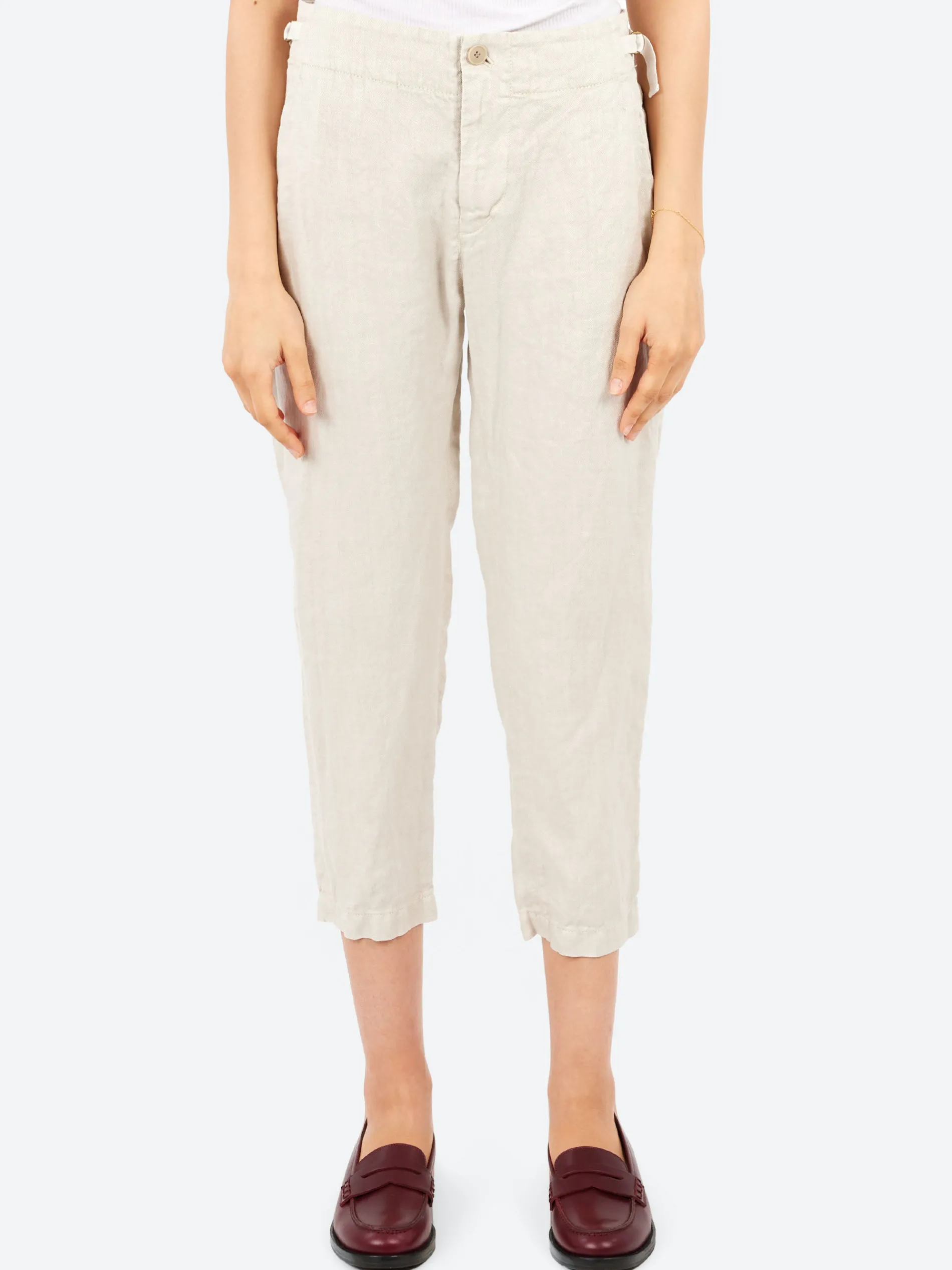 Pas de Calais tapered pants crafted from lightweight linen twill, featuring tonal adjustable side tabs for a customized fit. The design includes side-angled pockets, two patch pockets at the back, and a button and zip-fly fastening for added convenience.