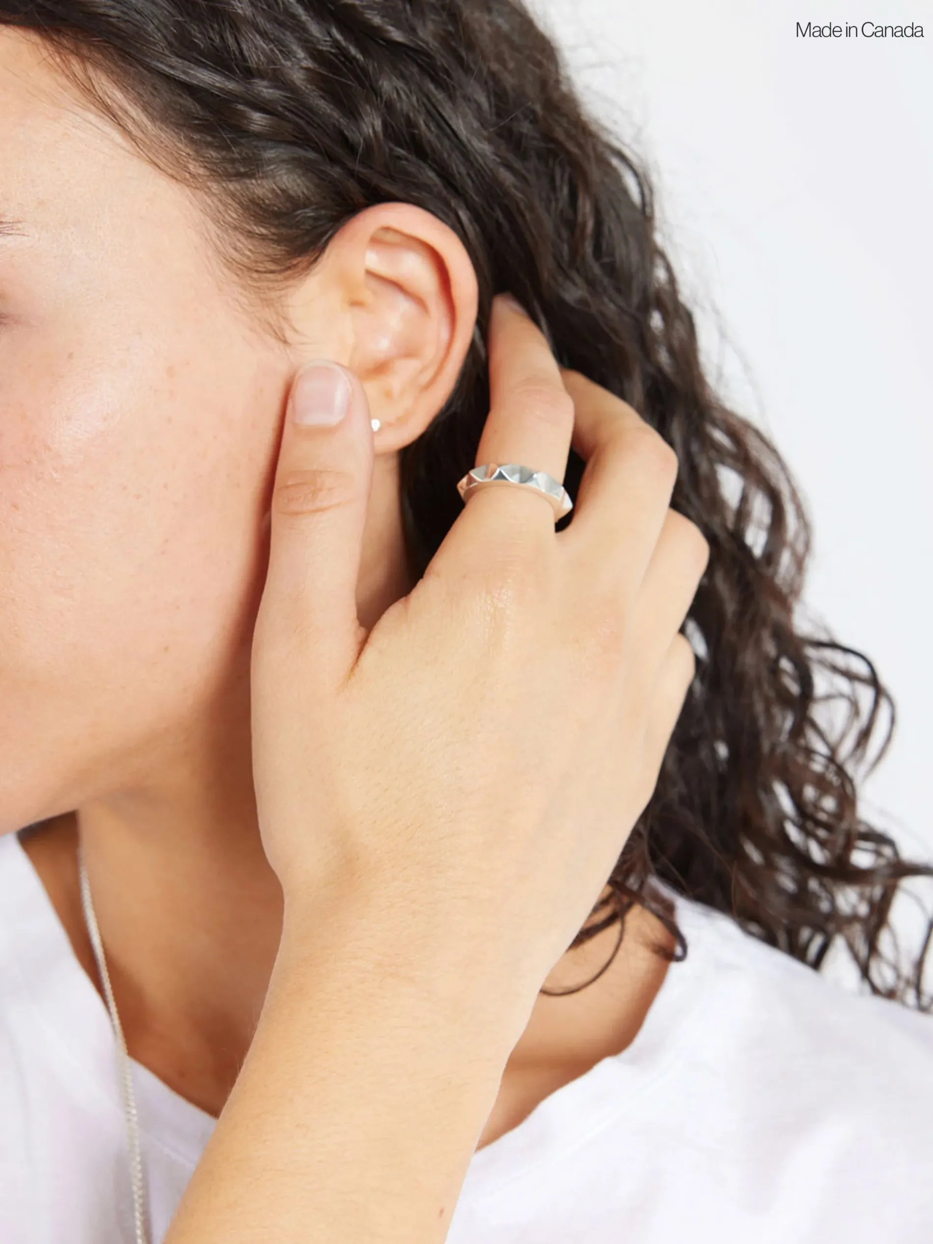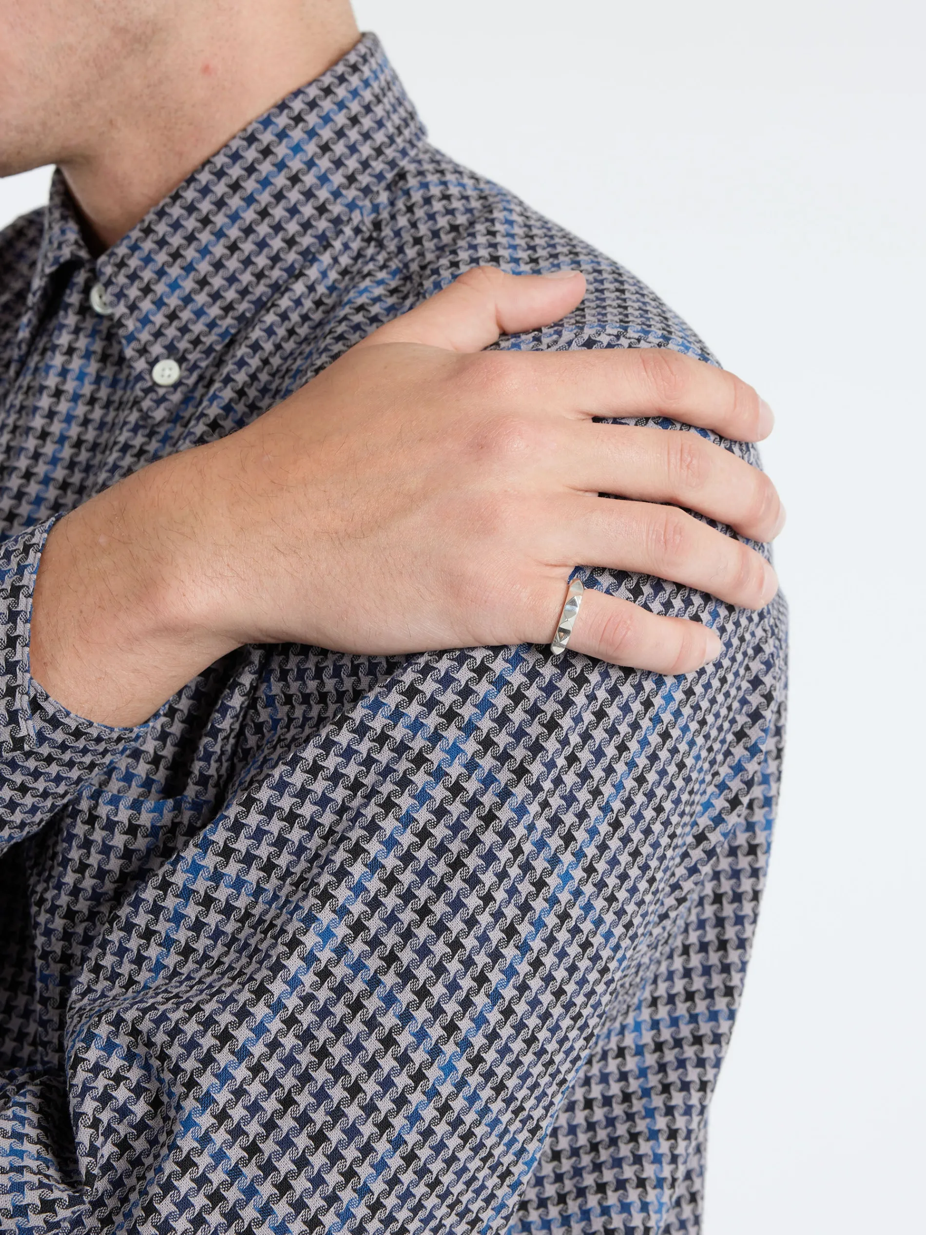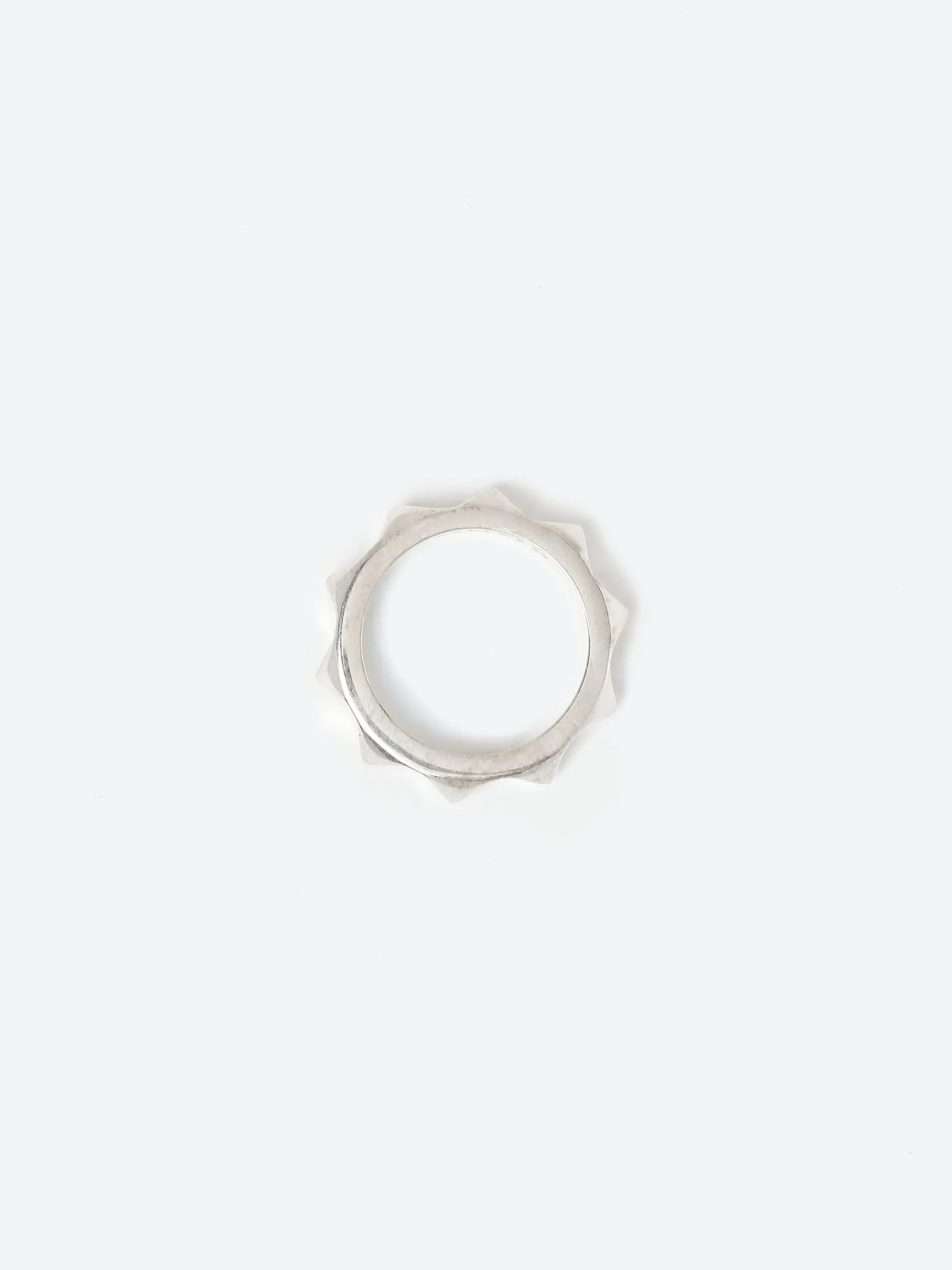 Handcrafted band ring in sterling silver with studded detailing throughout.