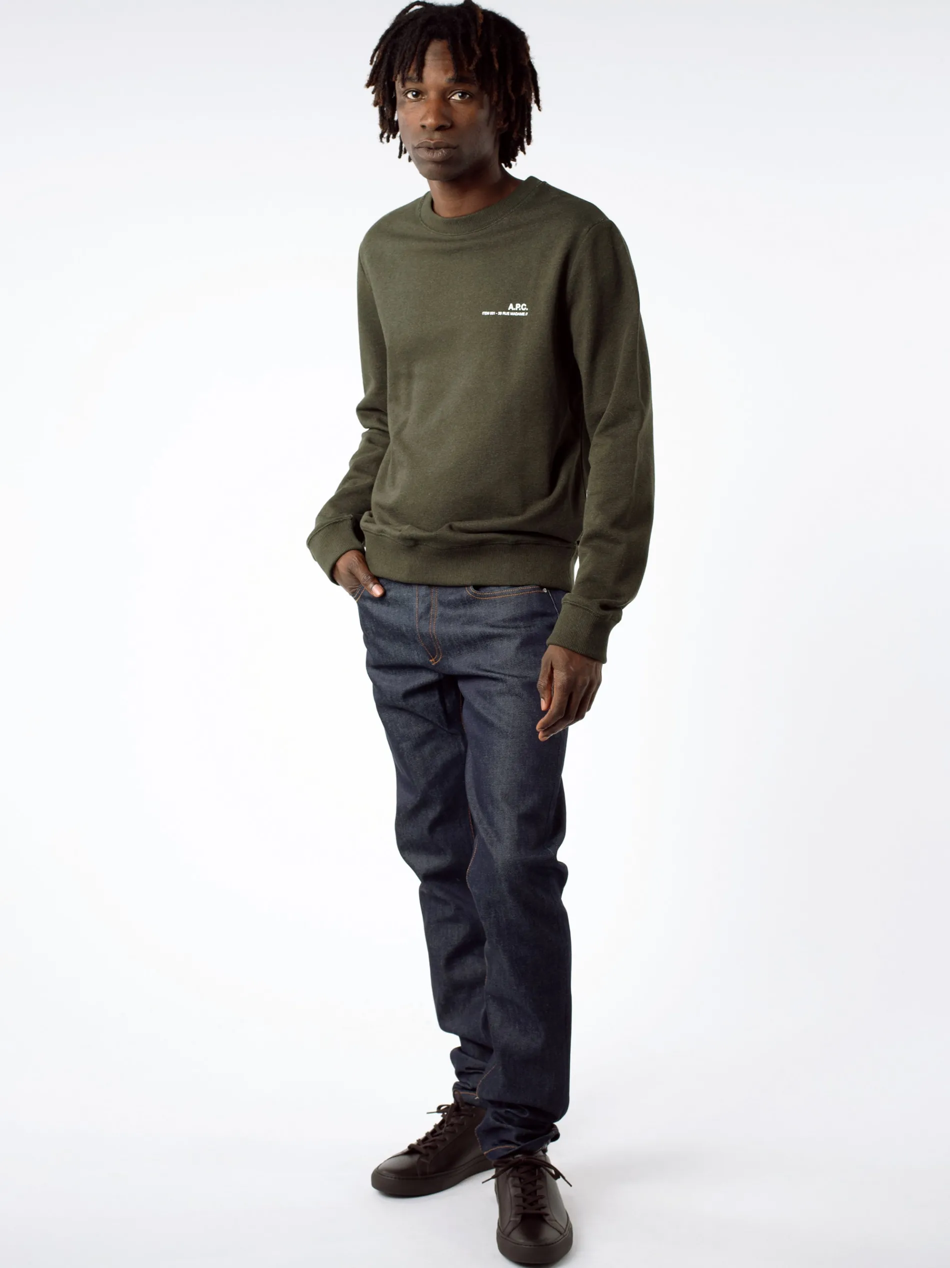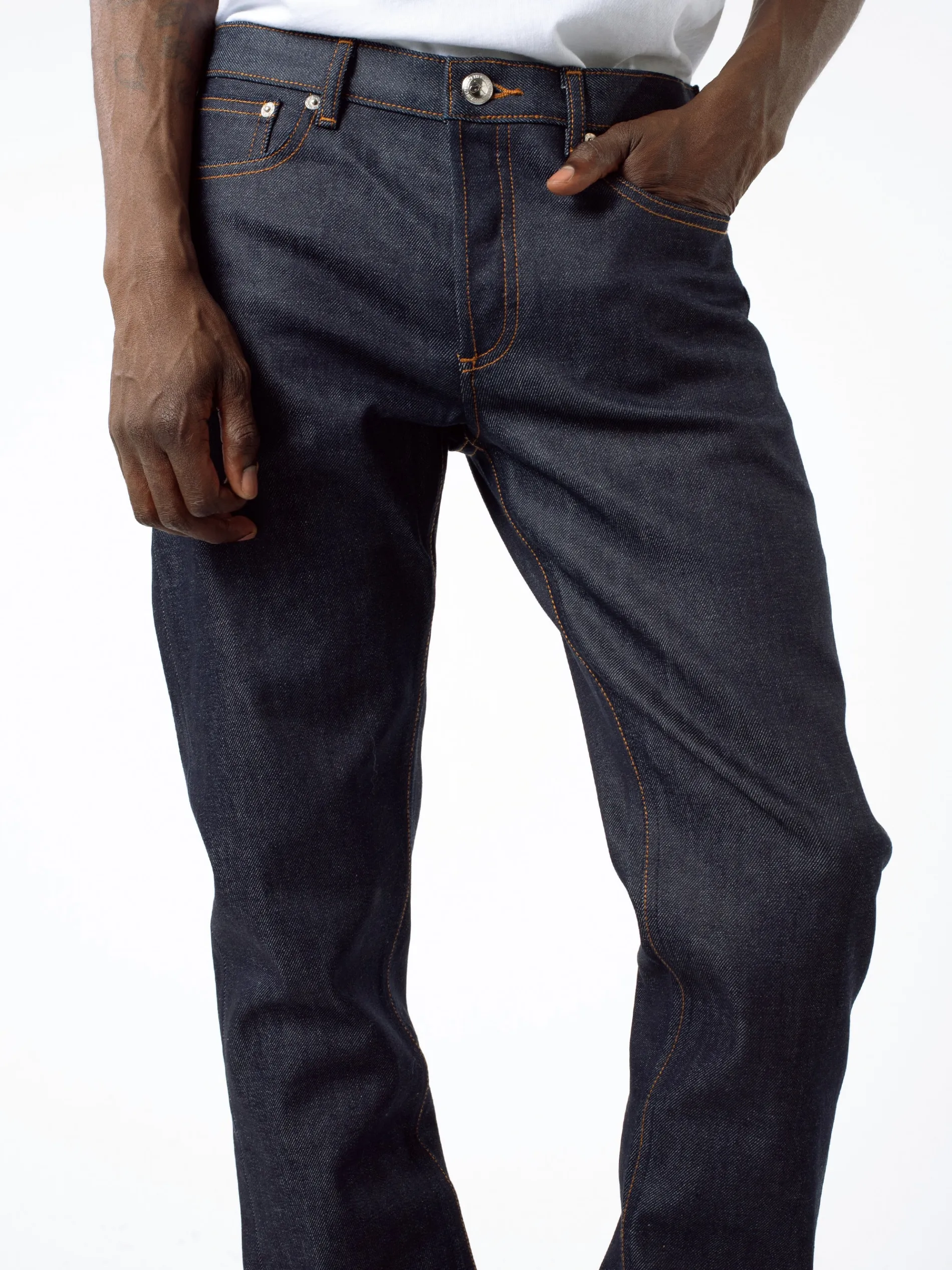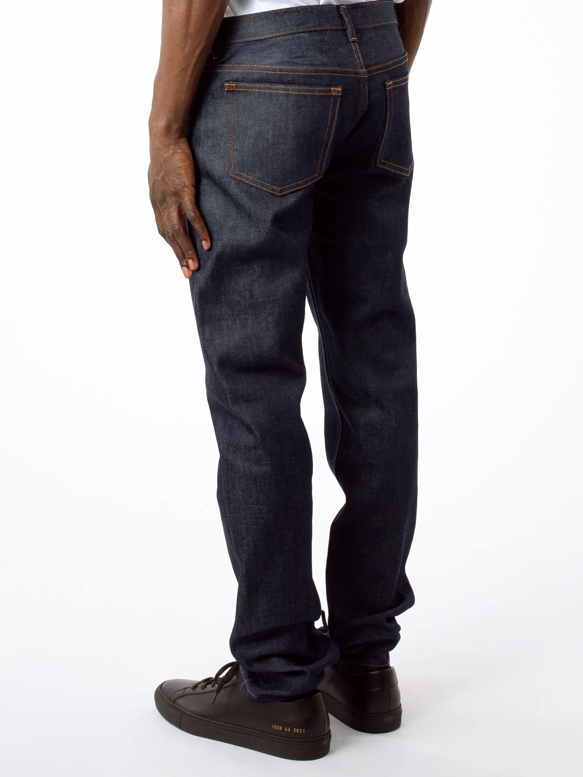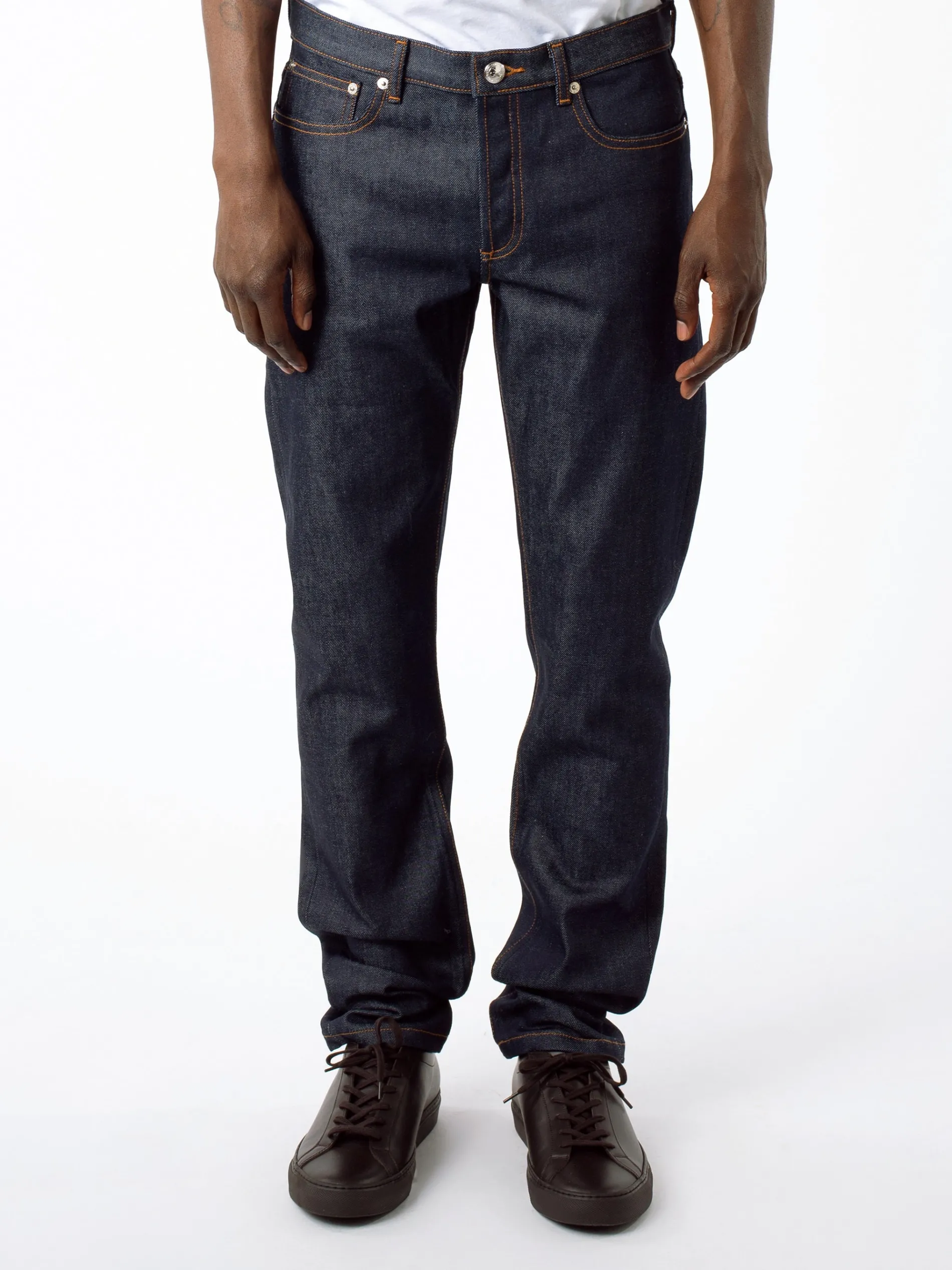 A.P.C.’s Petit New Standard are a classic 5-pocket styled jean with a very tight leg that is fitted on the bottom in a straight mid-rise and a button fly. Seen here in a unwashed Japanese denim.