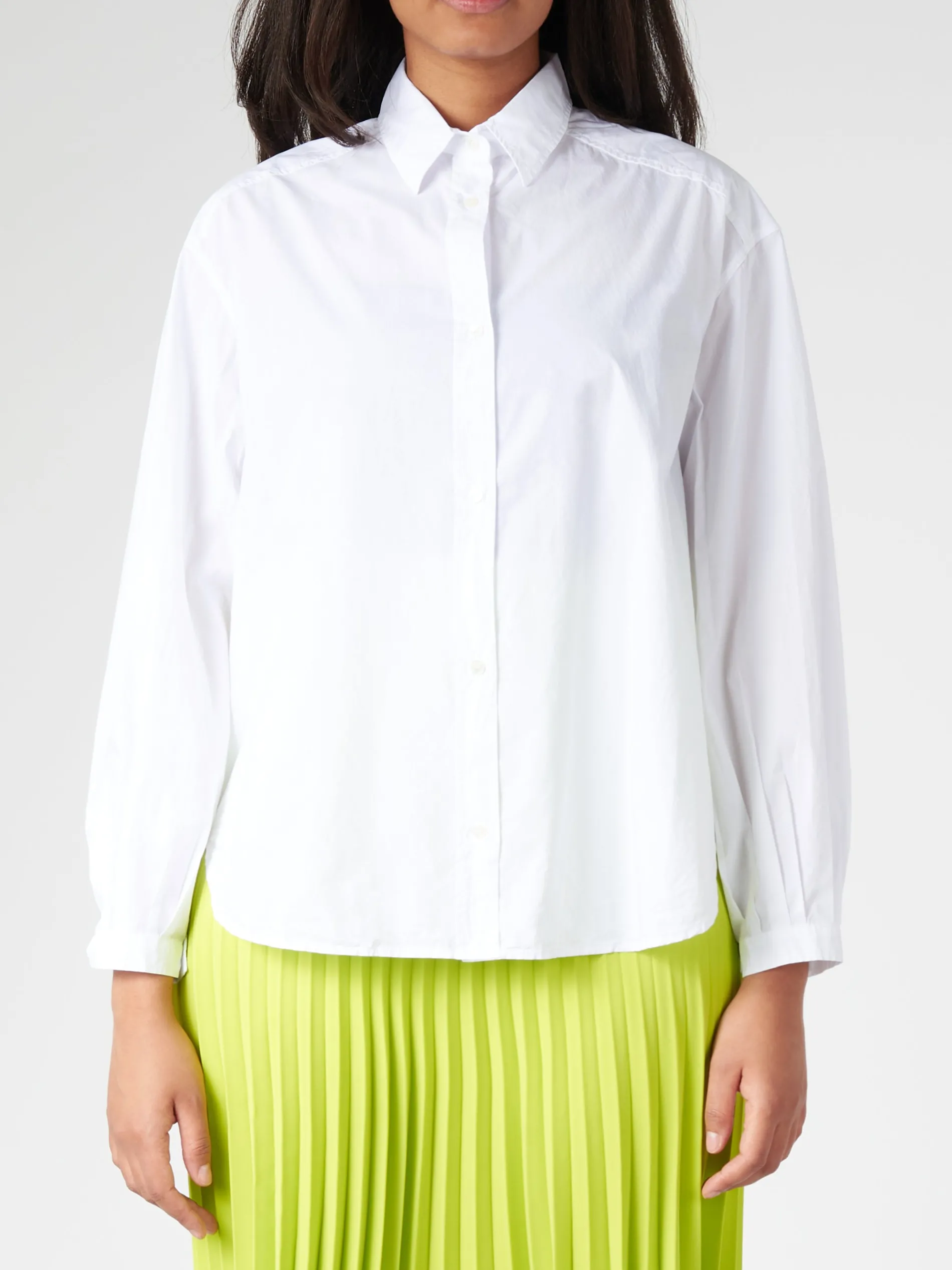 Shirt with collar in cotton. Visible central buttoning, long sleeves, buttoned cuffs, small pleats at the bottom of the sleeve.