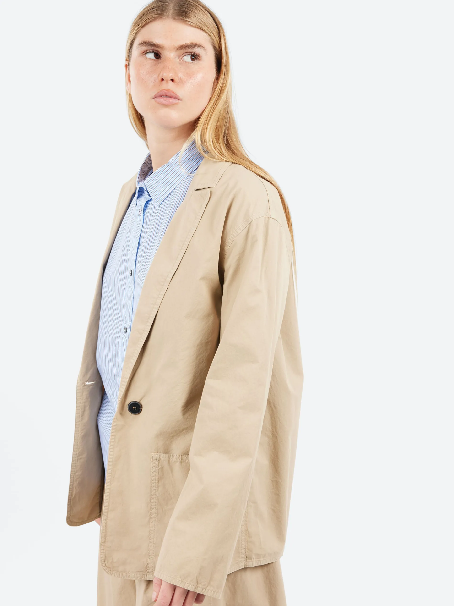 The lightweight, casual texture of cotton gabardine enhances the clean lines of the single-breasted jacket, giving it a summery and airy touch. The large patch pockets and the fully unlined construction of the garment complete the aesthetic with modern details.