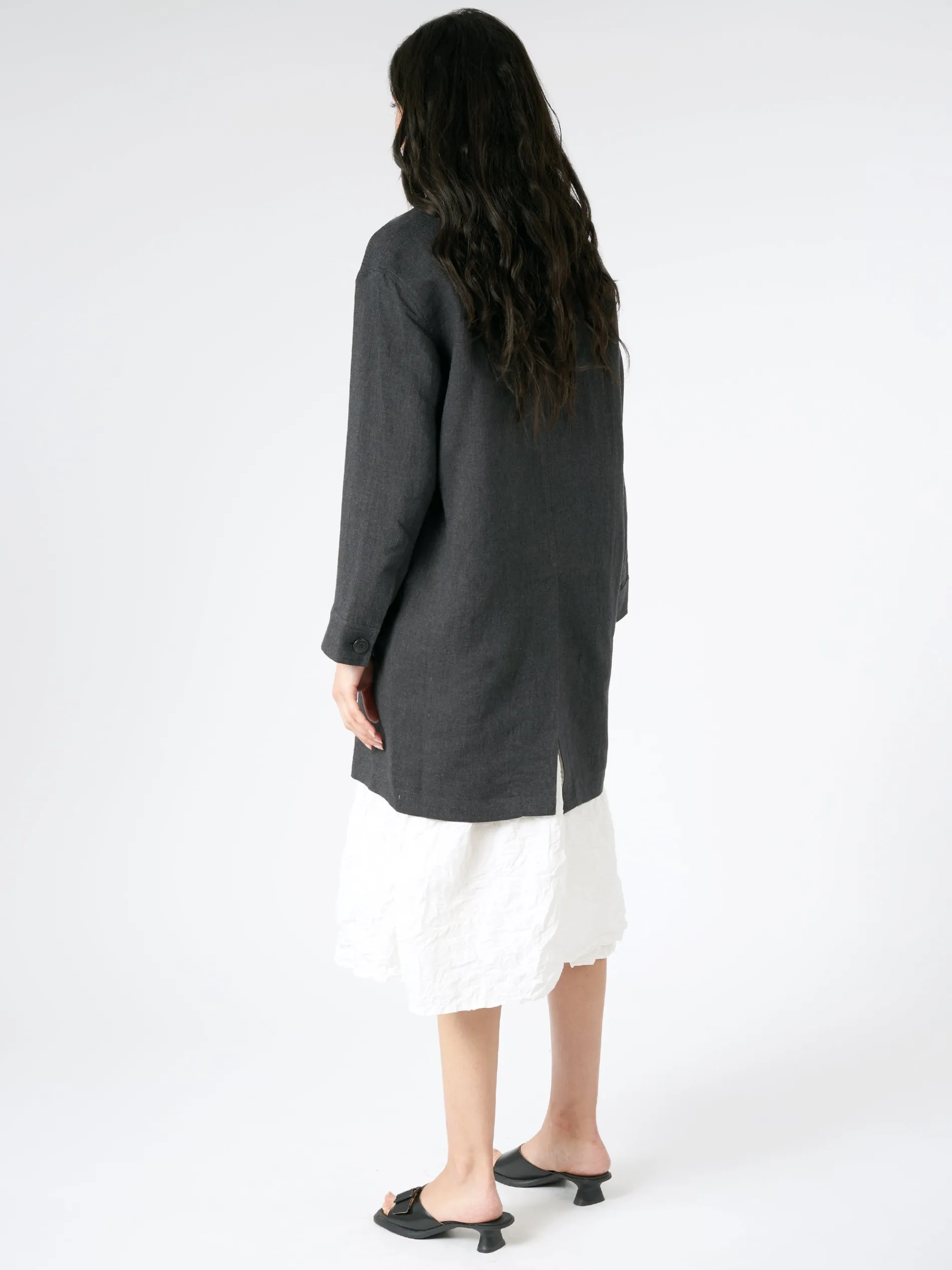 Constructed from a luxurious blend of cotton and yarn-dyed linen, this coat boasts a double-breasted button closure, dropped shoulders, and welt pockets for functional elegance. A back vent to keep you comfortable.
