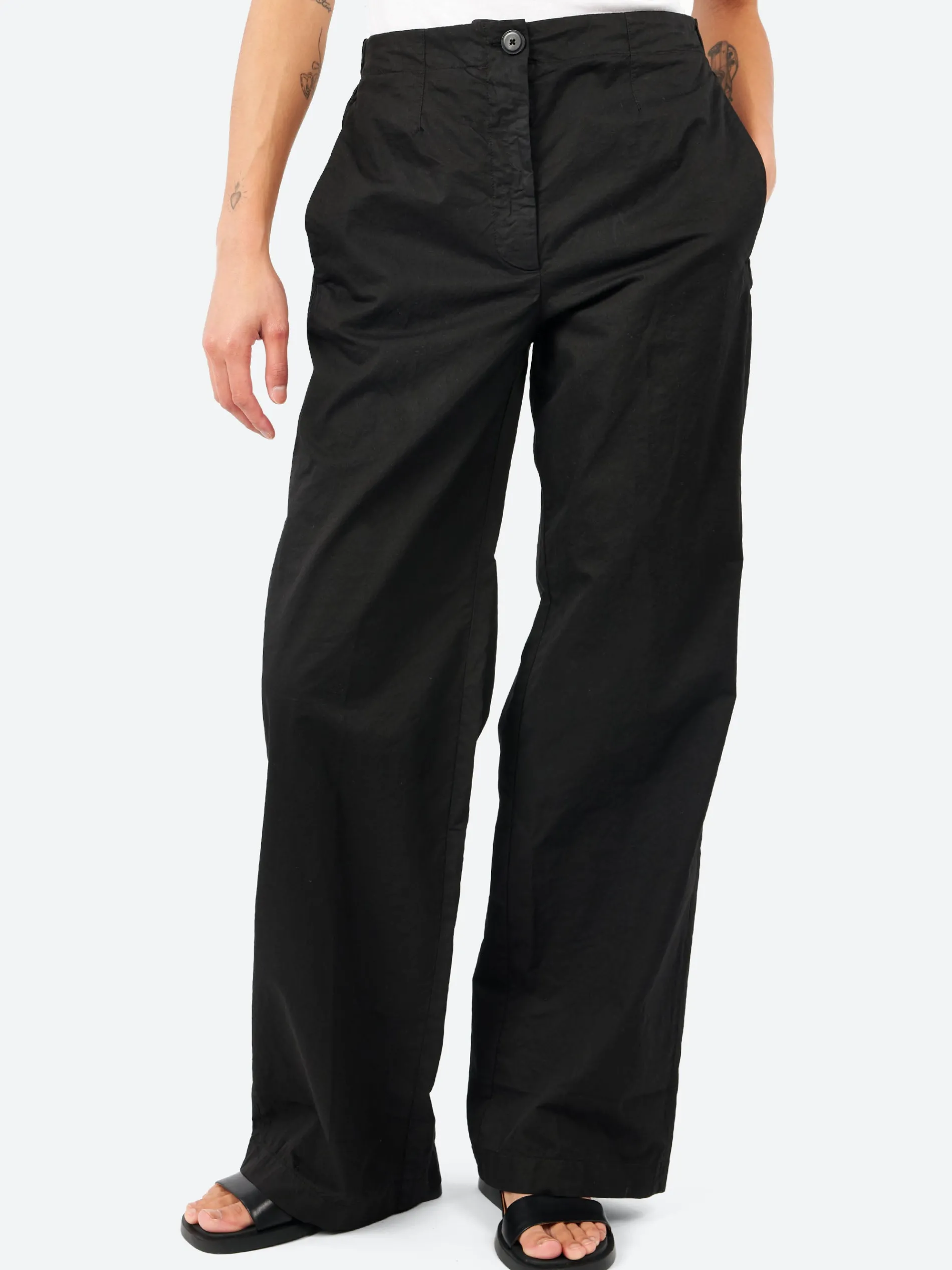 The lightweight, casual texture of the cotton gabardine enhances the silhouette of the iconic Pomandère pants. The crispness of the cotton pairs with the pants, which feature a slightly wide leg, emphasizing the carefree attitude of the garment.