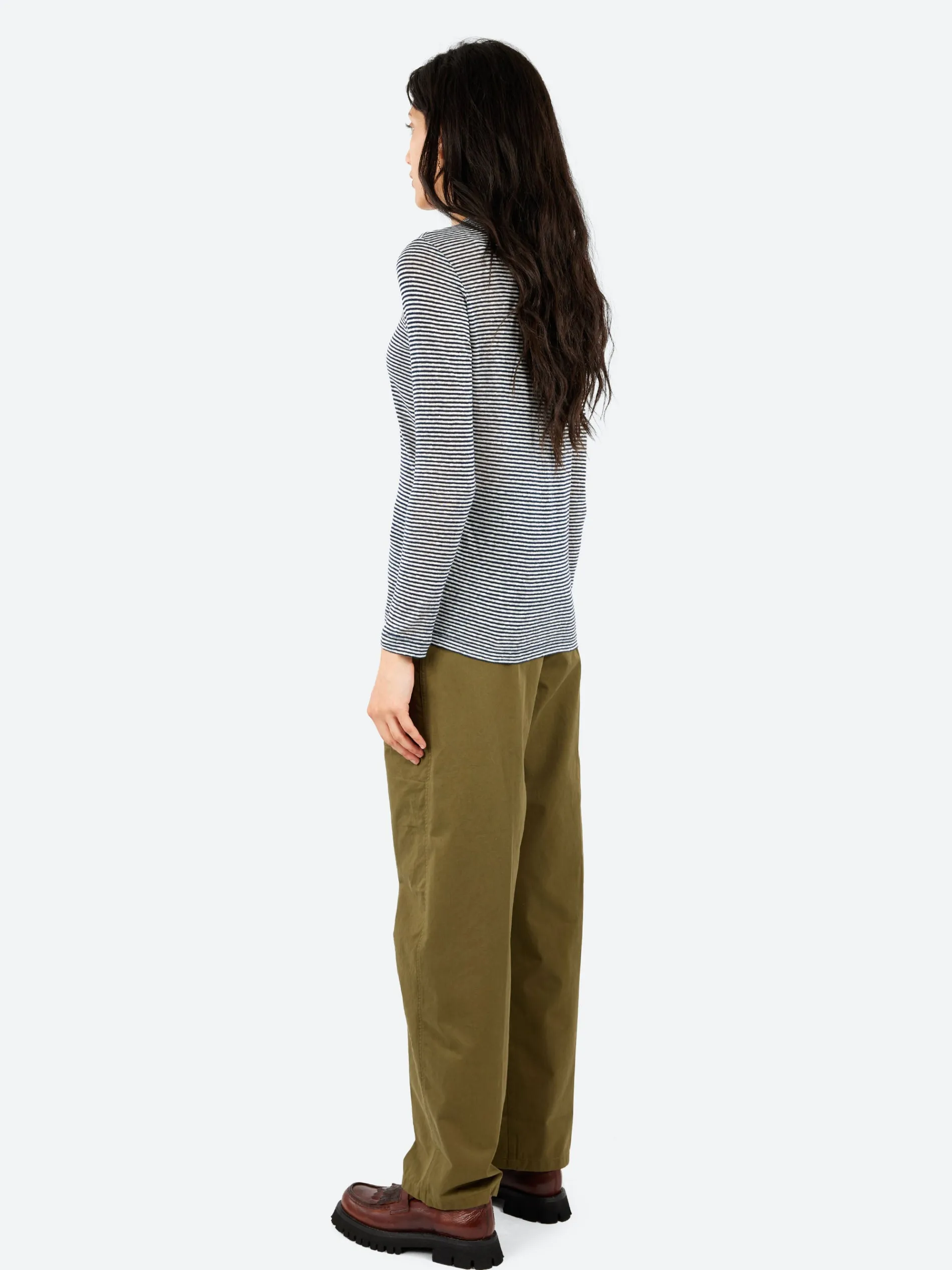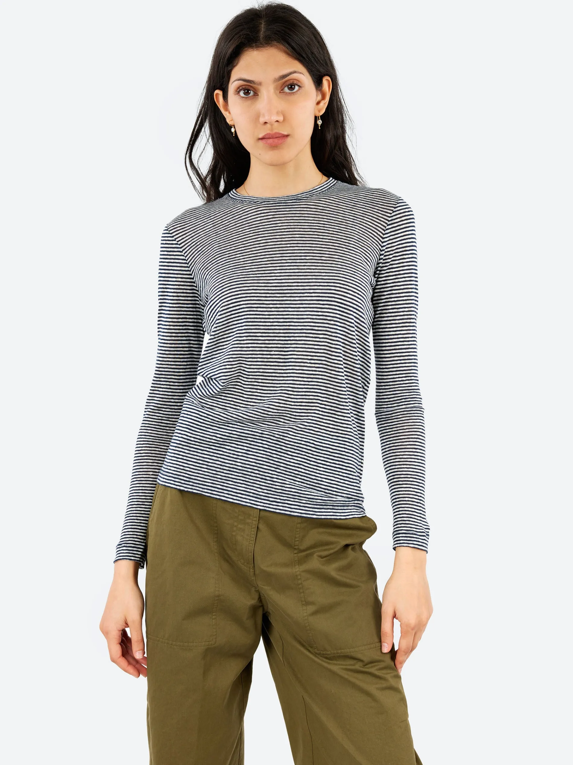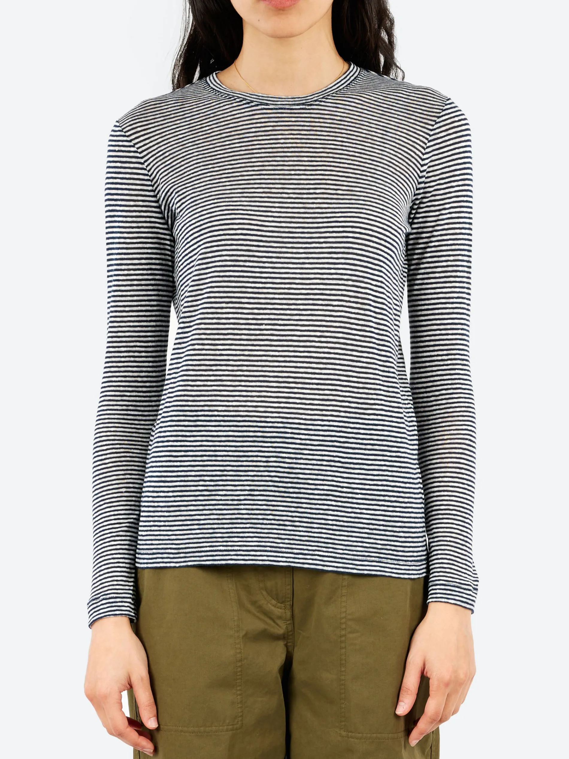 The classic striped design in seasonal hues enriches the soft jersey of the linen cotton blend, a fabric with a smooth and comfortable feel.