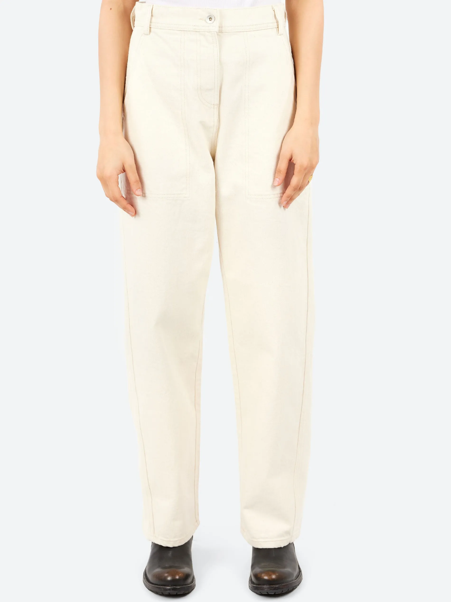 The stitching on the pockets and soft shapes bring movement to the garment, adding a sophisticated touch. Back flap pockets enhance the casual style with modern details. Made from 100% cotton bull denim, it offers a soft, lightweight feel against the skin.