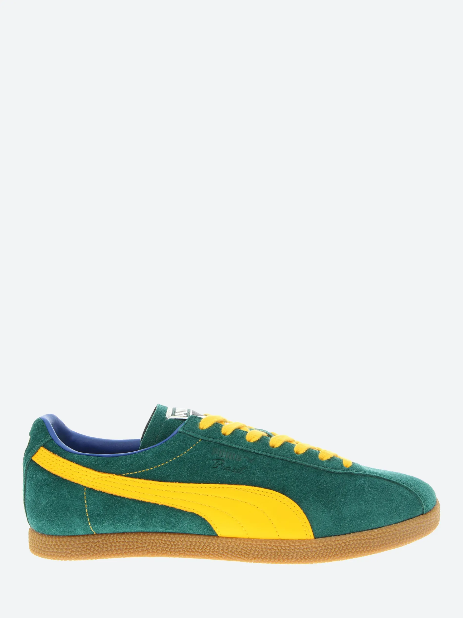 The Puma Brasil sneakers, dressed in yellow, green, and blue, are a tribute to Brazil. Made from luxurious suede, they feature a contrasting gum sole and a leather Formstrip logo on each side, creating a timeless, vintage-inspired look.