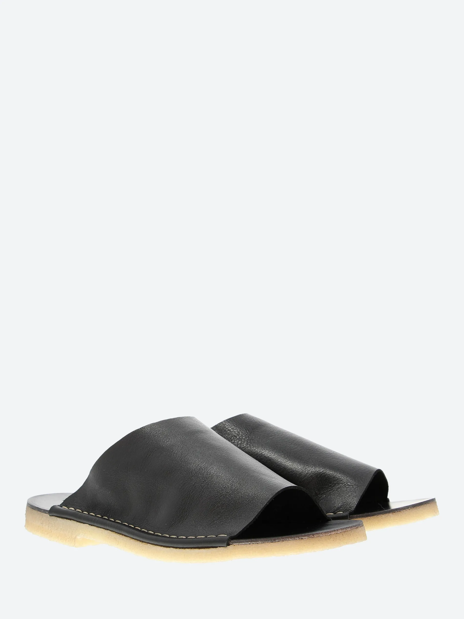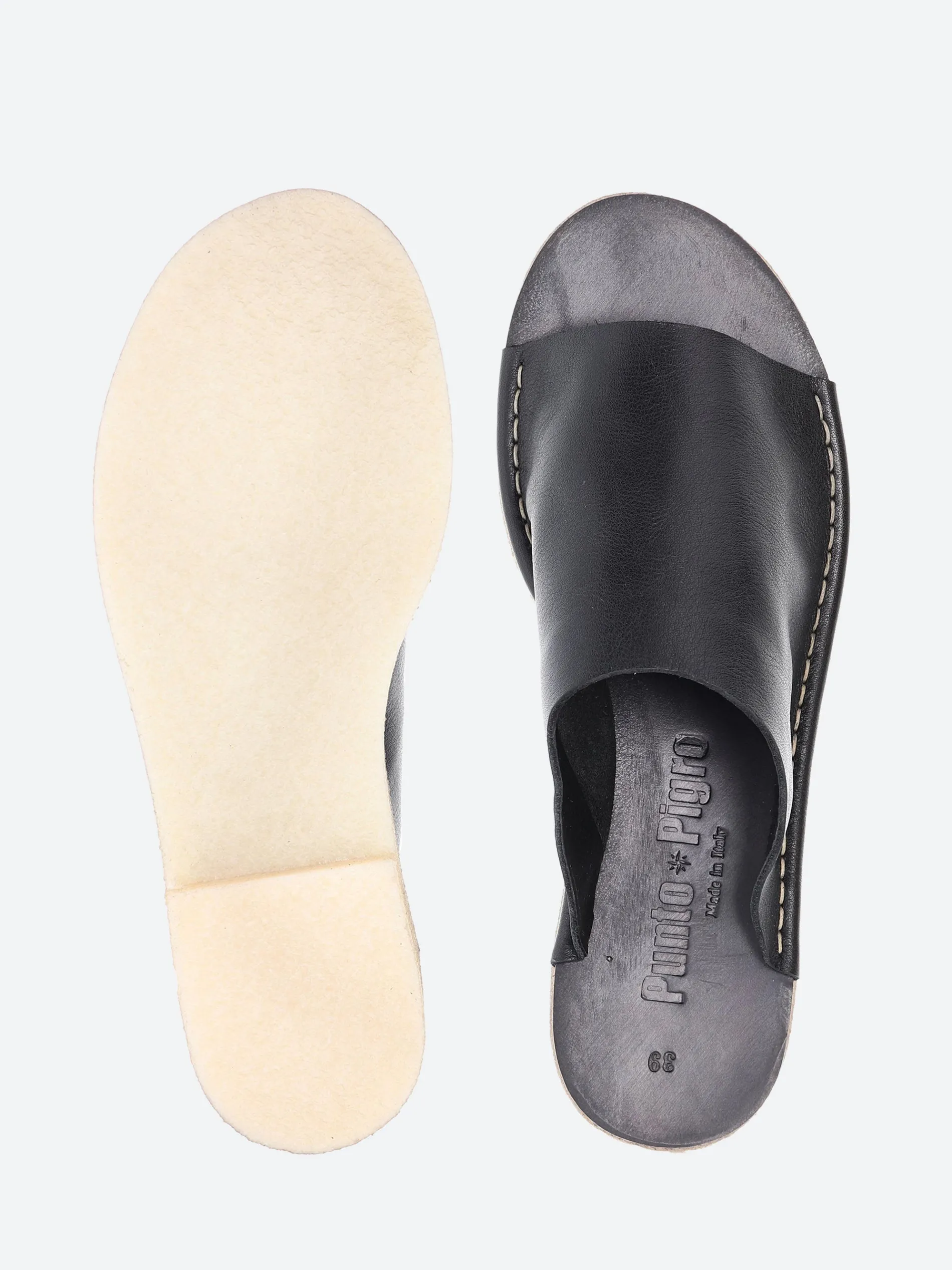 Punto Pigro crepe sole sandals with a sleek and clean design. The San Crispino seam is entirely handmade and the full grain leather is extra smooth.