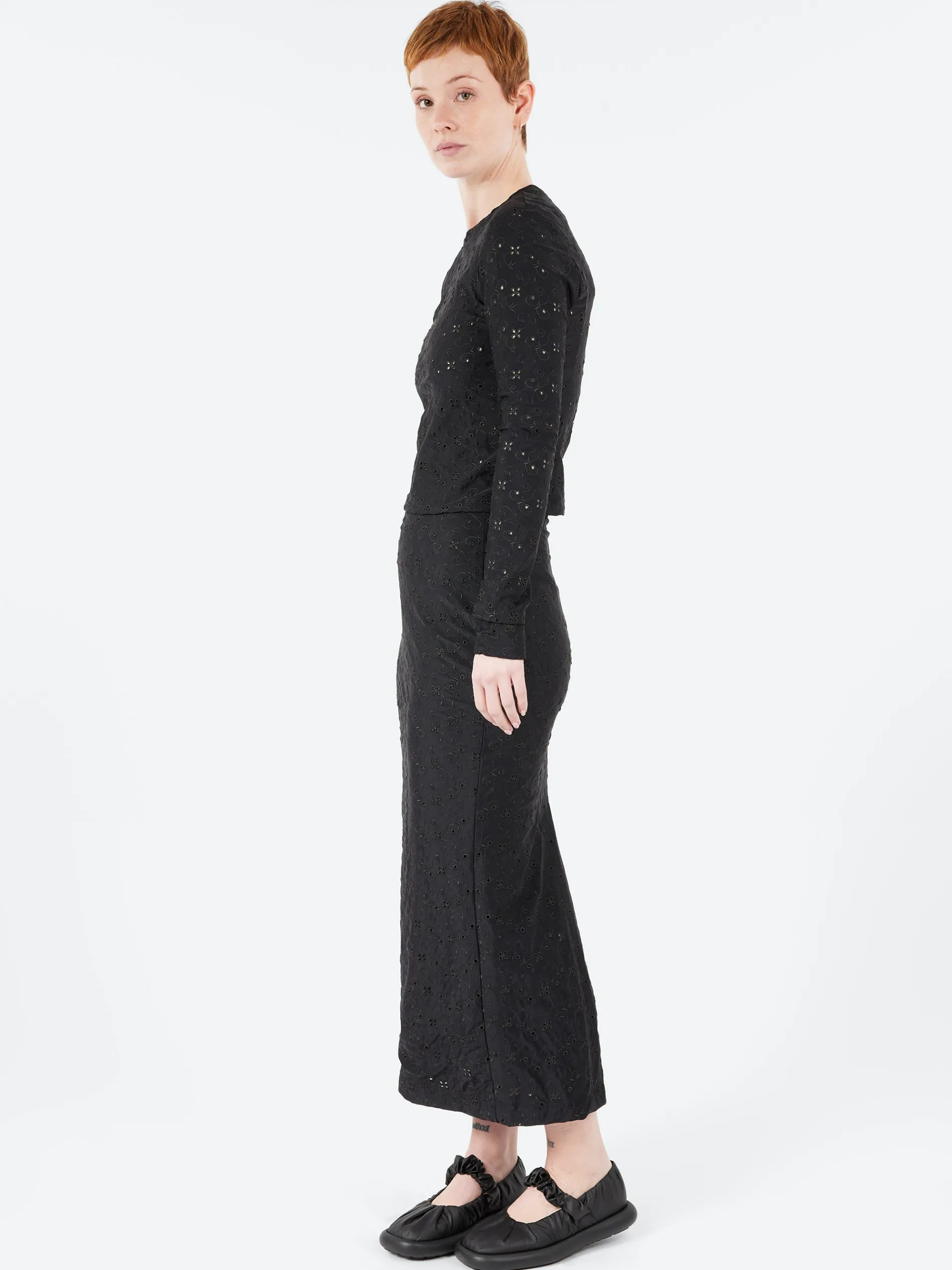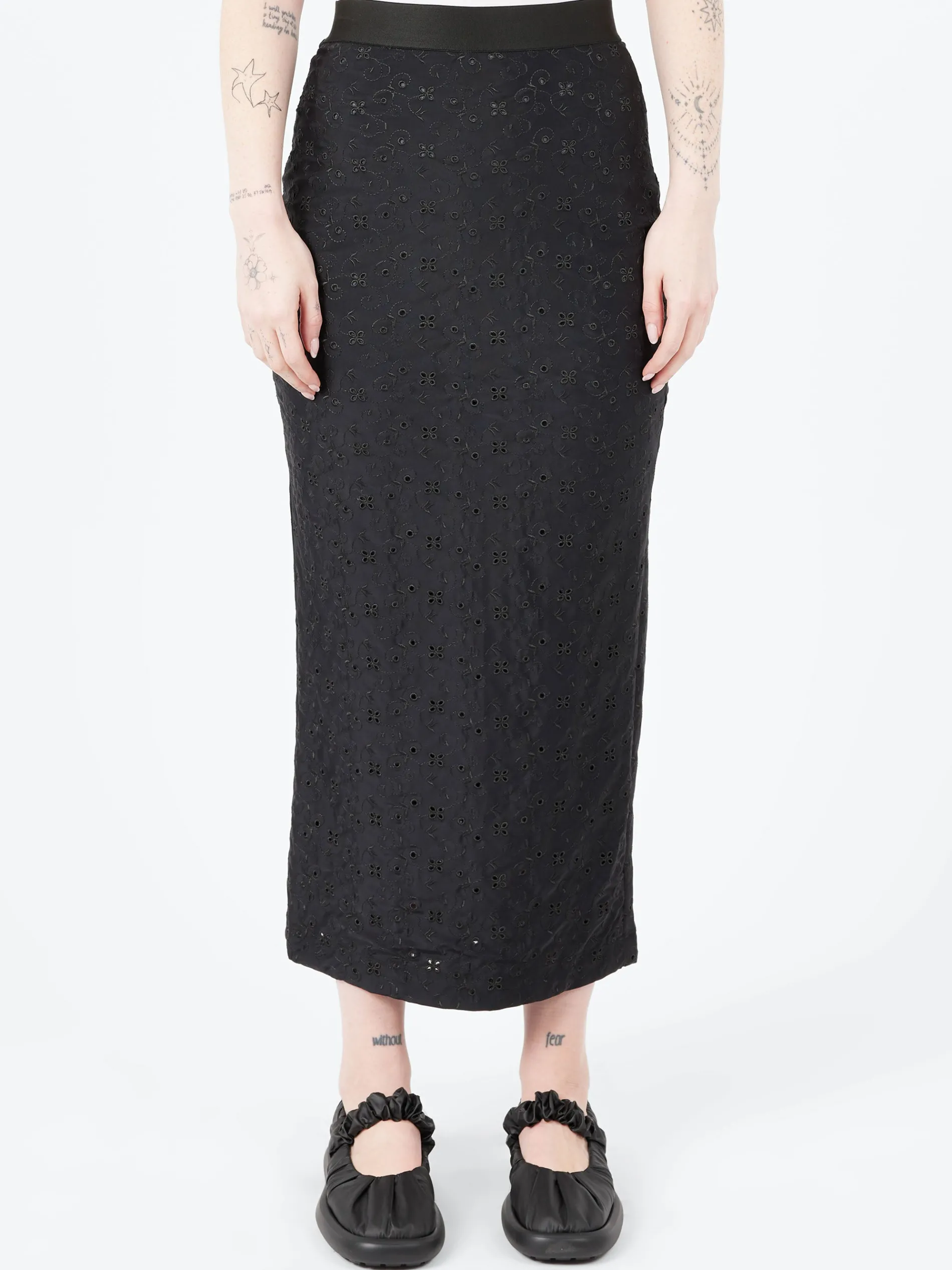 Midi-length pencil skirt with a contrasting grosgrain waistband, in textured eyelet jersey. Straight silhouette with a subtle rear slit for ease of movement.