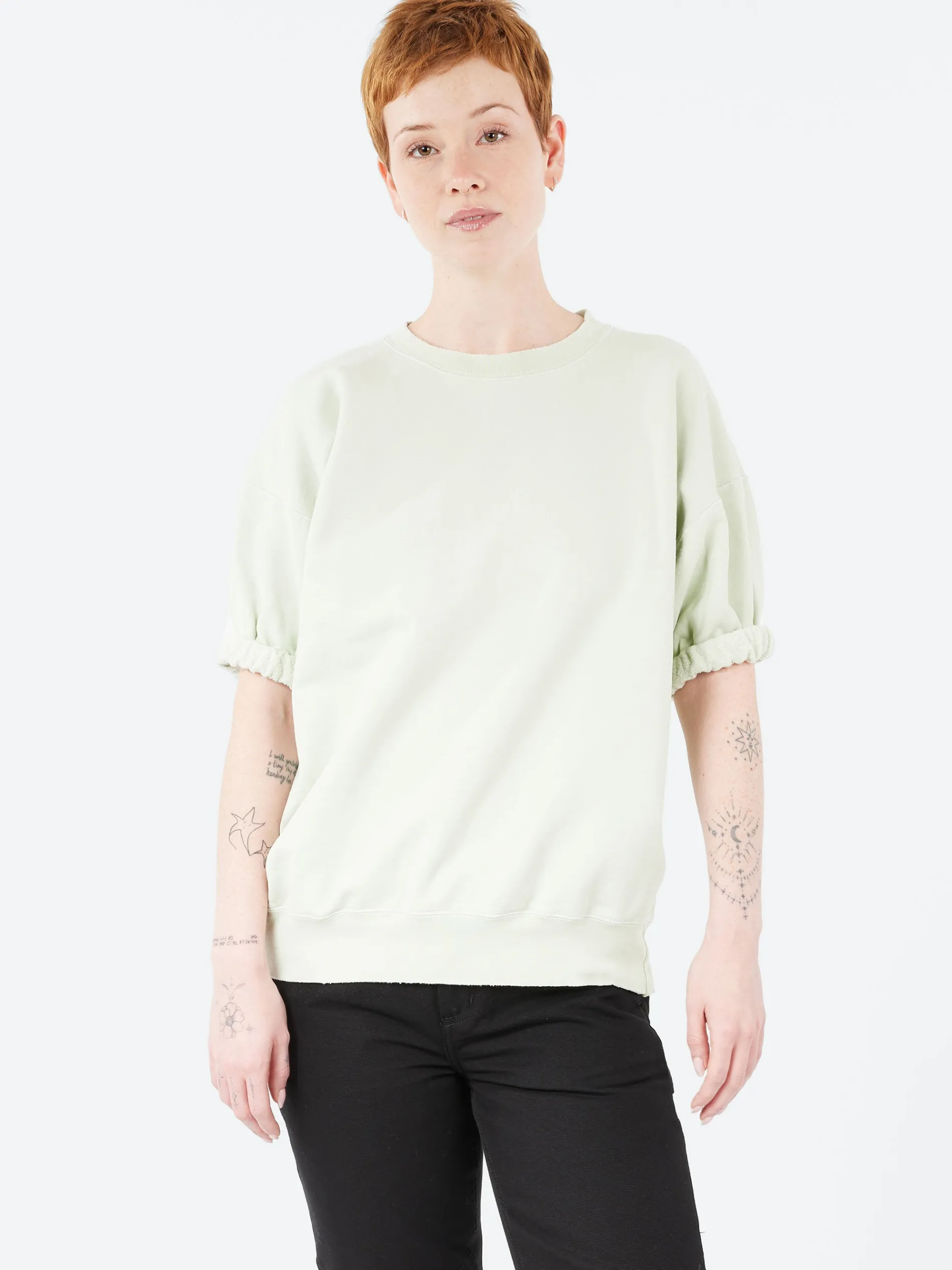 A short sleeve version of Rachel Comey’s essential Fond crewneck sweatshirt, now with a permanently rolled cuff and finished hemline.