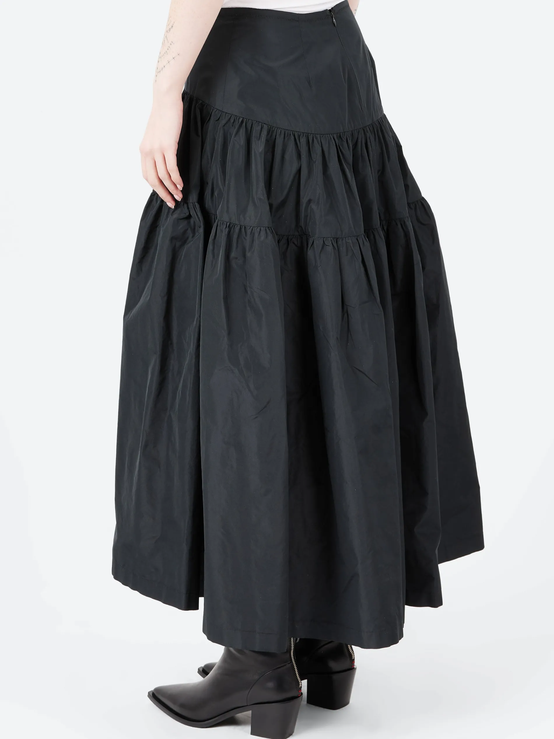 Gathered, tiered full skirt with a high-low hemline and zigzag stitching, in technical lightweight taffeta.