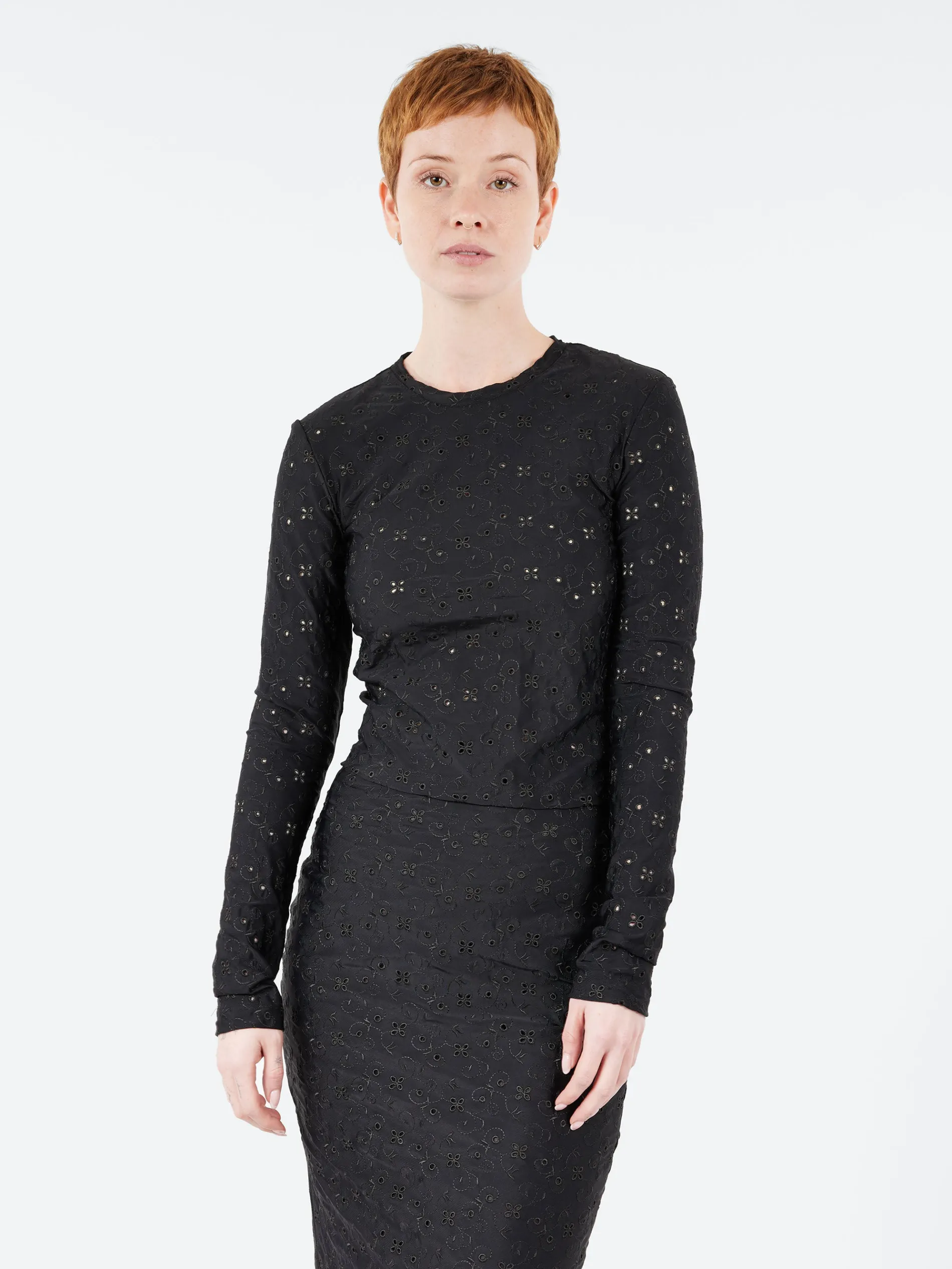 Long sleeve top featuring a round neckline and eyelet detailing throughout. Cut to a slim fit with a straight hem.