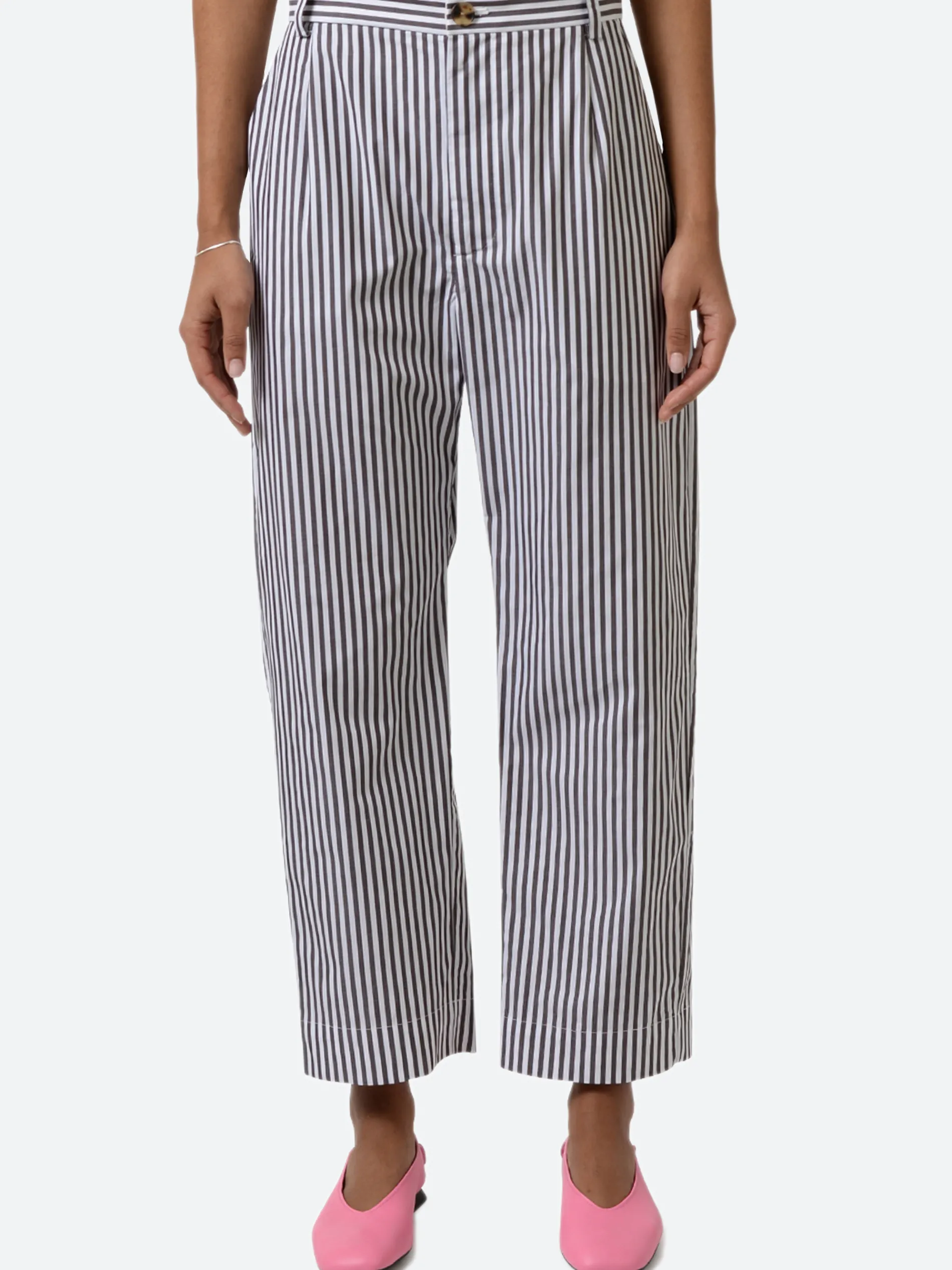 Classic flat-front, tailored pant, cut this season in preppy stripe shirting. This style sits at the natural waist and is cropped at the ankle.