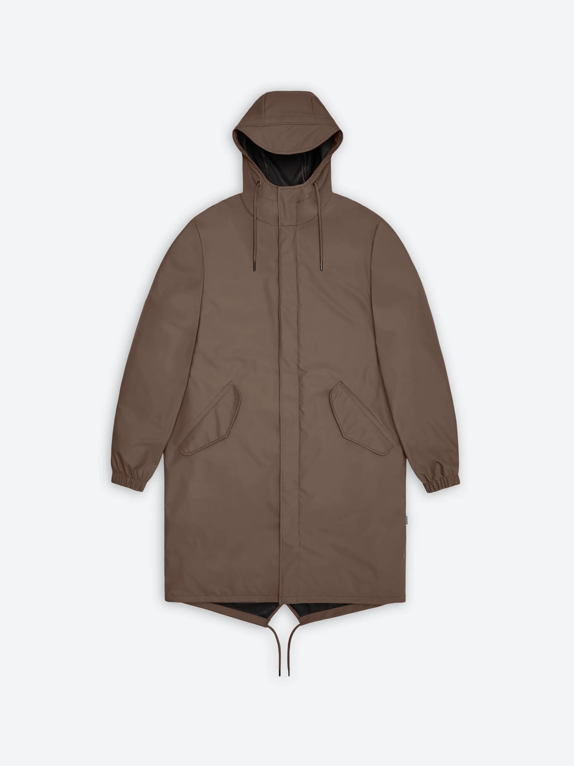 Rains Fishtail Parka is a unisex raincoat made from the brands signature waterproof fabric. It has a casual fit with a longer backside, featuring a signature fishtail drawstring for extra coverage in wet weather.