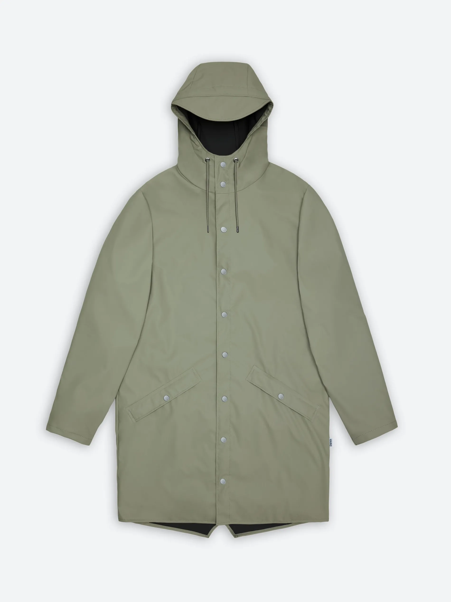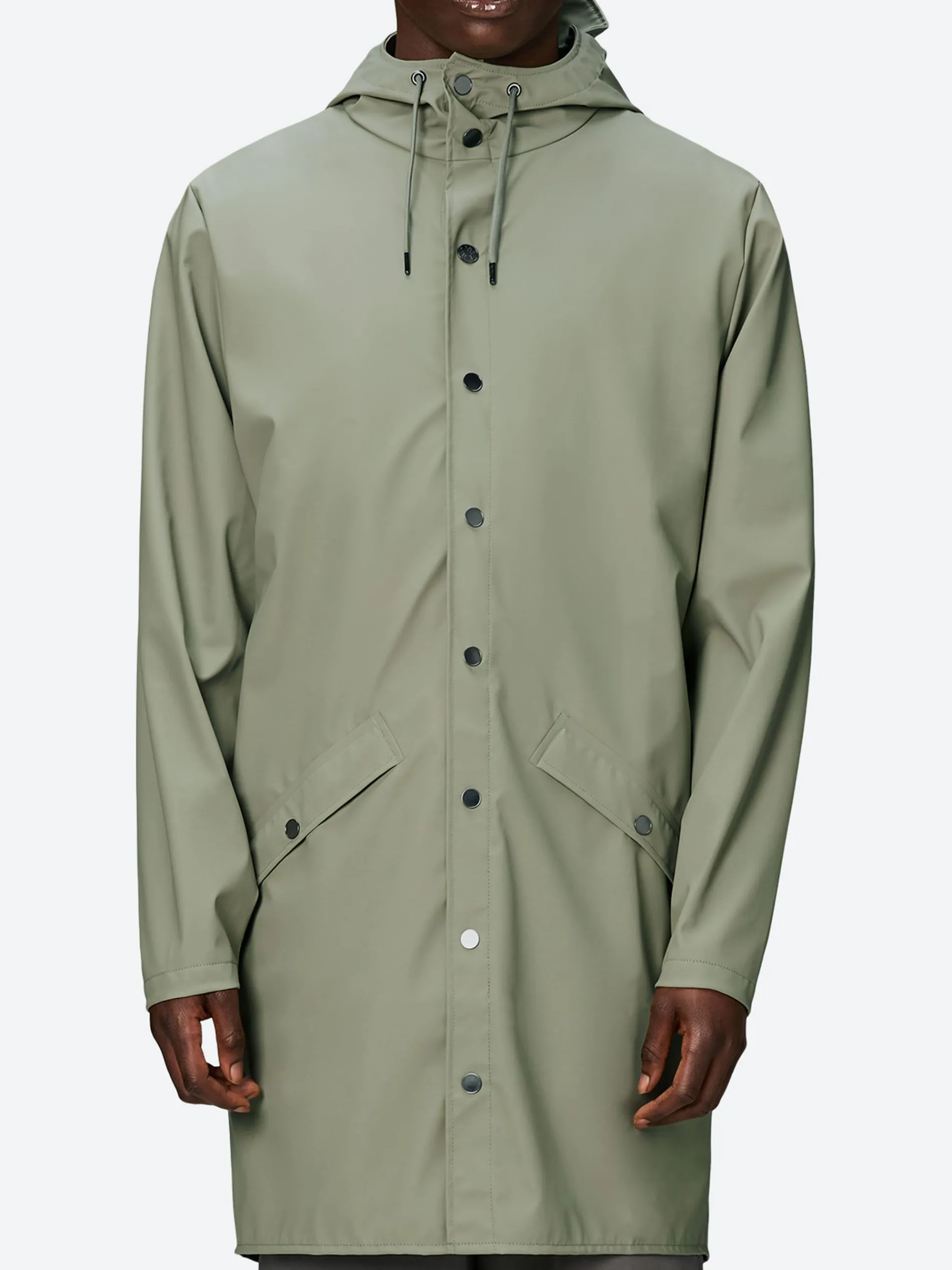 Rains Long Jacket is made from a water-resistant lightweight fabric with a matte finish. This unisex rain jacket is designed in a casual raincoat silhouette with an elegant appearance.