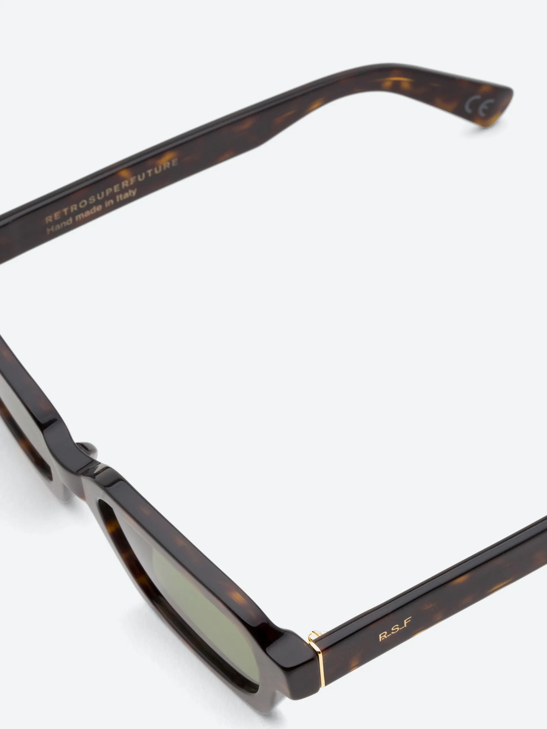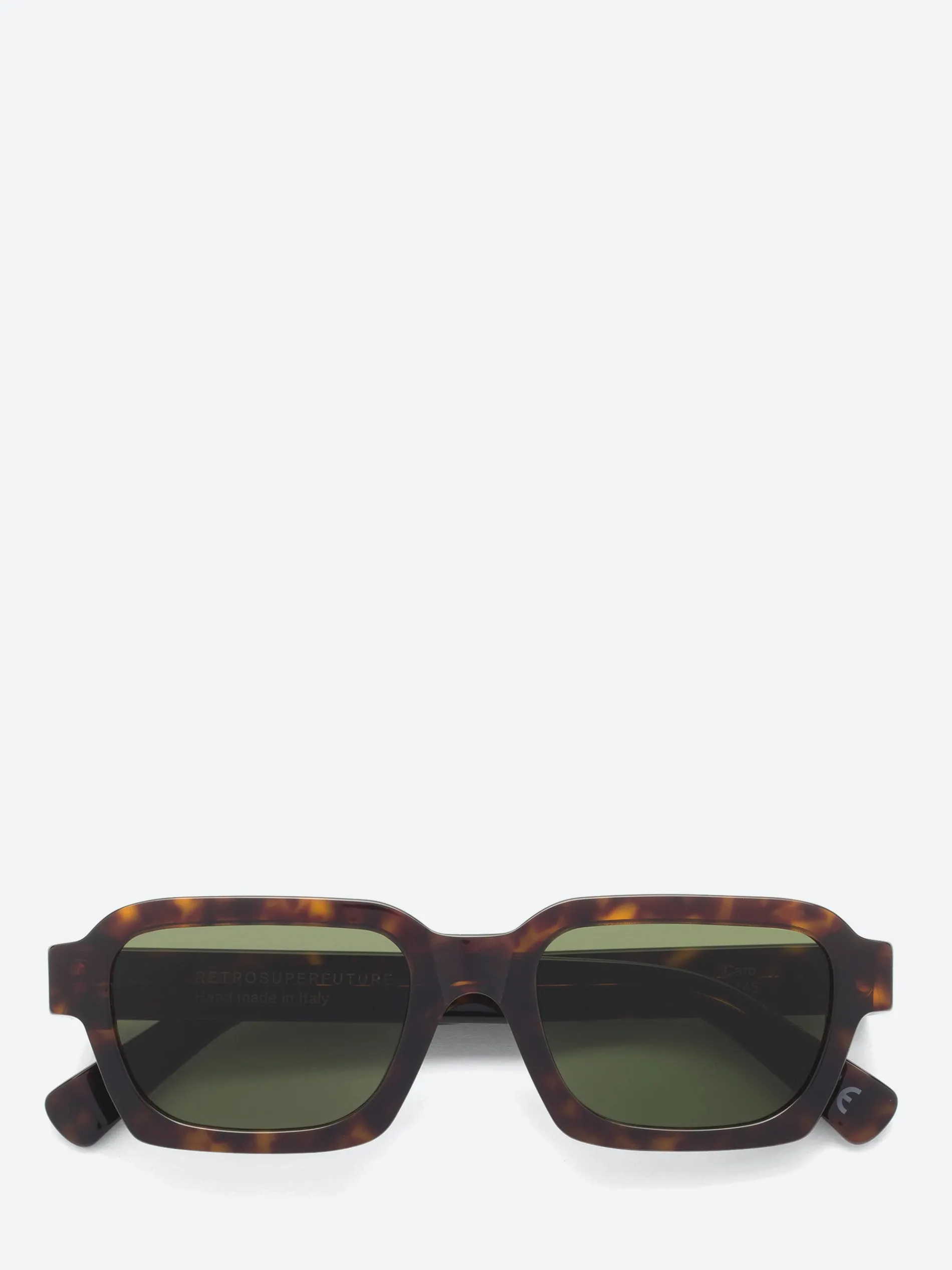 Caro is a wide, geometric silhouette that blends 1960s Italian classicism with 1990s grunge aesthetic. The model features a well-rounded design with a thick, sturdy acetate structure, squared temple tips and angular rims on the lower half of the frame. This version of Caro comes with bottle green lenses and spotted Havana acetate.