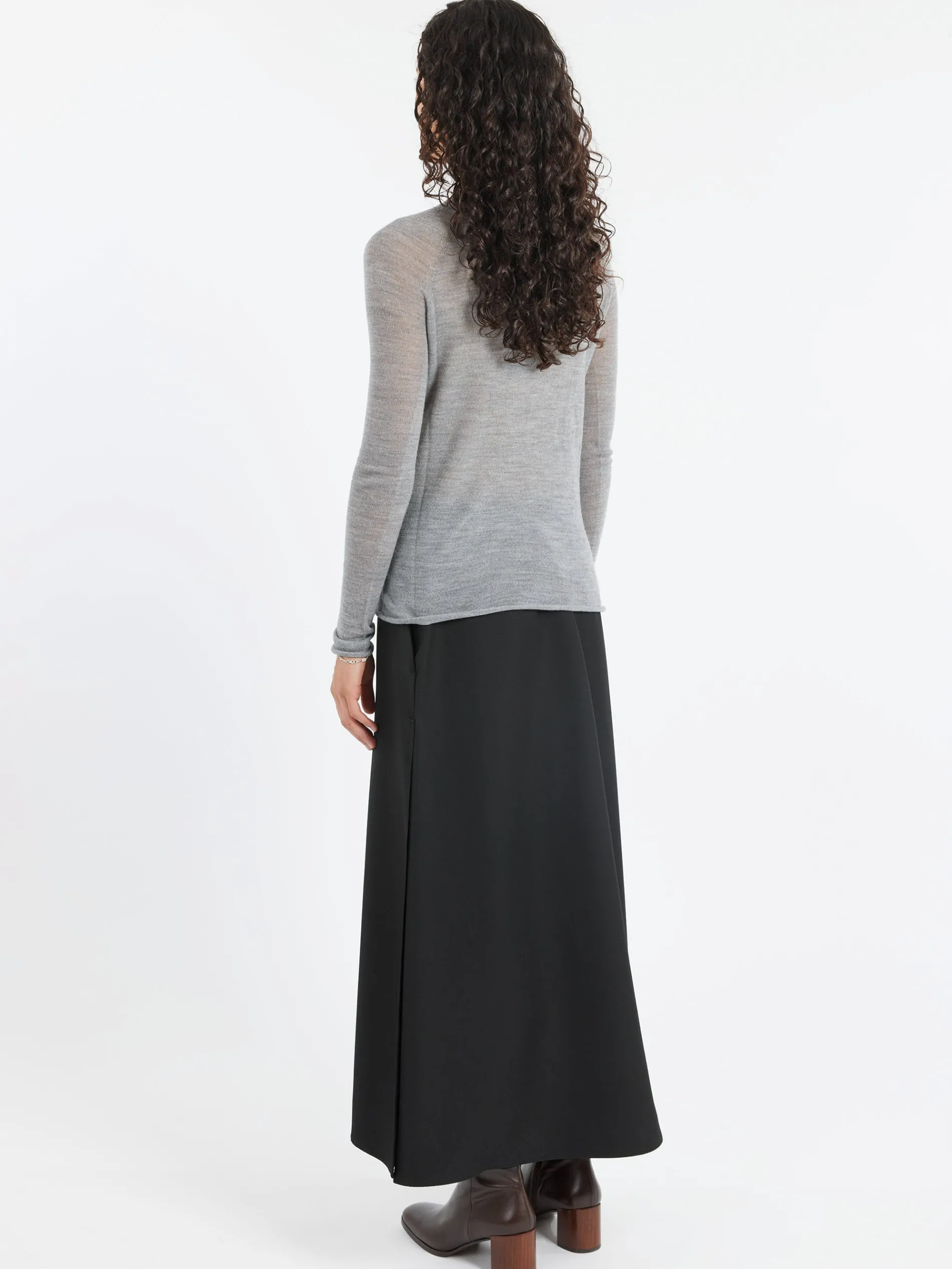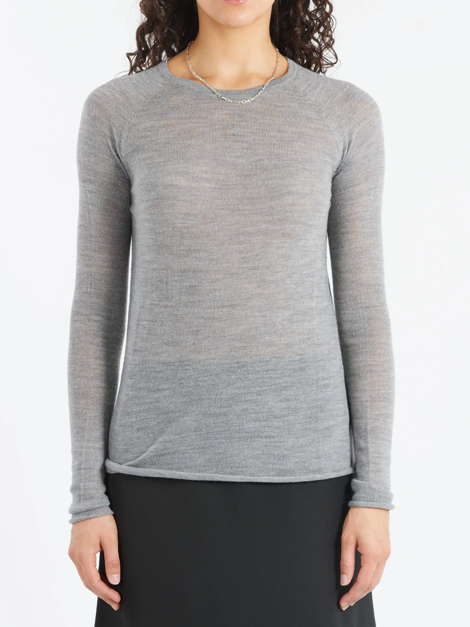 Pure merino wool top with a regular fit and a semi-sheer effect. This item is soft and ultra-light, with clean edges on hem, cuffs and neckline for a minimal finish.
