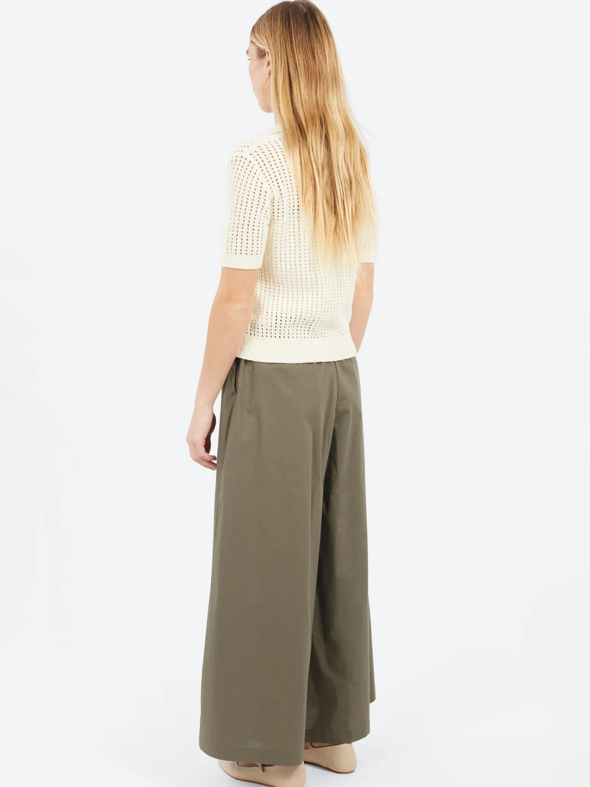 The polo shirt turns into a delicate and feminine garment thanks to the micro openwork that creates a see-through effect. Combine it with wide light trousers or shorts in neutral tones and add minimal accessories to top off the look.