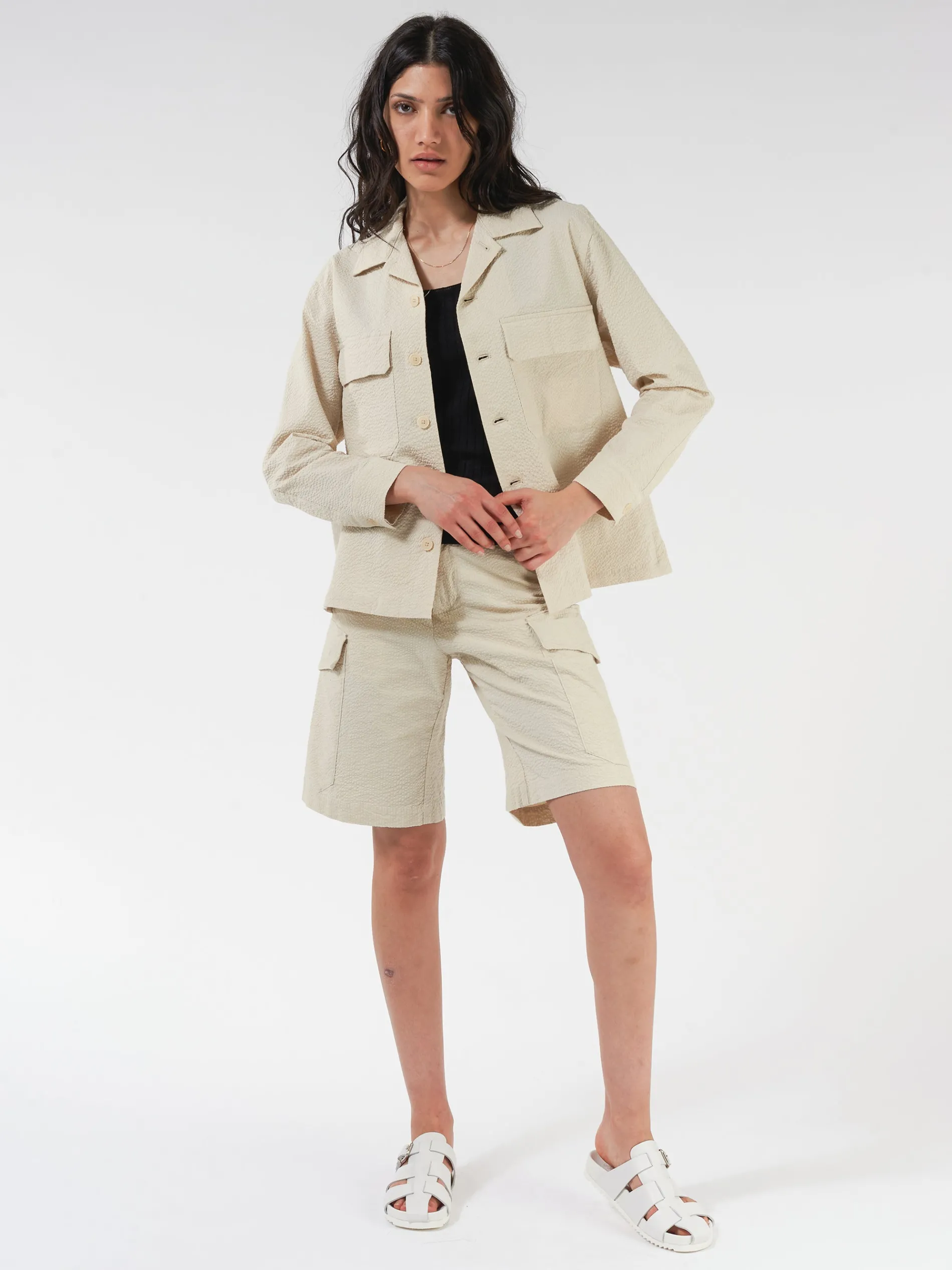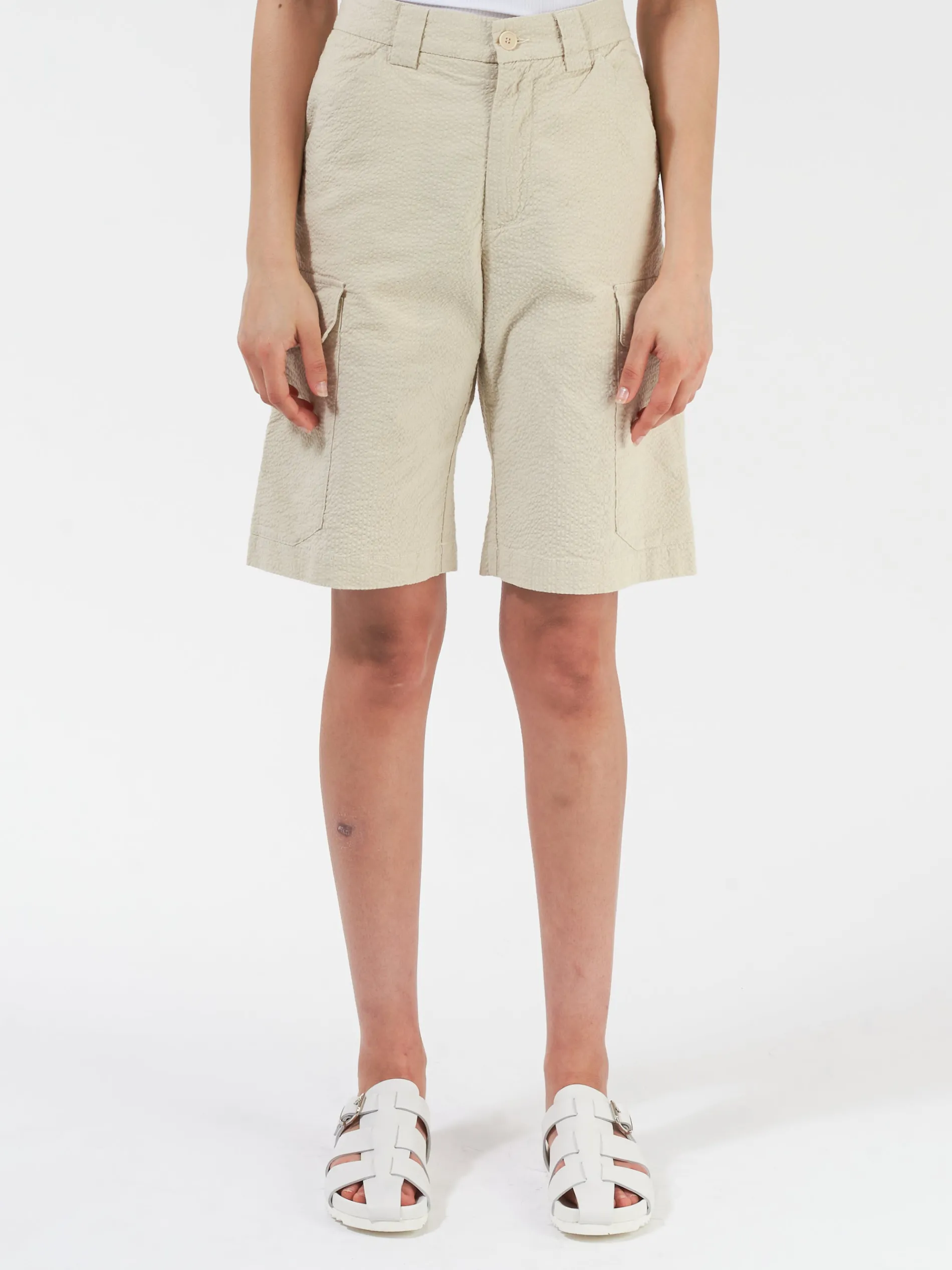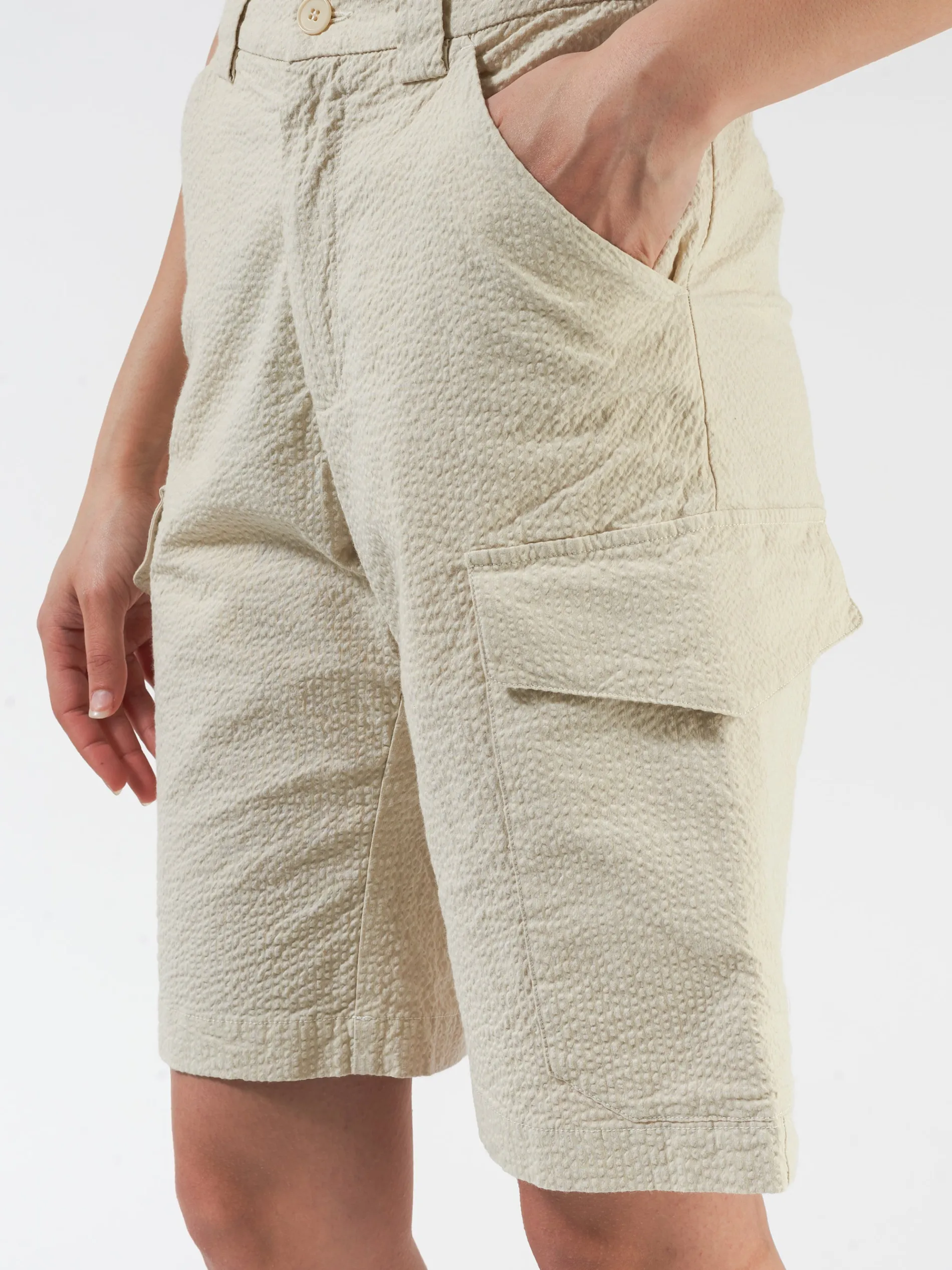 Barena cargo short with side patch pockets made in cotton stretch seersucker fabric.