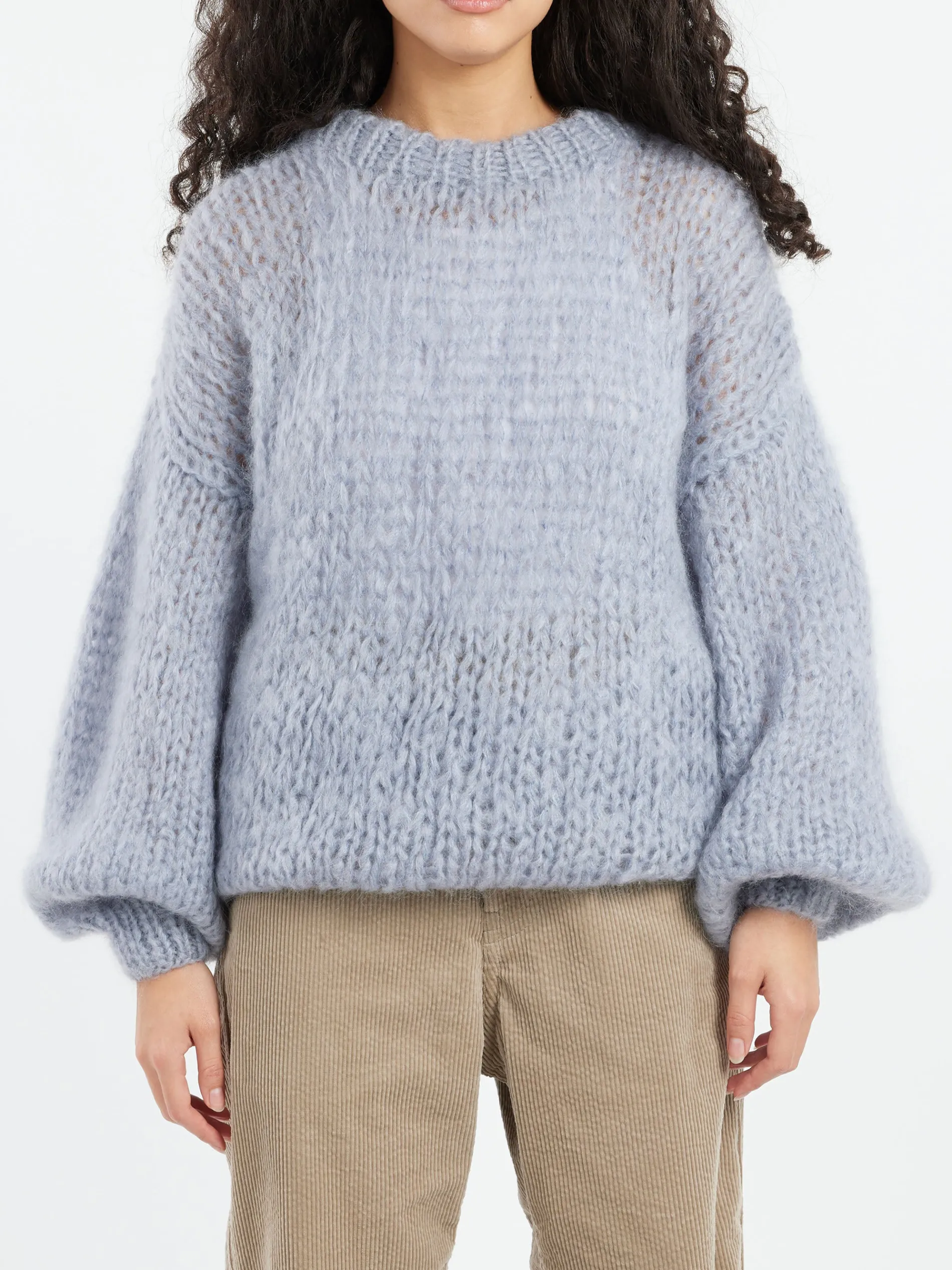 This sweater is made from a soft mohair-merino blend, providing a luxuriously textured and cozy feel.