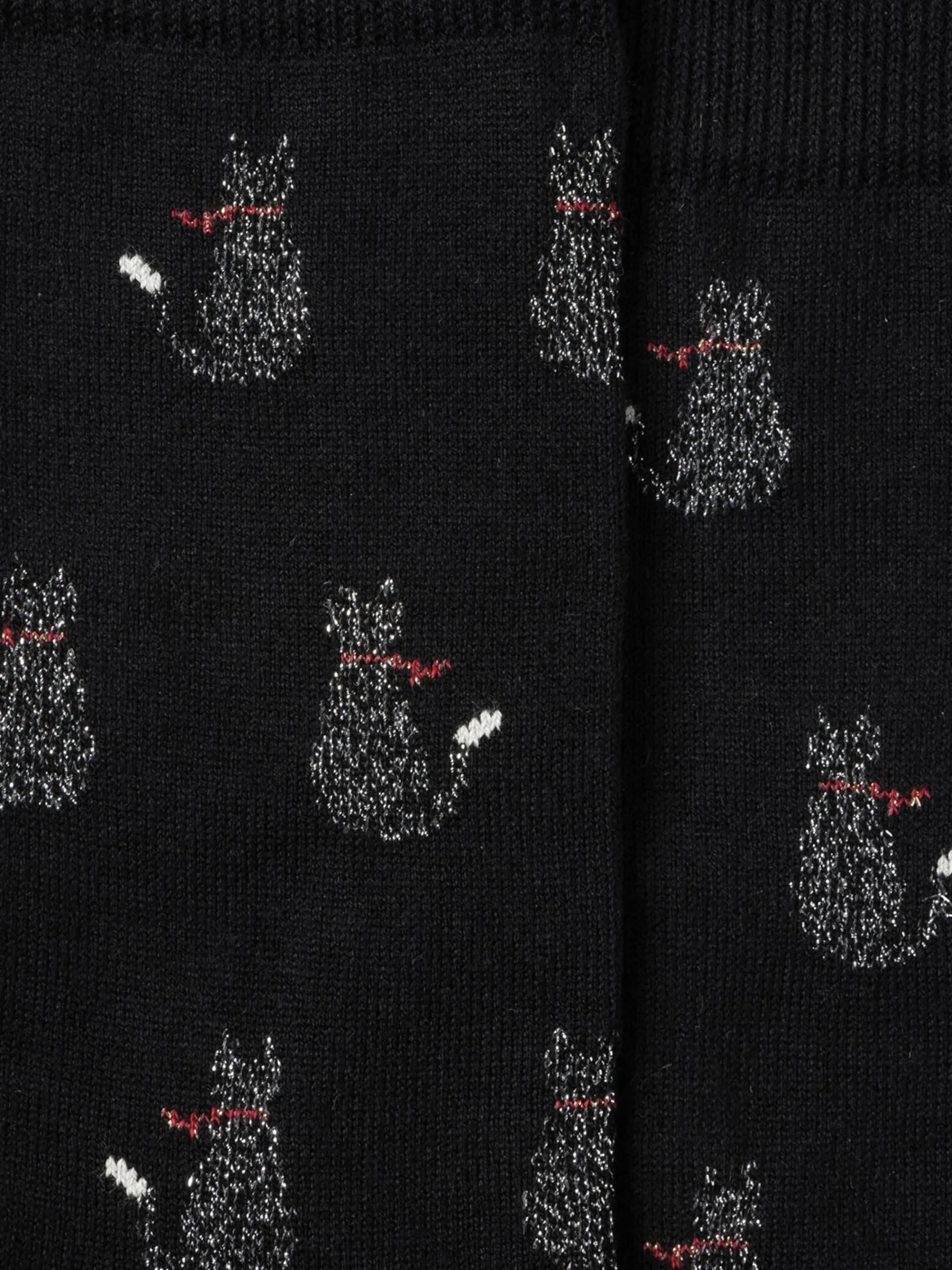Black cat or calico cat. This sitting cat, seen from behind, adds its feline charm to these socks, aptly named Mistigri.