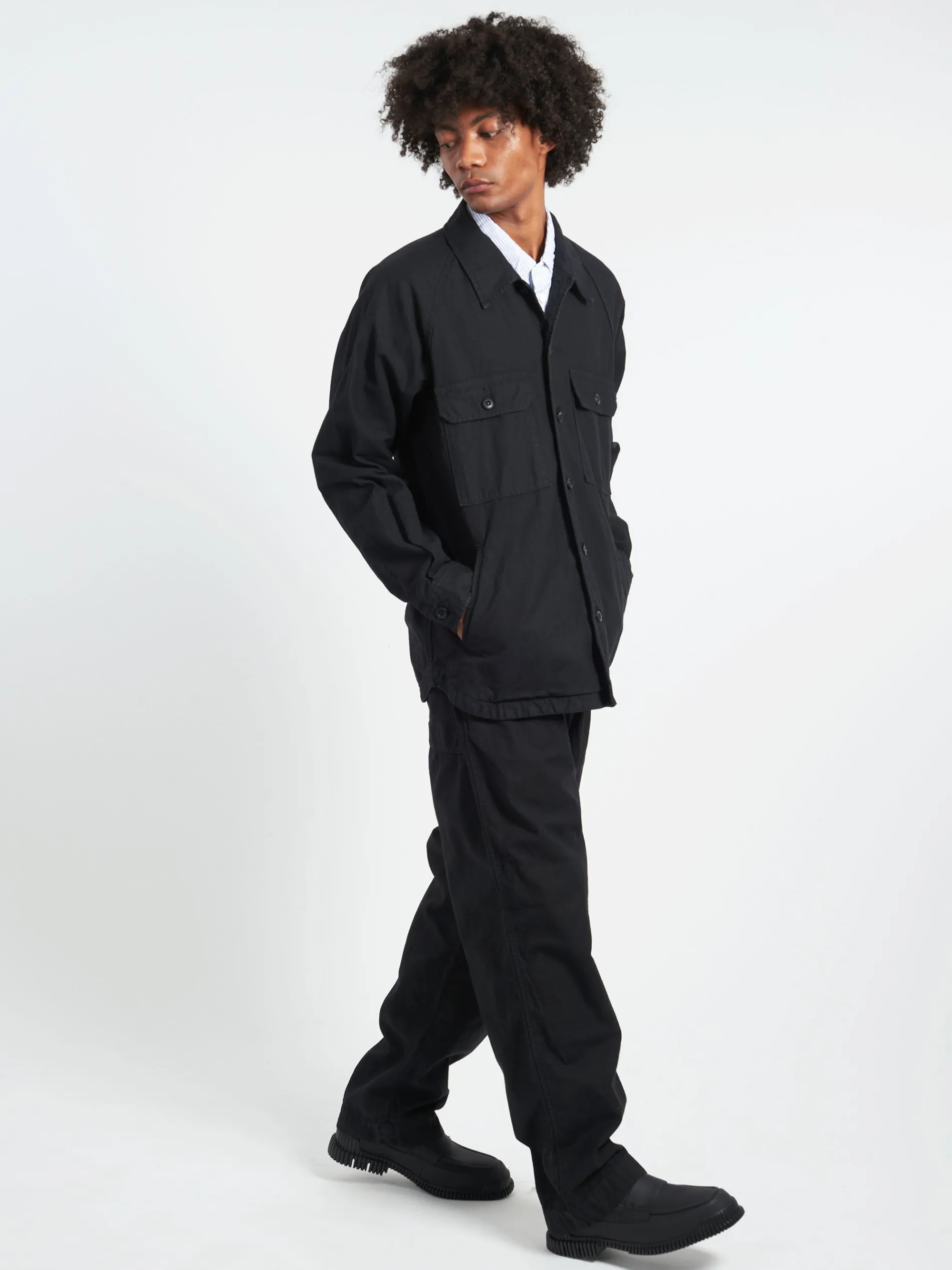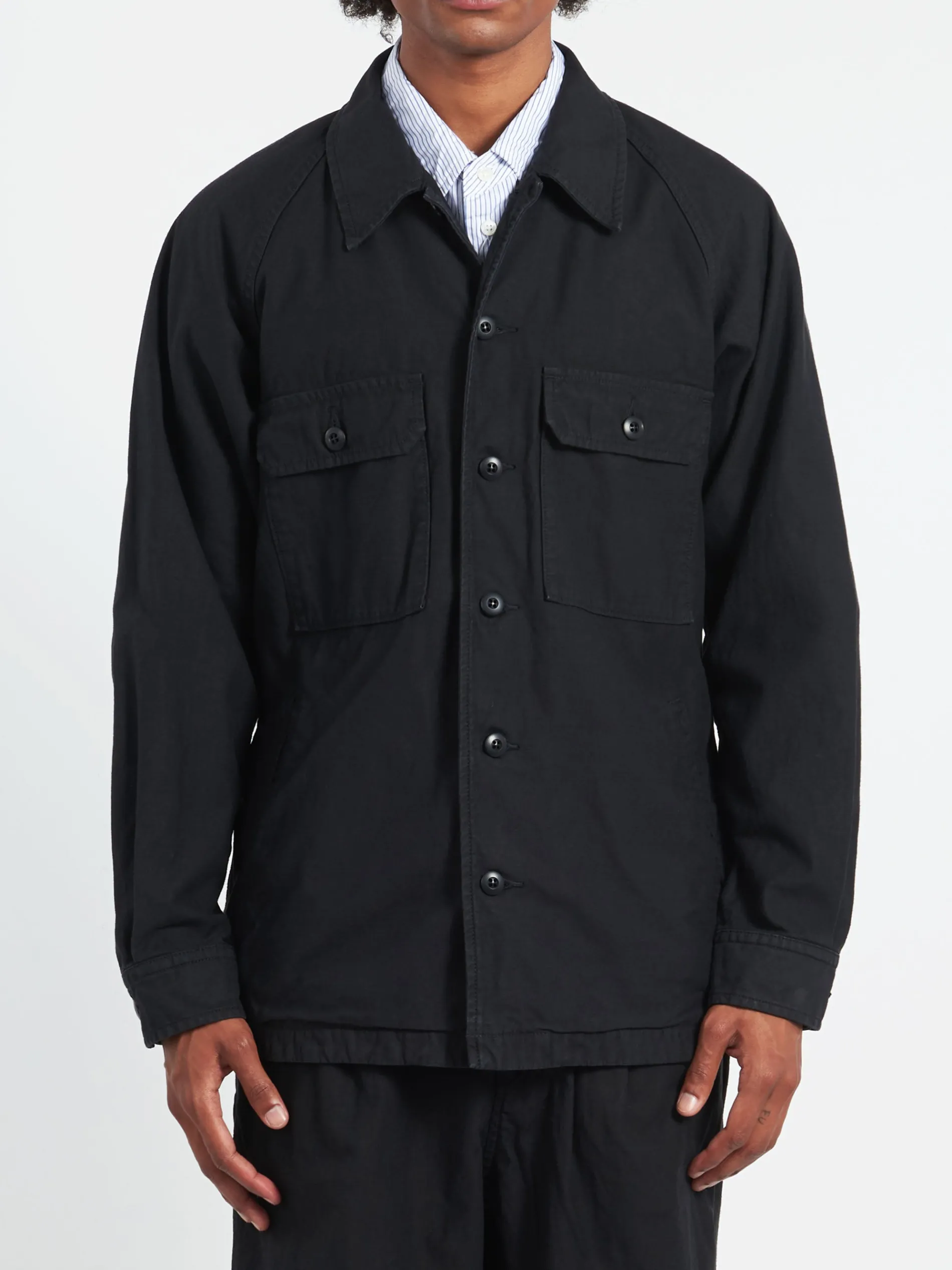 A shirt jacket with a standard body and boxy silhouette. Crafted from a back satin material woven with cotton linen threads at a high density, and has been washed to give it a worn-in look.