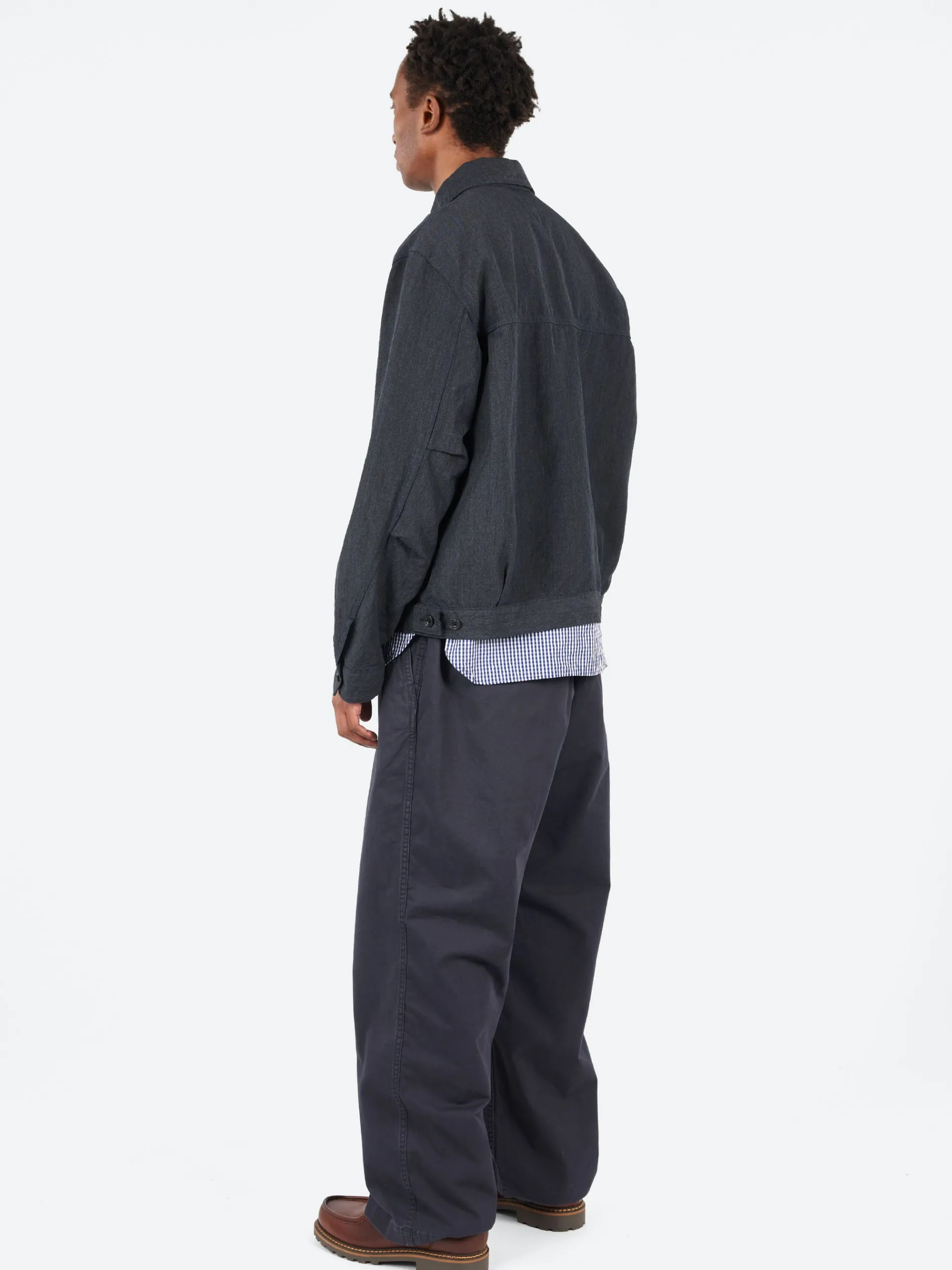 This loose-fitting short jacket features dropped shoulders and sleeves that are curved like an MA-1, adding a unique and stylish touch. It includes work-style pockets and subtle color stitching, enhancing its overall design. The outer material is a finely woven plain weave fabric made from yarn-dyed wool linen, crafted to the limit for a refined, textured finish.