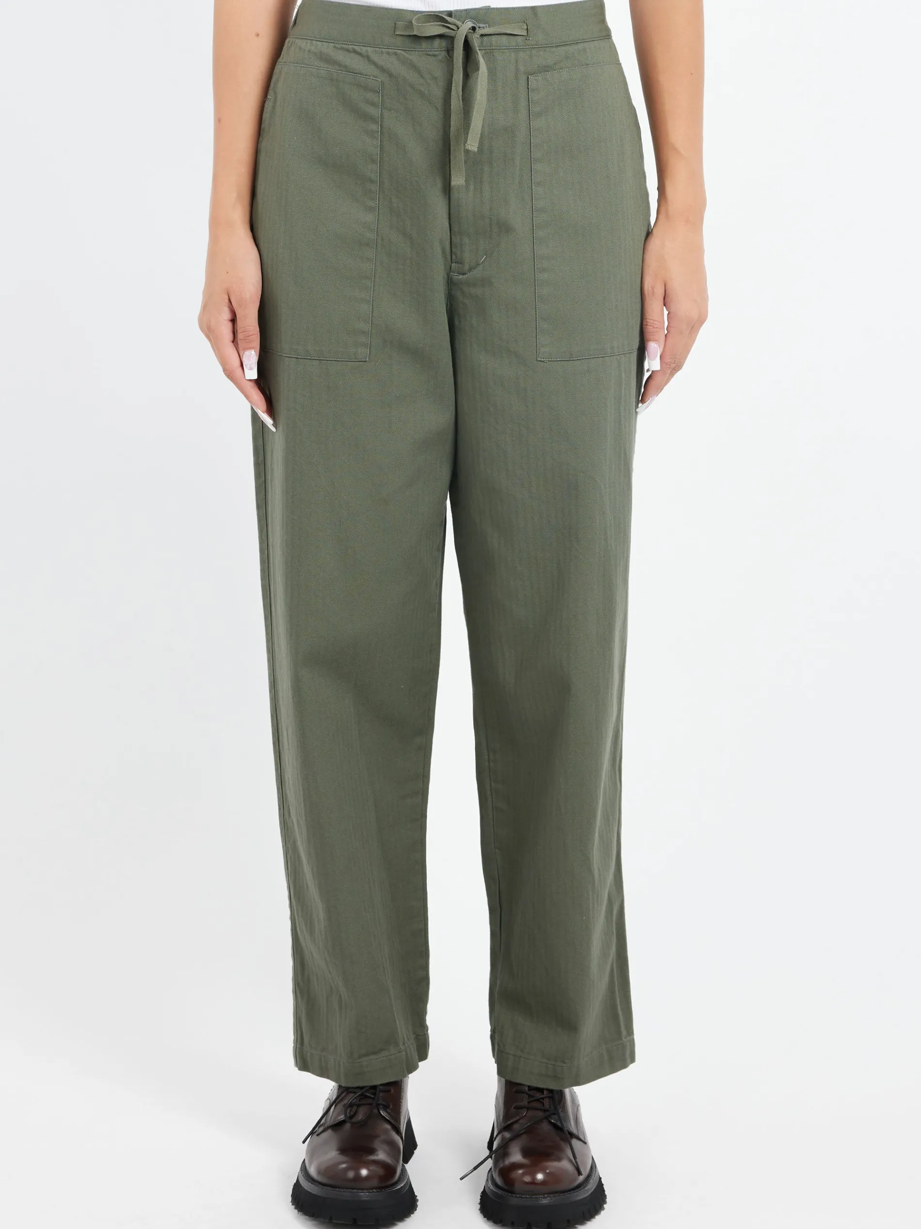 Sarahwear work pants with a tapered silhouette. Made from a cotton herringbone with a striped woven pattern unique to twill weave.