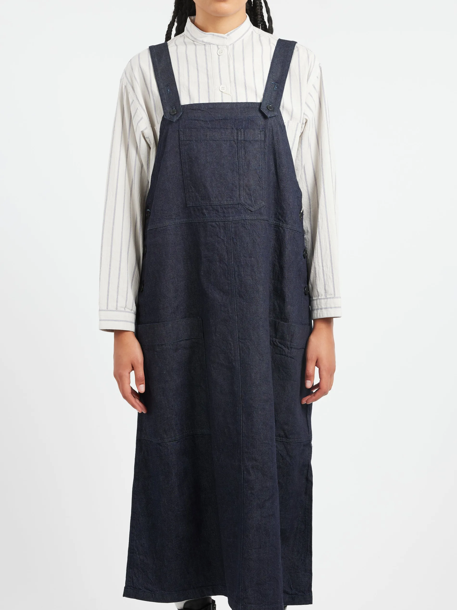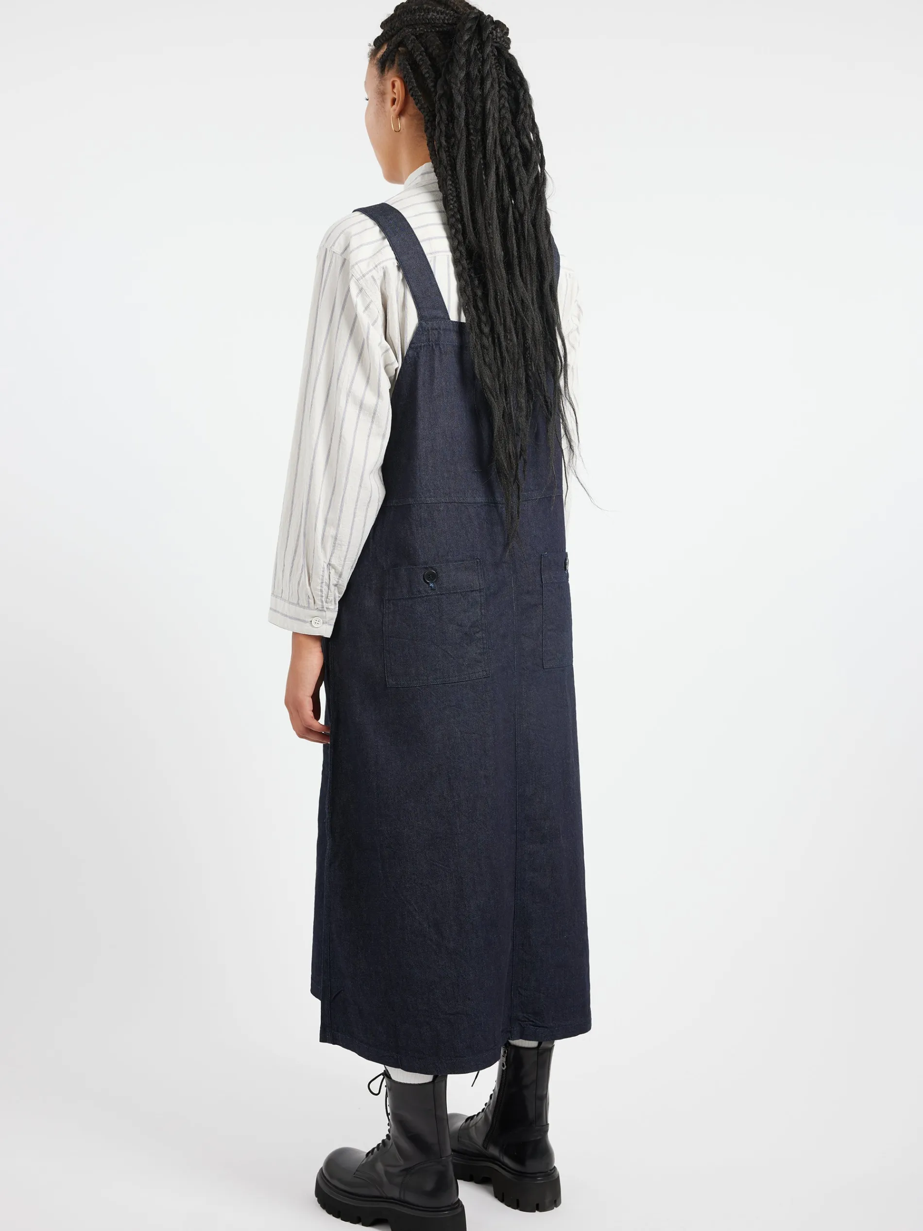 The Sarahwear Ranch jumper dress is made of an indigo cotton denim with a utilitarian feel – it can be worn year-round depending on what you layer it with.