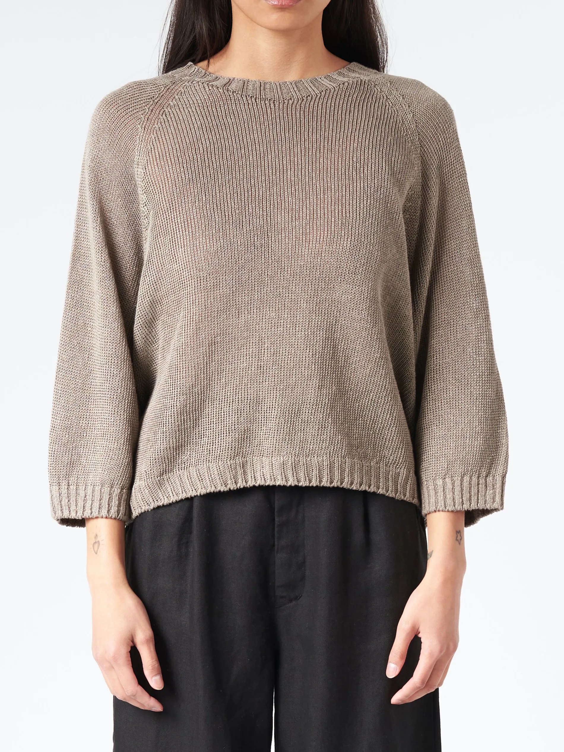 This easy summer knit from Sarahwear is breathable and comfortable to wear all season long. Made from a slightly transparent linen yarn with subtle sheen, the cropped raglan sleeve and loose silhouette make for effortless layering.