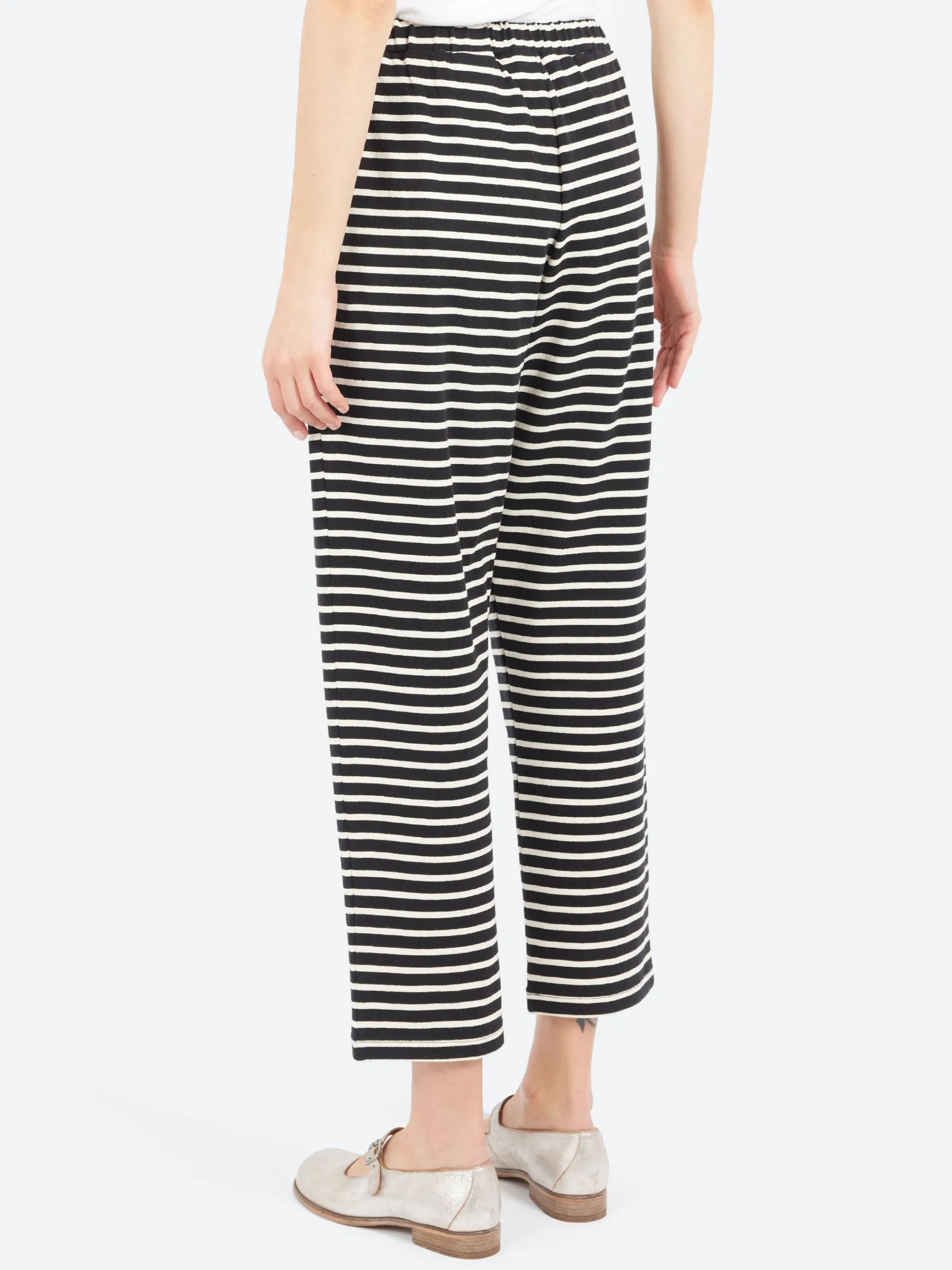 The Sarahwear Striped Pants featuring an elasticated waistband that can be adjusted with an internal drawstring for a customizable fit. Made from jersey fabric tightly knitted with a unique twisting technique, the yarn creates a firm texture with a fluffy feel that’s soft to the touch. This special construction gives the pants a vintage look, making them both stylish and comfortable for everyday wear.