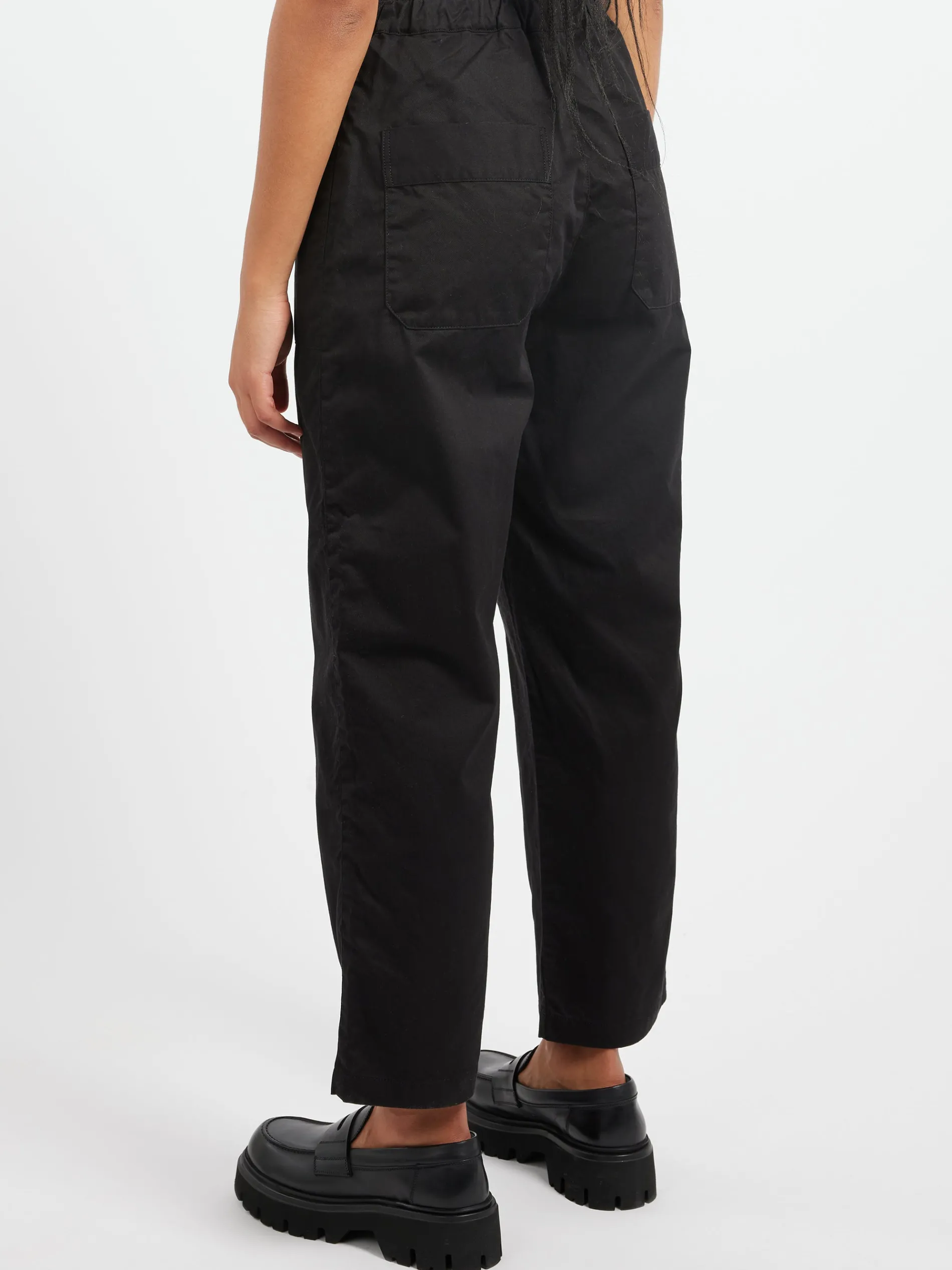 Sarahwear work pants with a tapered silhouette that is loose around the waist and narrows towards the hem. The back of the waist is elastic and can be tightened with a drawstring at the front. Crafted from a chino cloth made of organic cotton and has a smooth, slightly brushed surface.