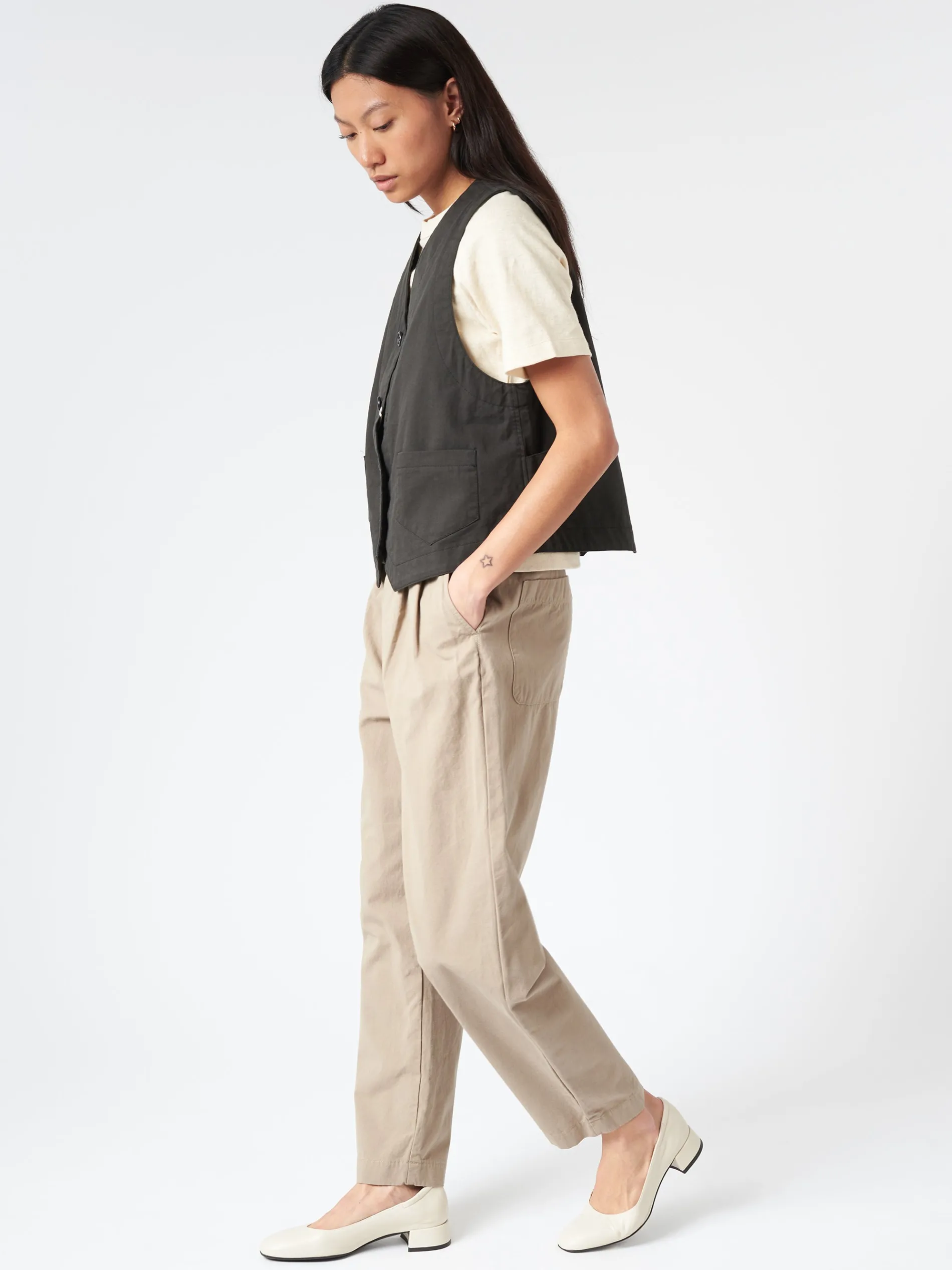 Sarahwear pleated-front tapered pants made from crisp cotton weather cloth, a densely woven fabric with firm structure.