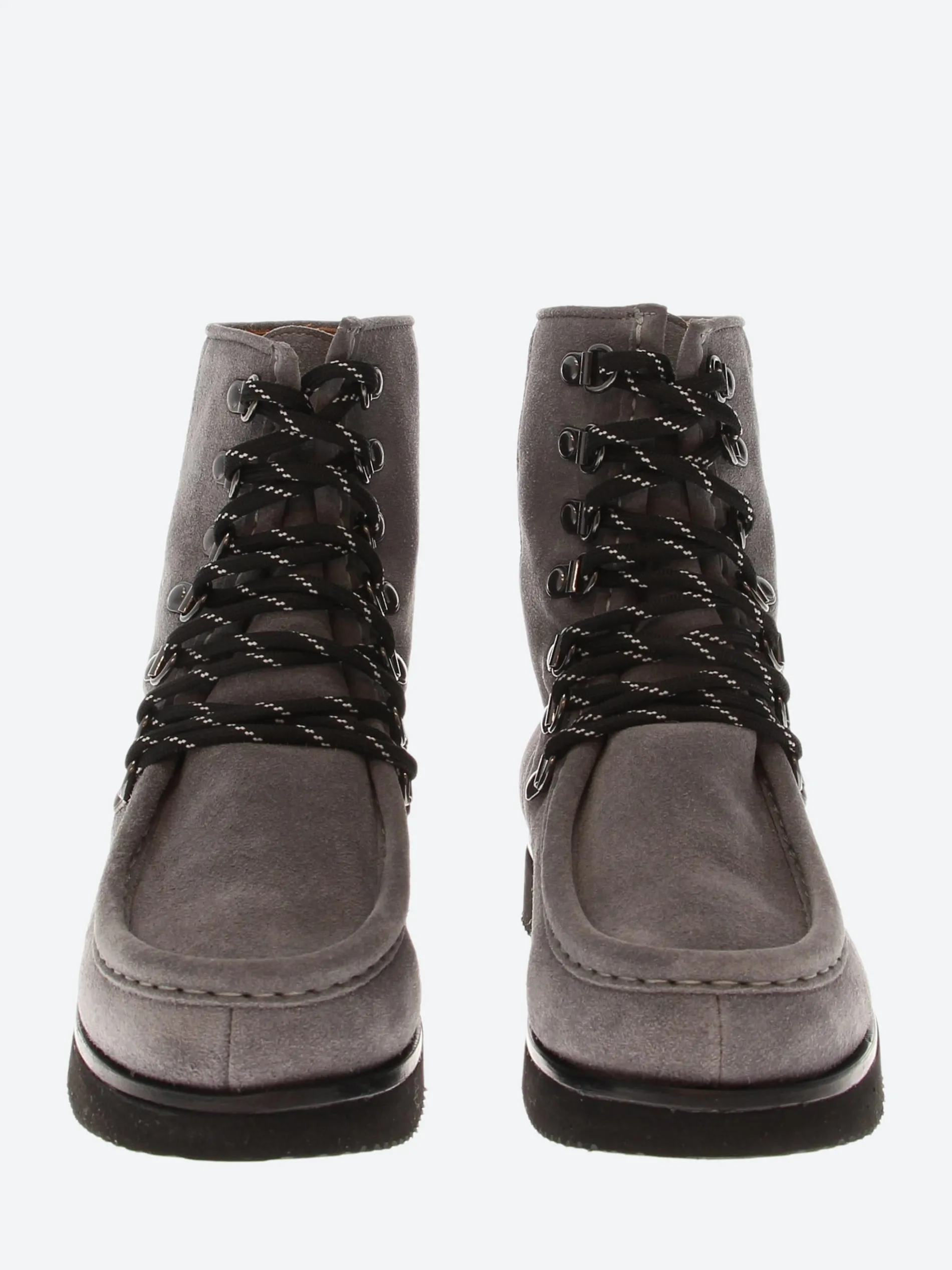 Handsewn moc toe boots in suede skin, calf lining, leather innersole and Vibram eva outsole.