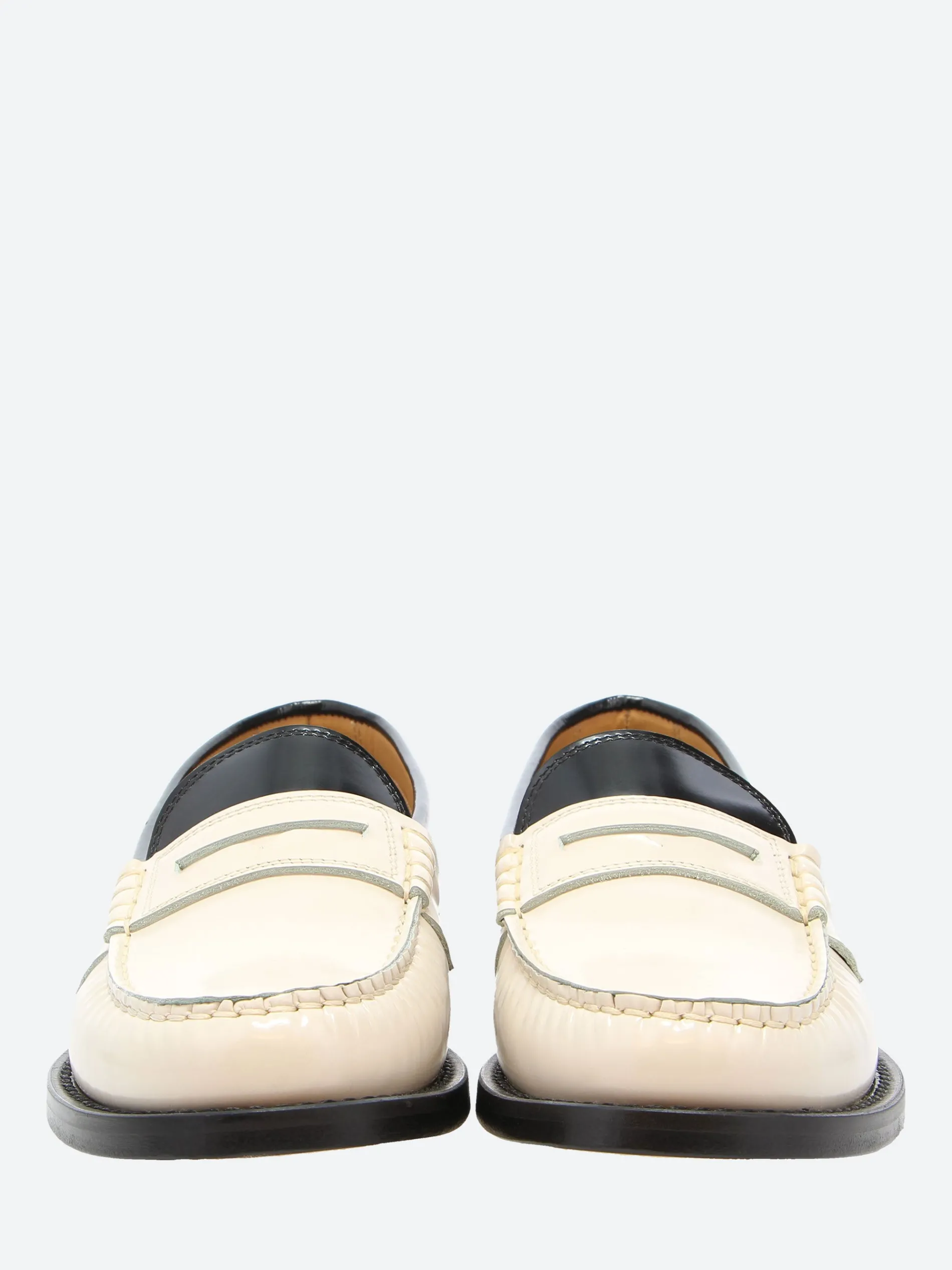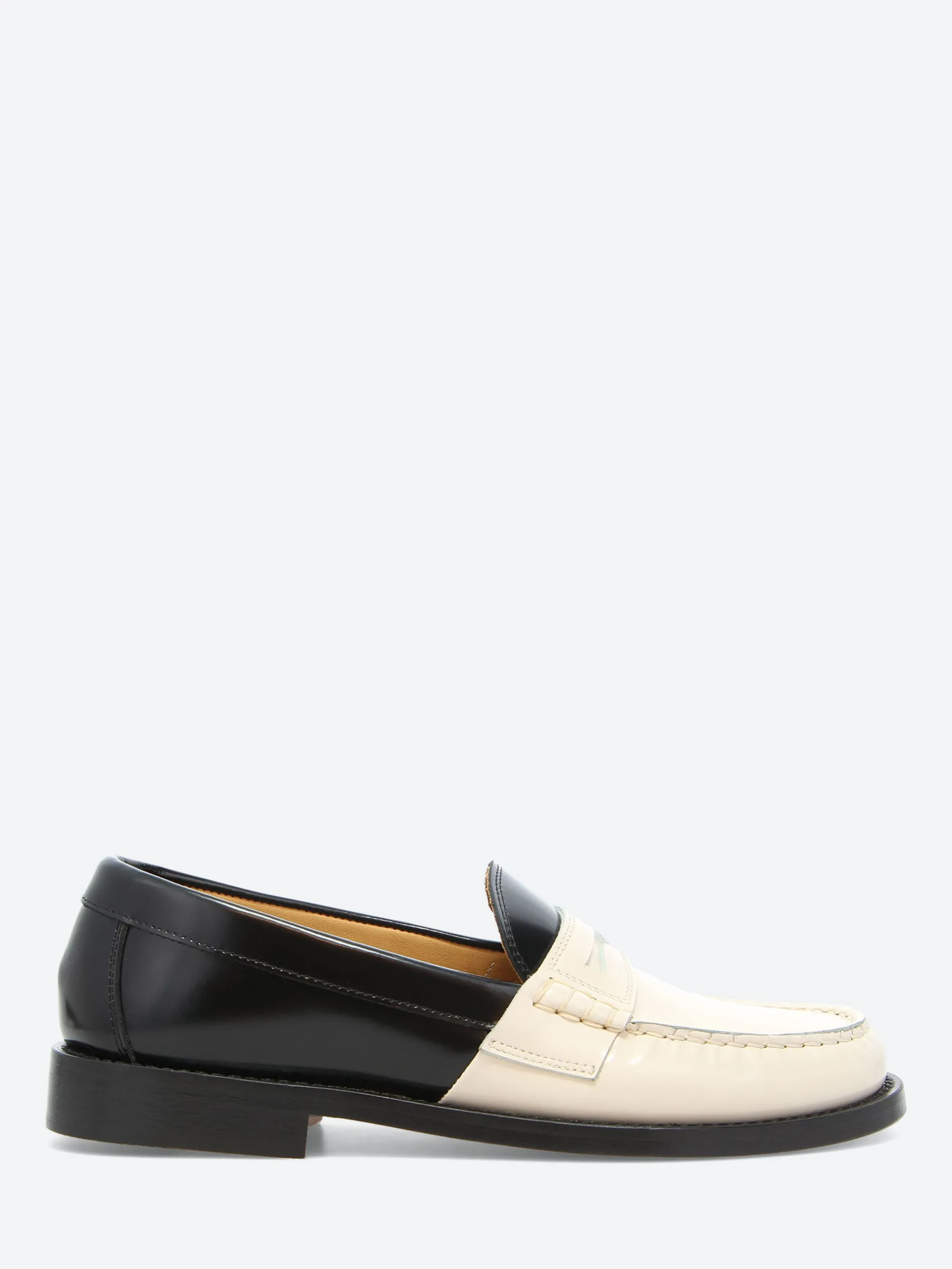 Handsewn two-tone penny loafers made from brush-off cow leather, finished with a handmade leather outsole with anti-slip rubber heel insert.