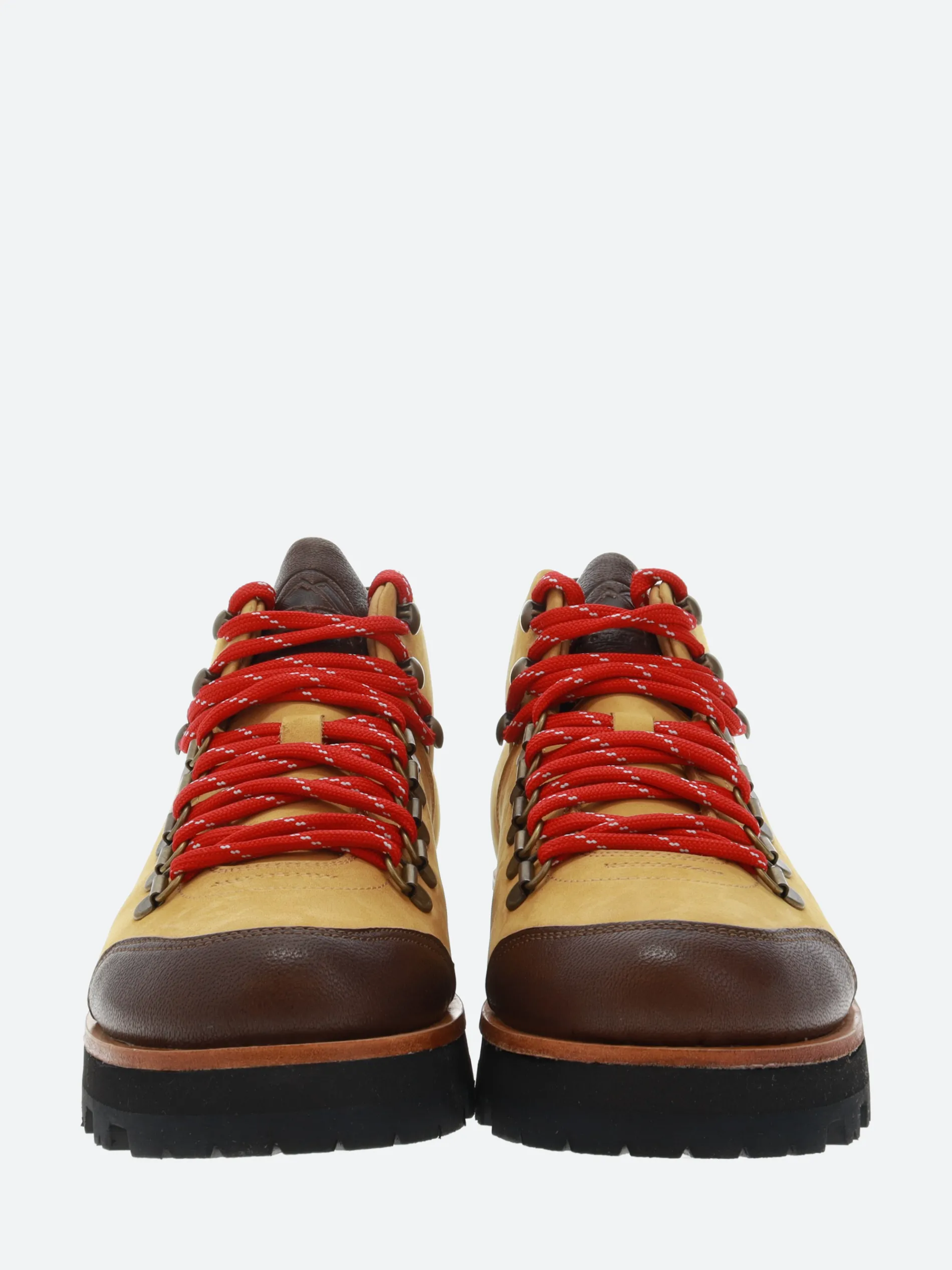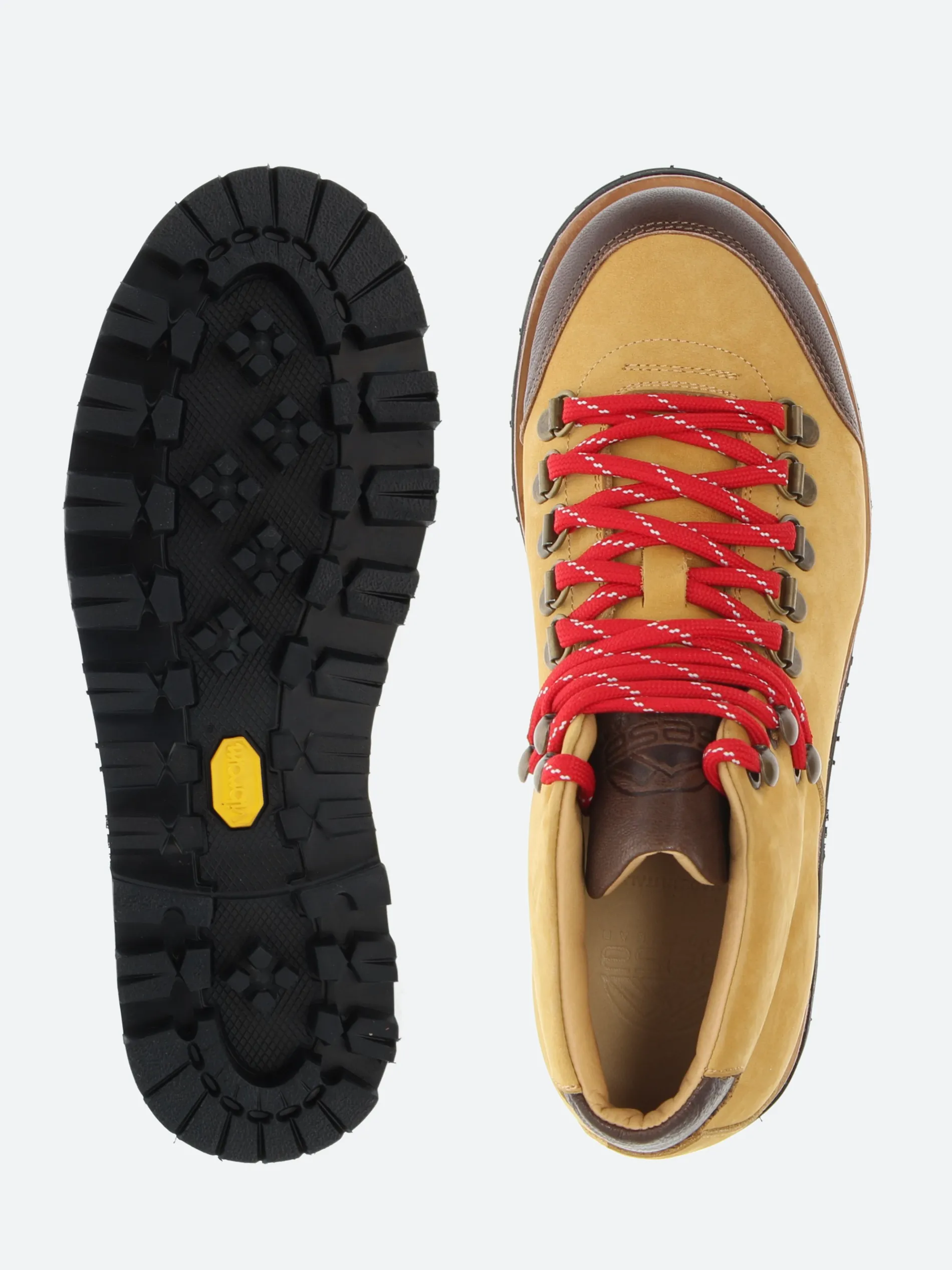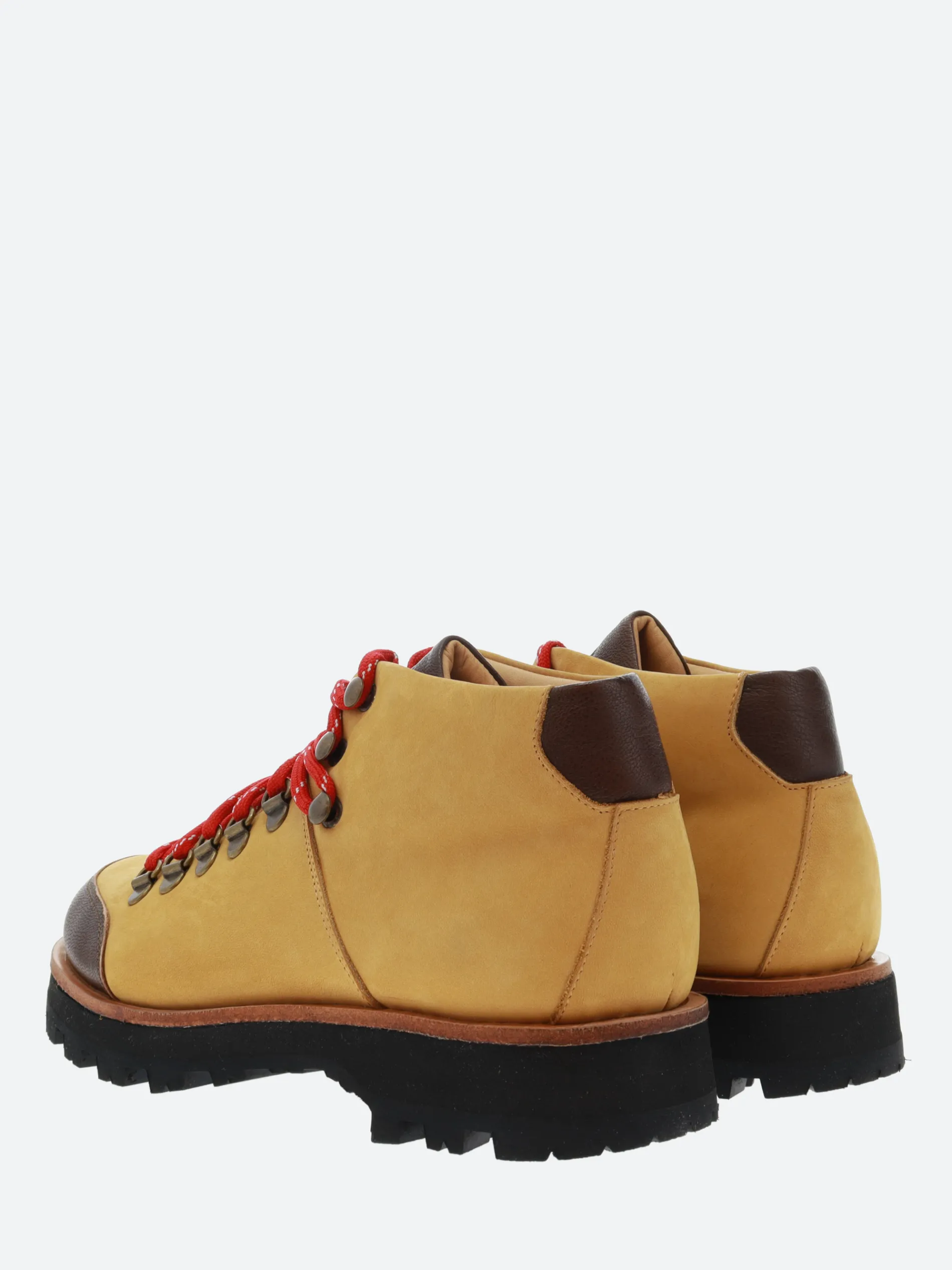 Mountaineering boots in cow nubuck, calf lining, Blake stitched in leather midsole with Vibram Teton rubber outsole.