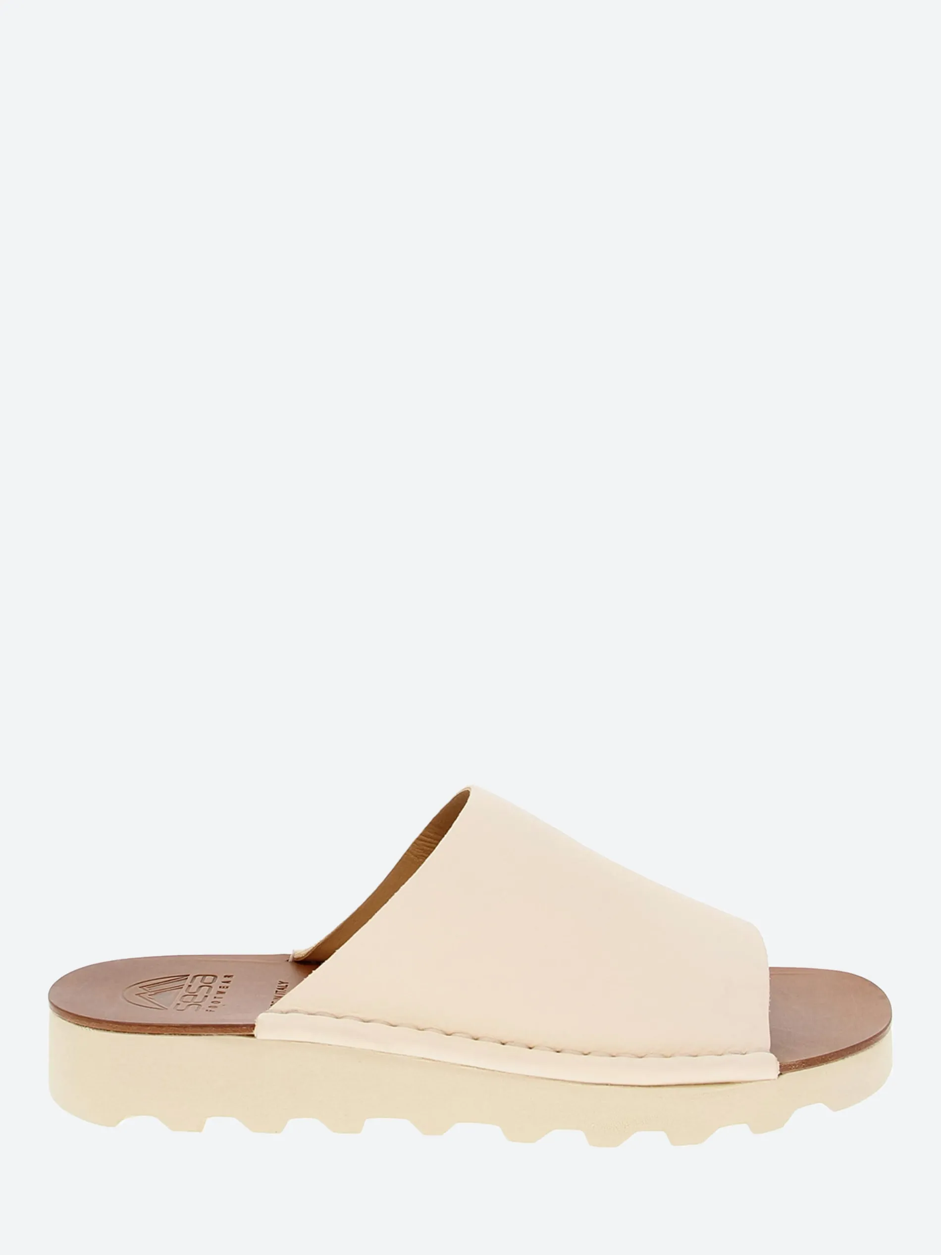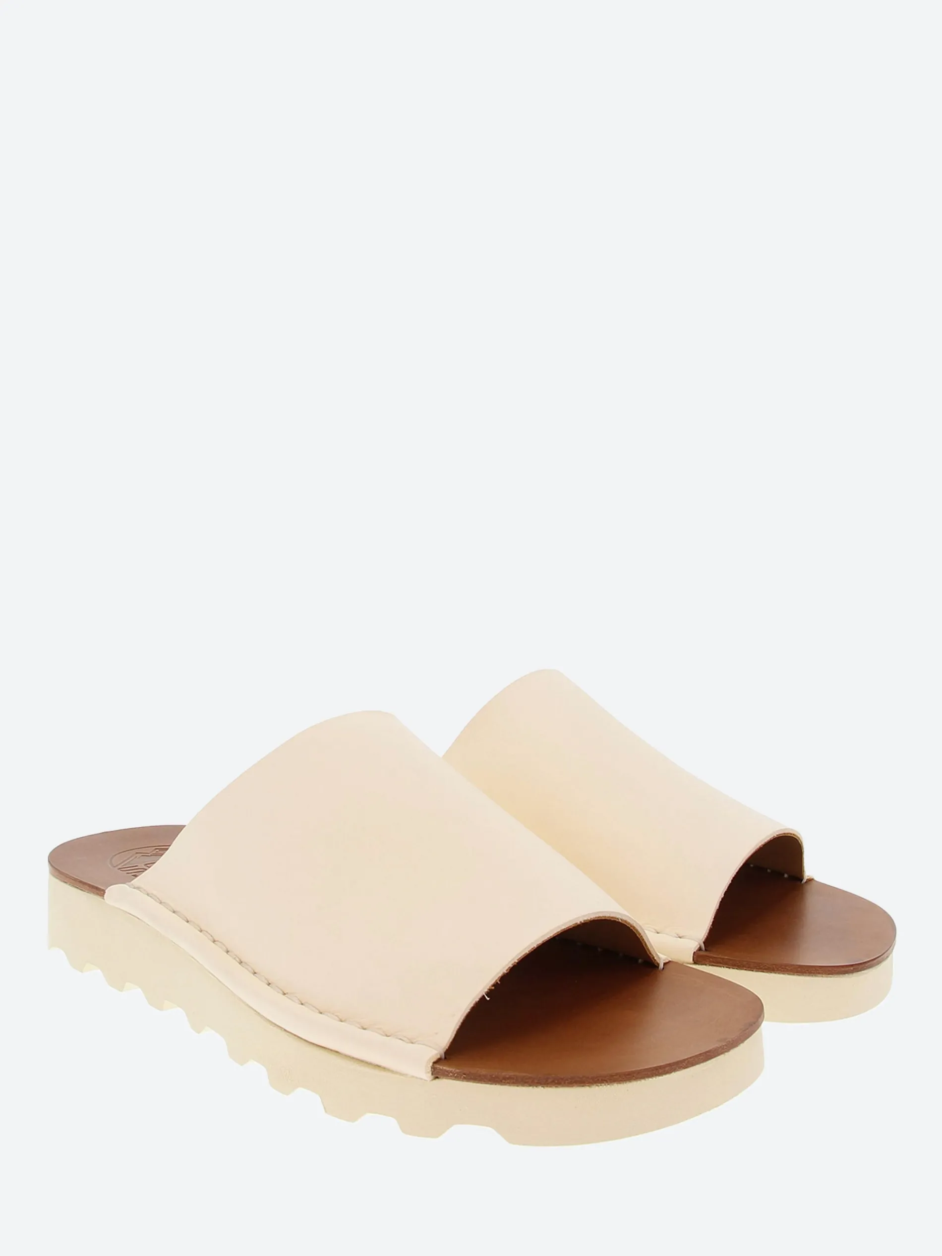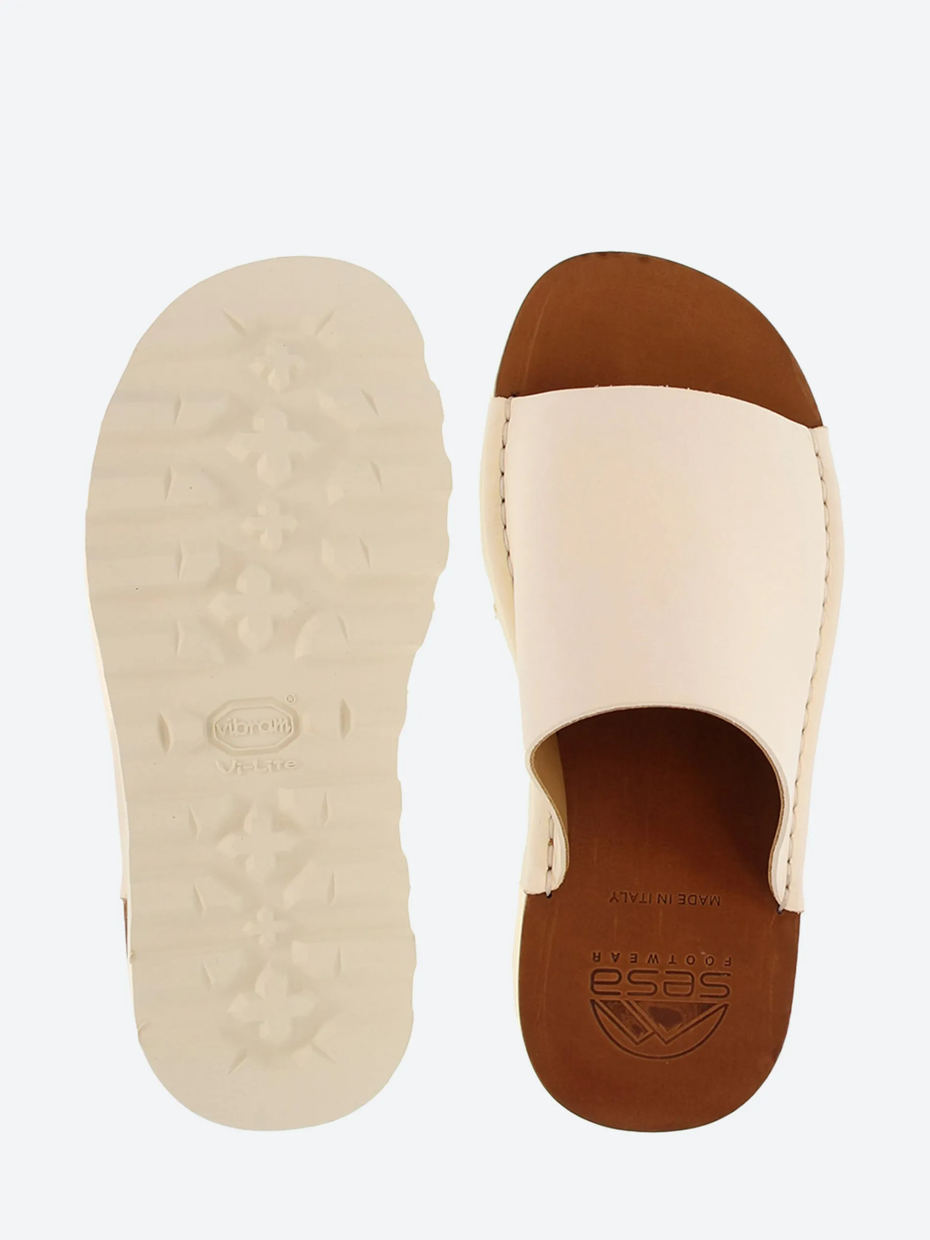 Slippers in vacchetta hide, handsewn in leather midsole, with calf lining and Vibram eva outsole.