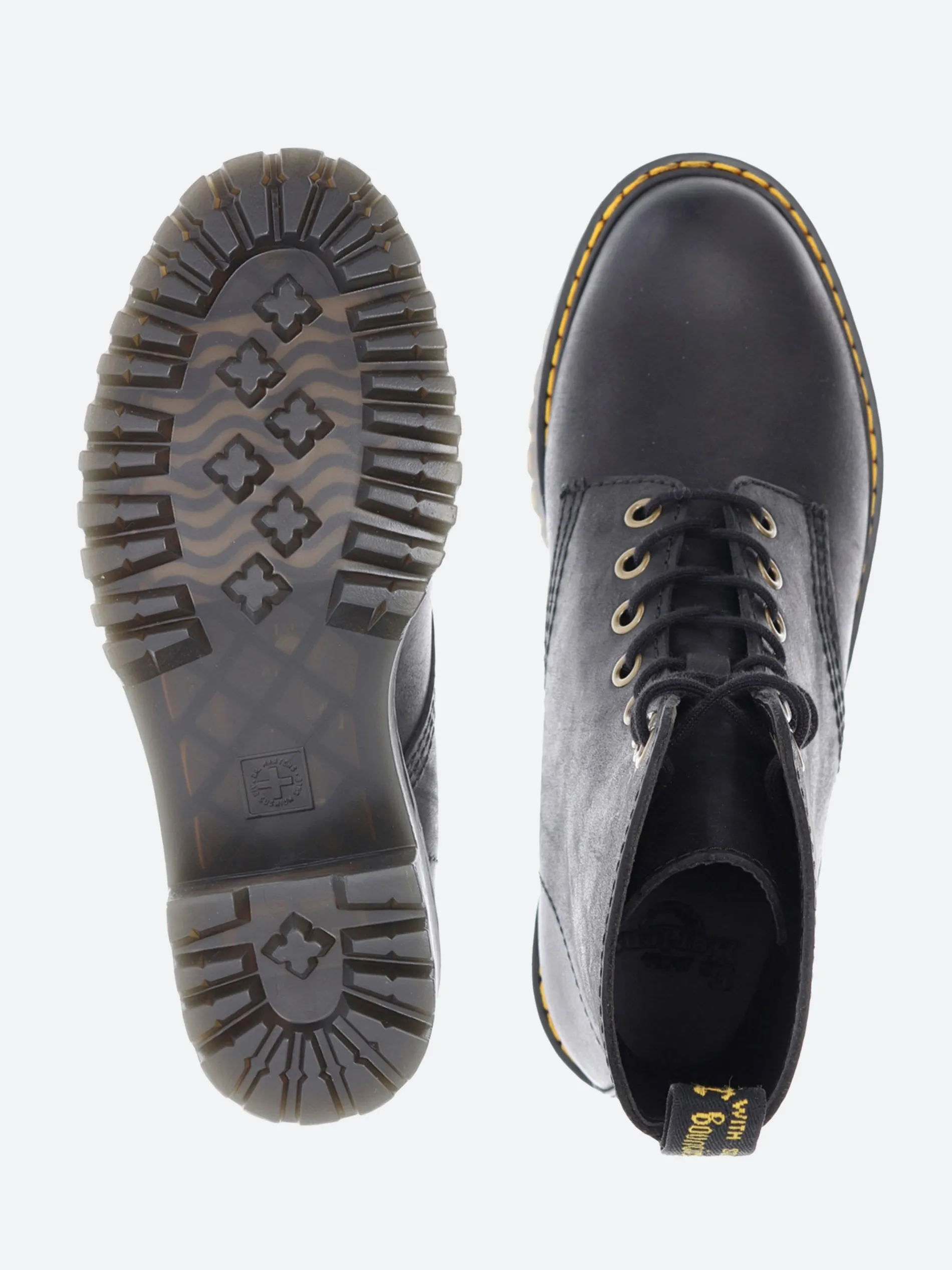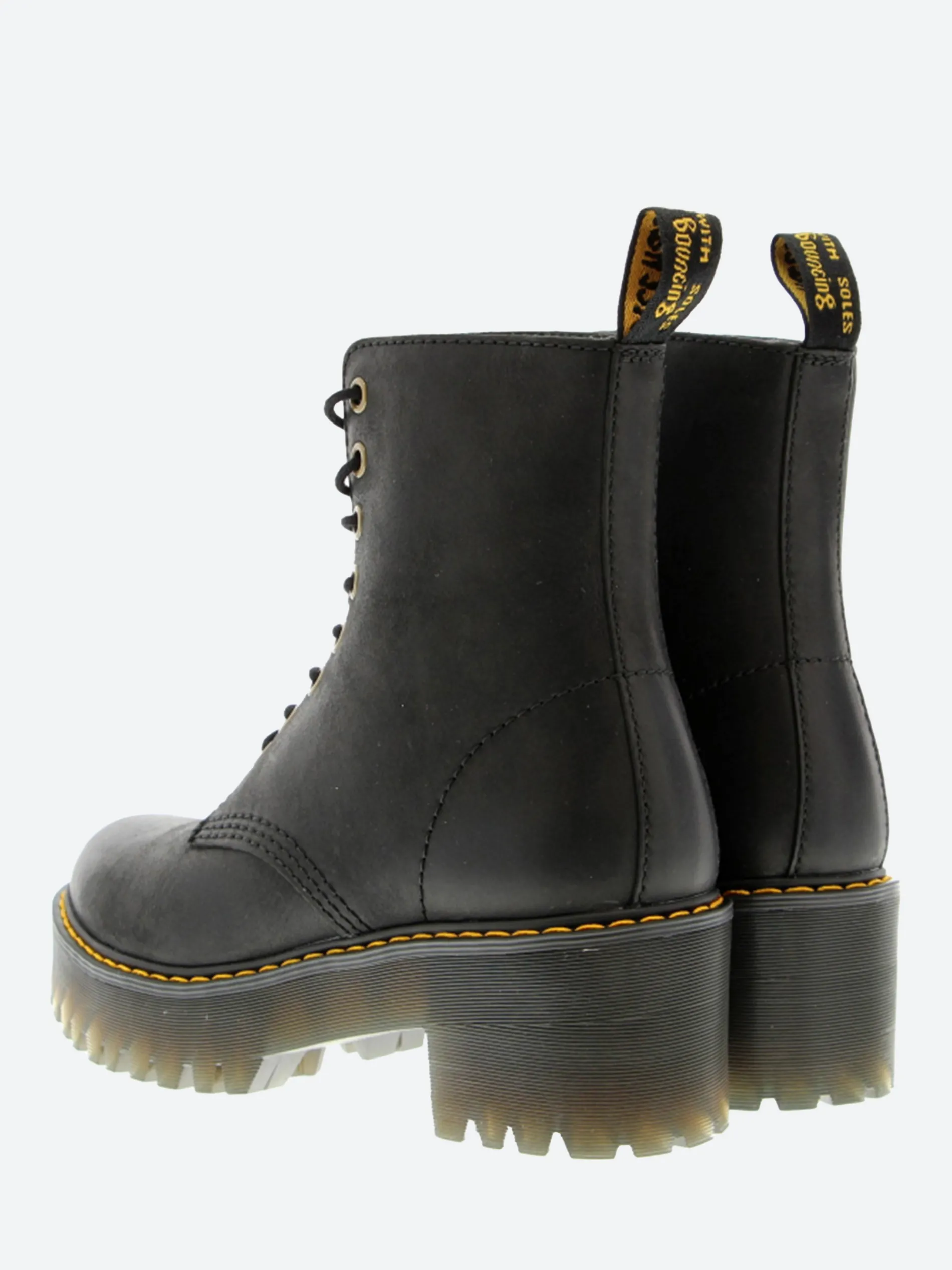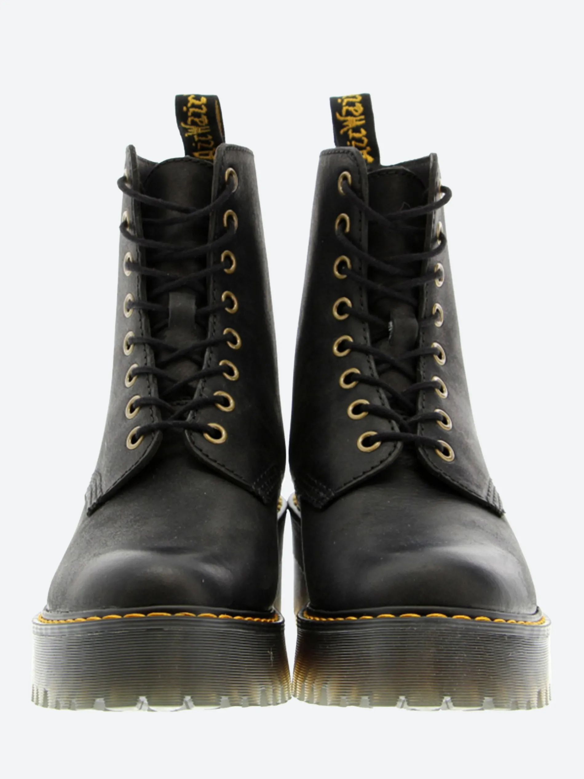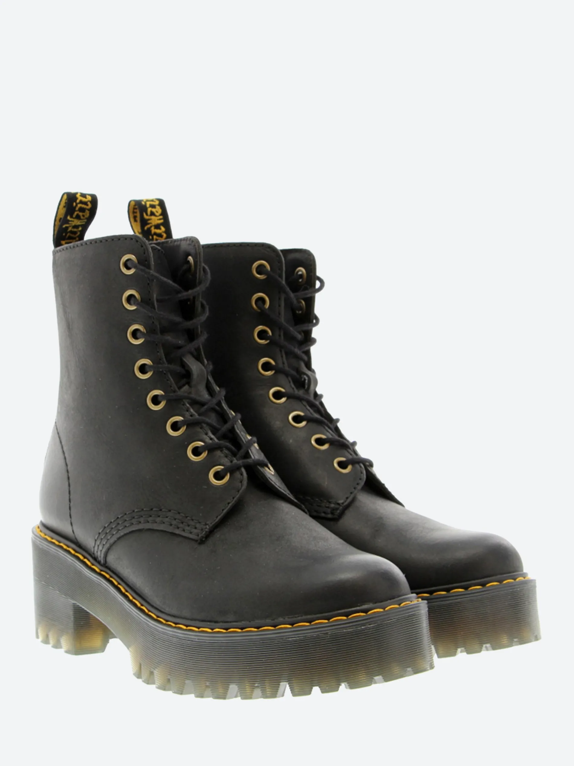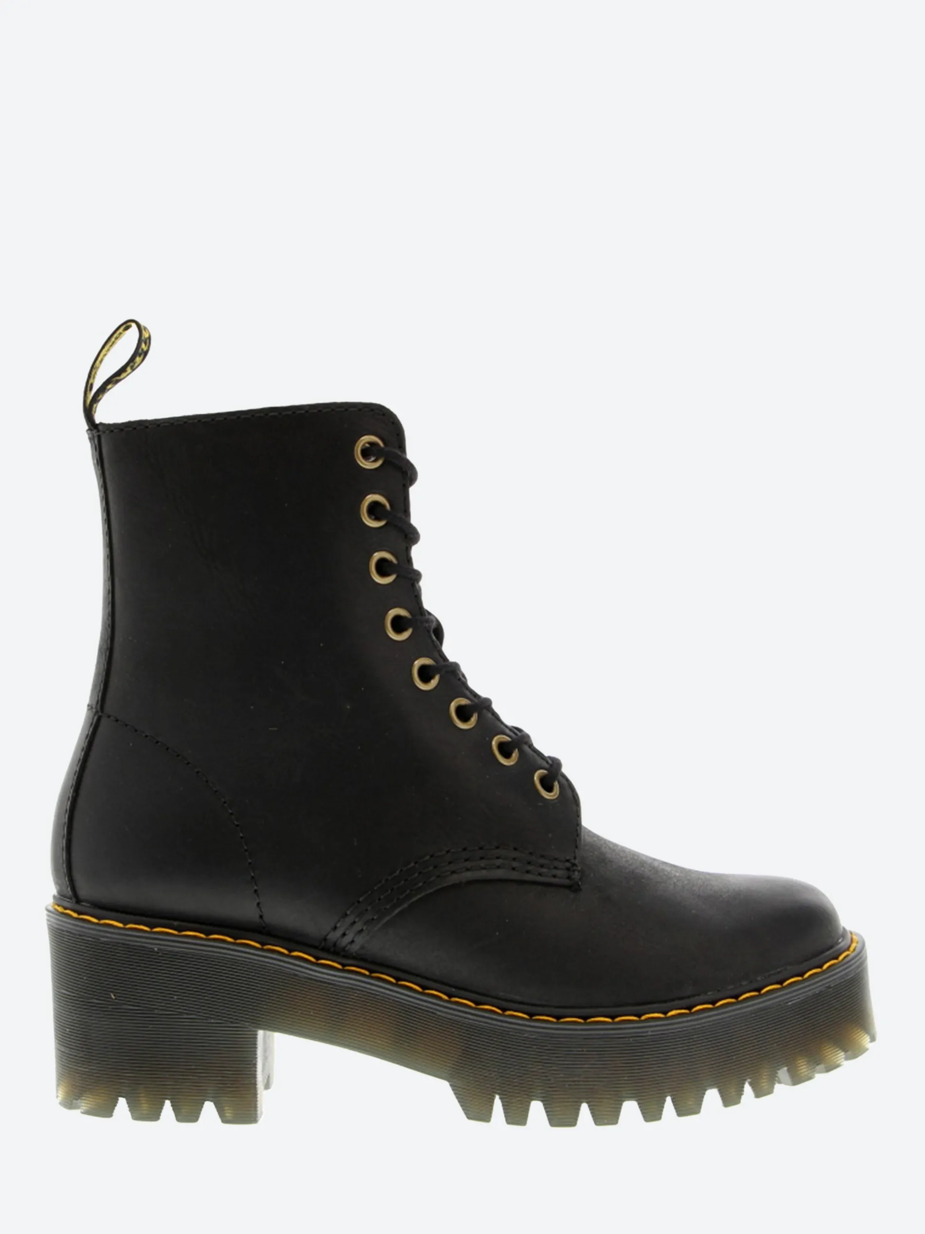 Dr. Martens Shriver is packed with rugged features: a commando tread, empowering platform sole with a chunky heel, antiqued brass eyelets and a sleek silhouette.