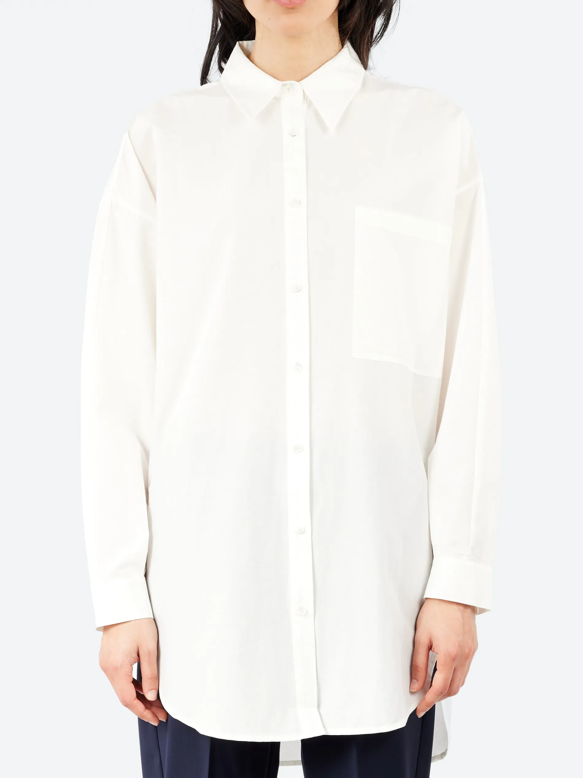 This Silk Laundry shirt is made from a silk-cotton blend, offering a soft, breathable feel. Designed for an oversized fit, it features a classic shirt collar, batwing sleeves for a relaxed silhouette, and a curved hemline with a longer back tail for added style. Finished with internal French seams for a polished finish.