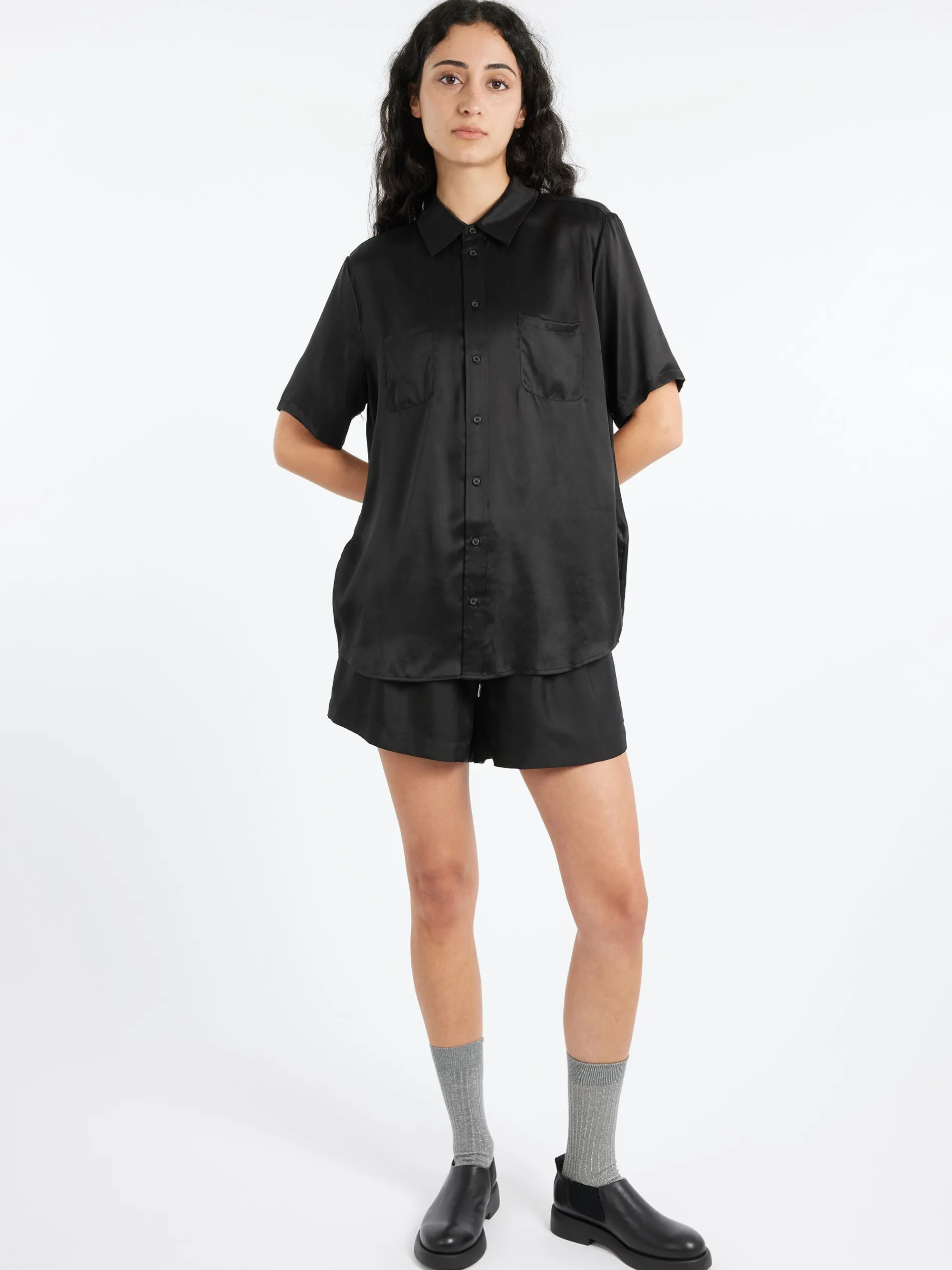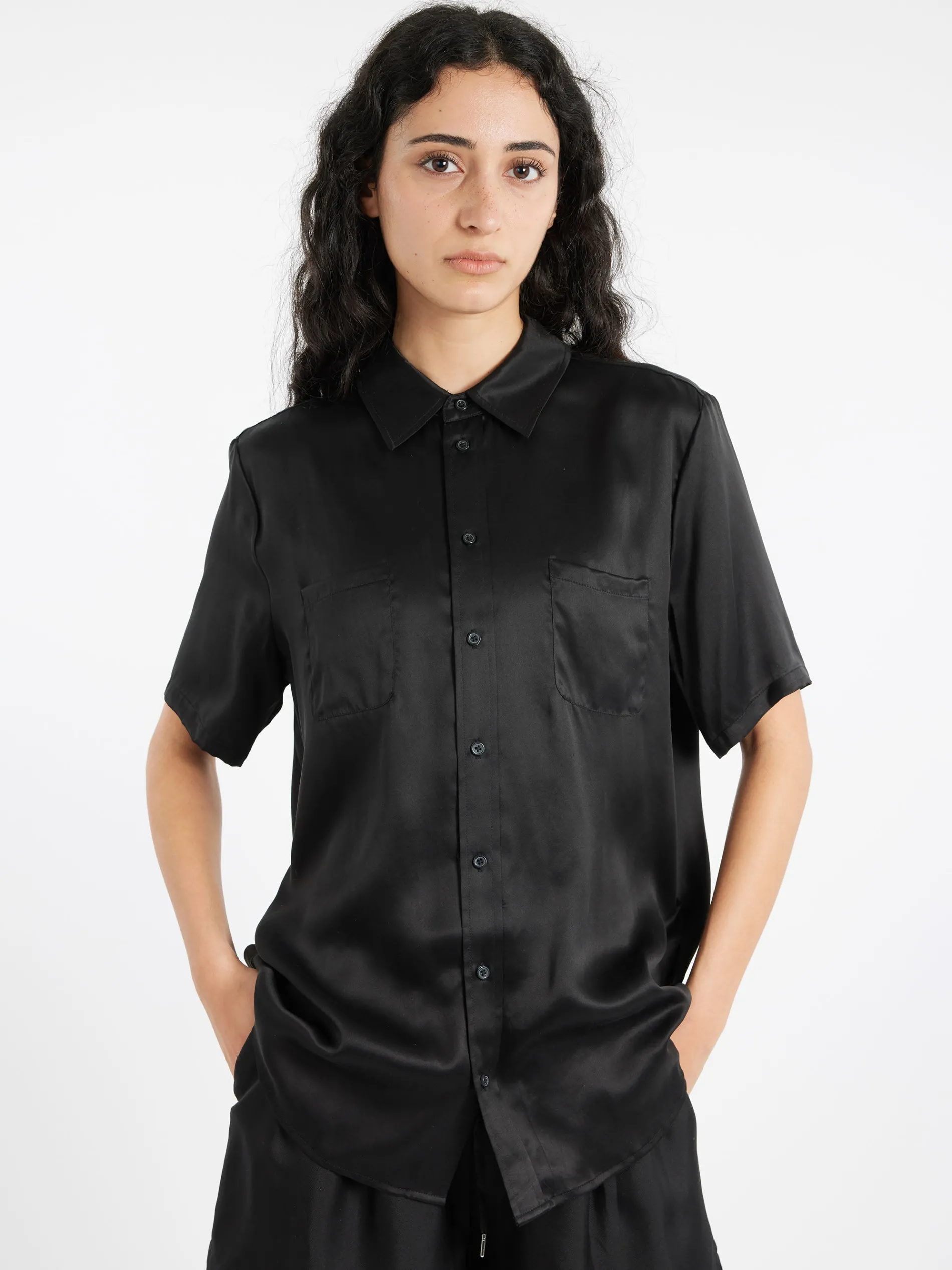 Silk Laundry short sleeve shirt crafted in 100% silk detailed with a button-down front and utility pockets. Designed to echo an original menswear style for a relaxed fit.