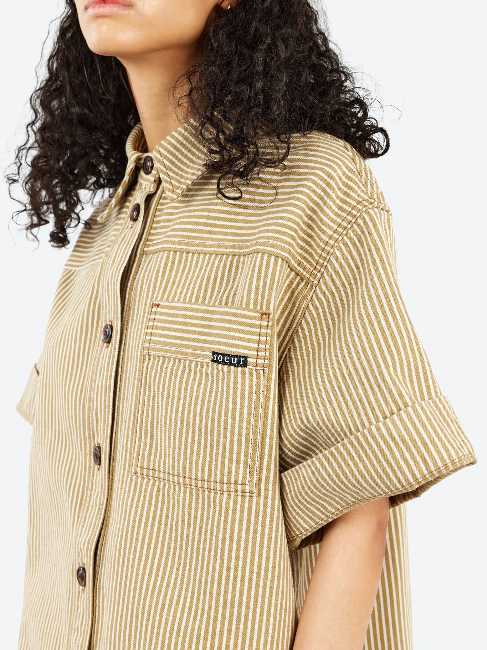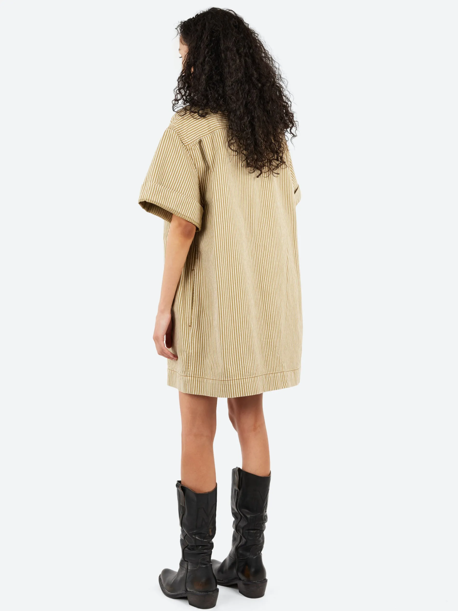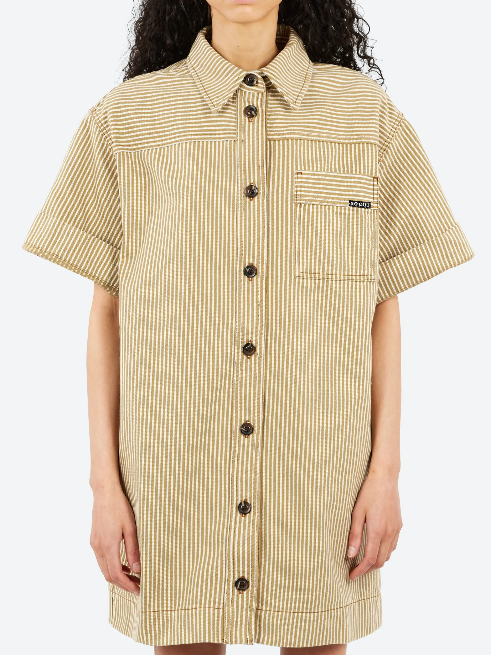 Soeur Anouk offers a timeless shirt style dress with a sharp collar and a functional front button placket. The wide, short sleeves add a relaxed, airy feel, perfect for warm weather or layering. It includes a single patch pocket on the front for a touch of practicality.
