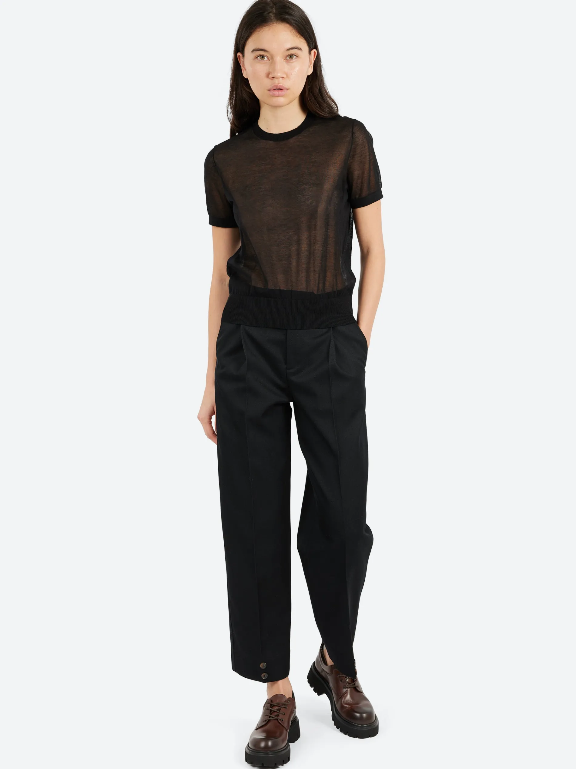 Soeur Dua features a straight cut with a tapered hem, short sleeves, and a round collar. Made from a sheer cotton knit, it offers a light, breathable feel with a subtle translucent texture.